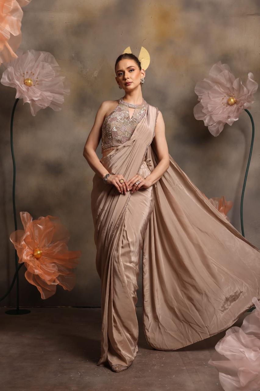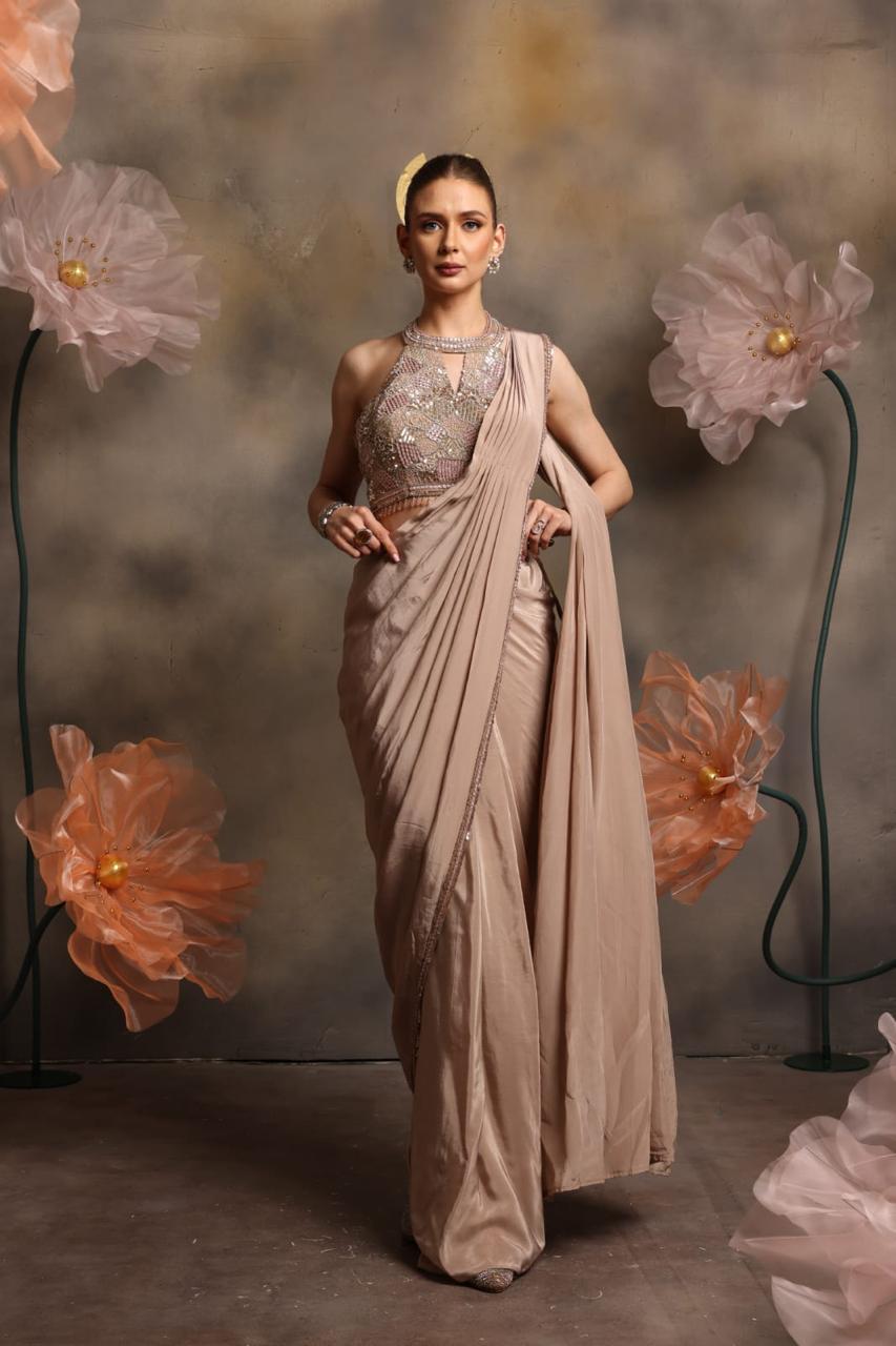 Minimalist yet striking, this saree in a refined nude beige tone is the epitome of understated elegance. The fluid drape is kept classic, with delicate pleats flowing seamlessly to the floor. Paired with a heavily embellished halter-style blouse, adorned with sequins, mirror work, and bead embroidery, it brings a perfect contrast of glamour to the subtlety of the drape. The overall look blends modern sophistication with timeless tradition, making it a versatile piece for elevated celebrations.