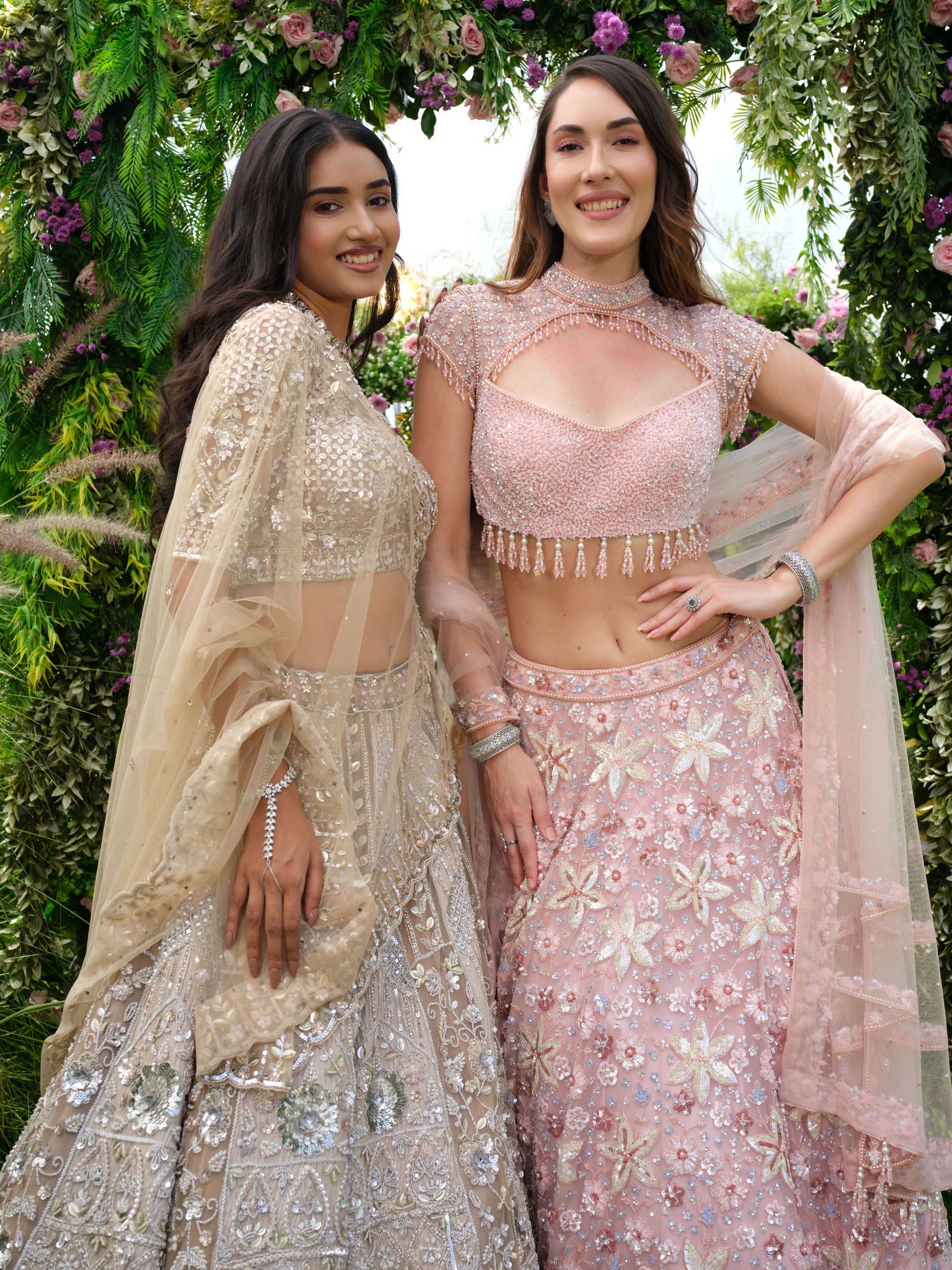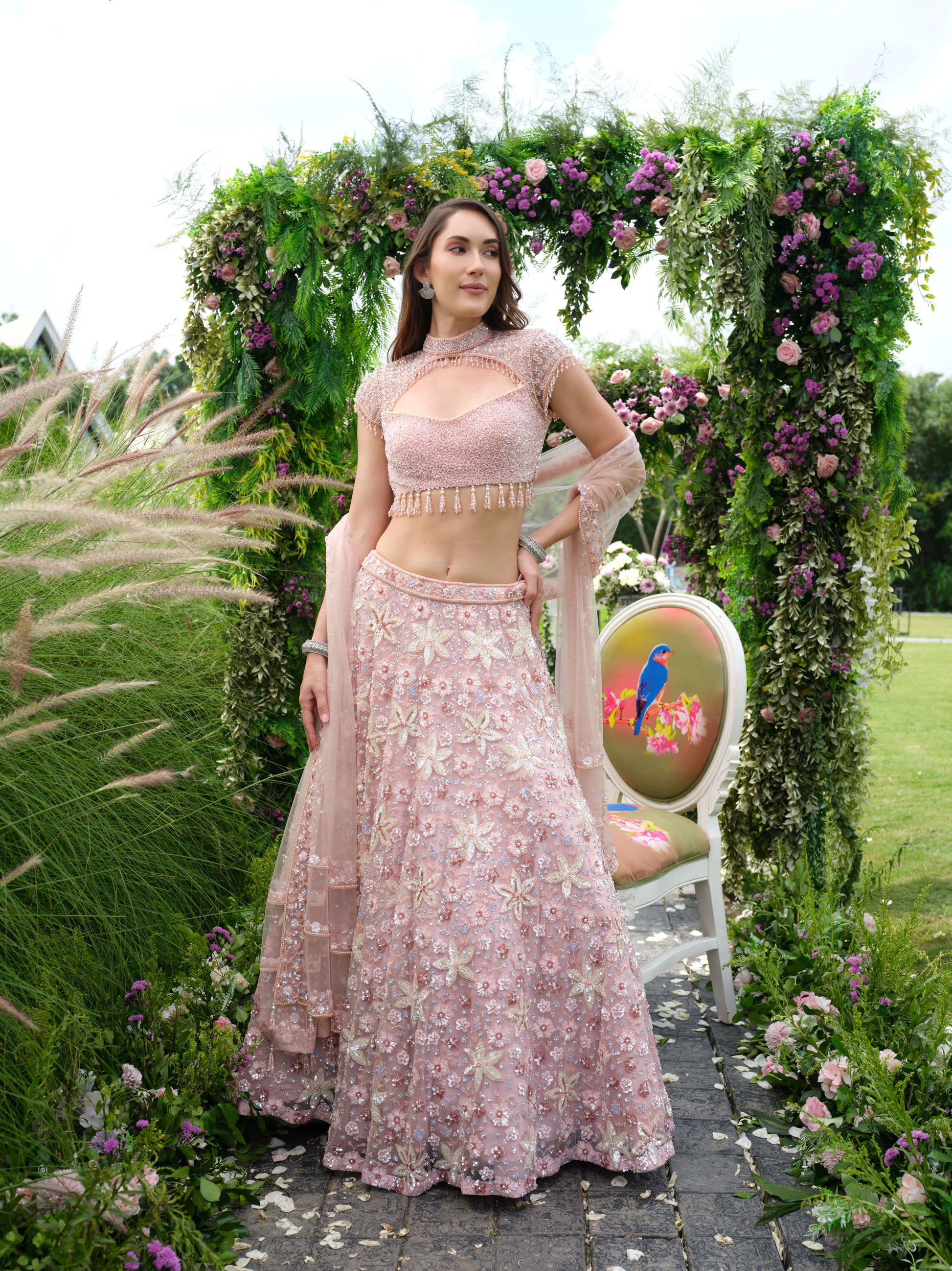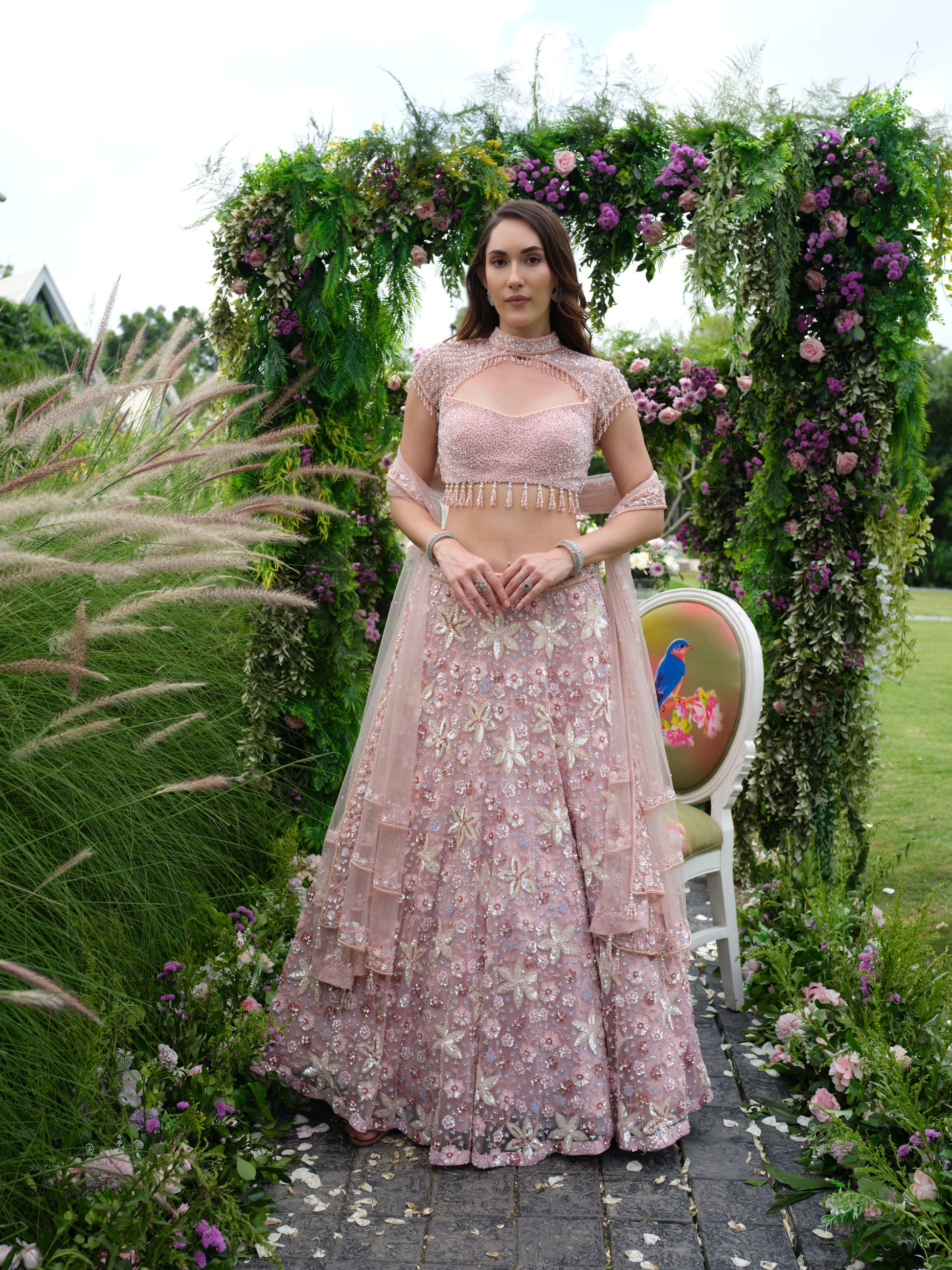 Embrace ethereal charm in this pastel pink lehenga, delicately embellished with floral embroidery and sparkling sequins. The blouse features a chic high-neck cut-out design with tassel detailing, paired with a soft net dupatta for a graceful finish. Perfect for engagements, receptions, and modern-day bridesmaids, this ensemble is the epitome of romantic elegance.