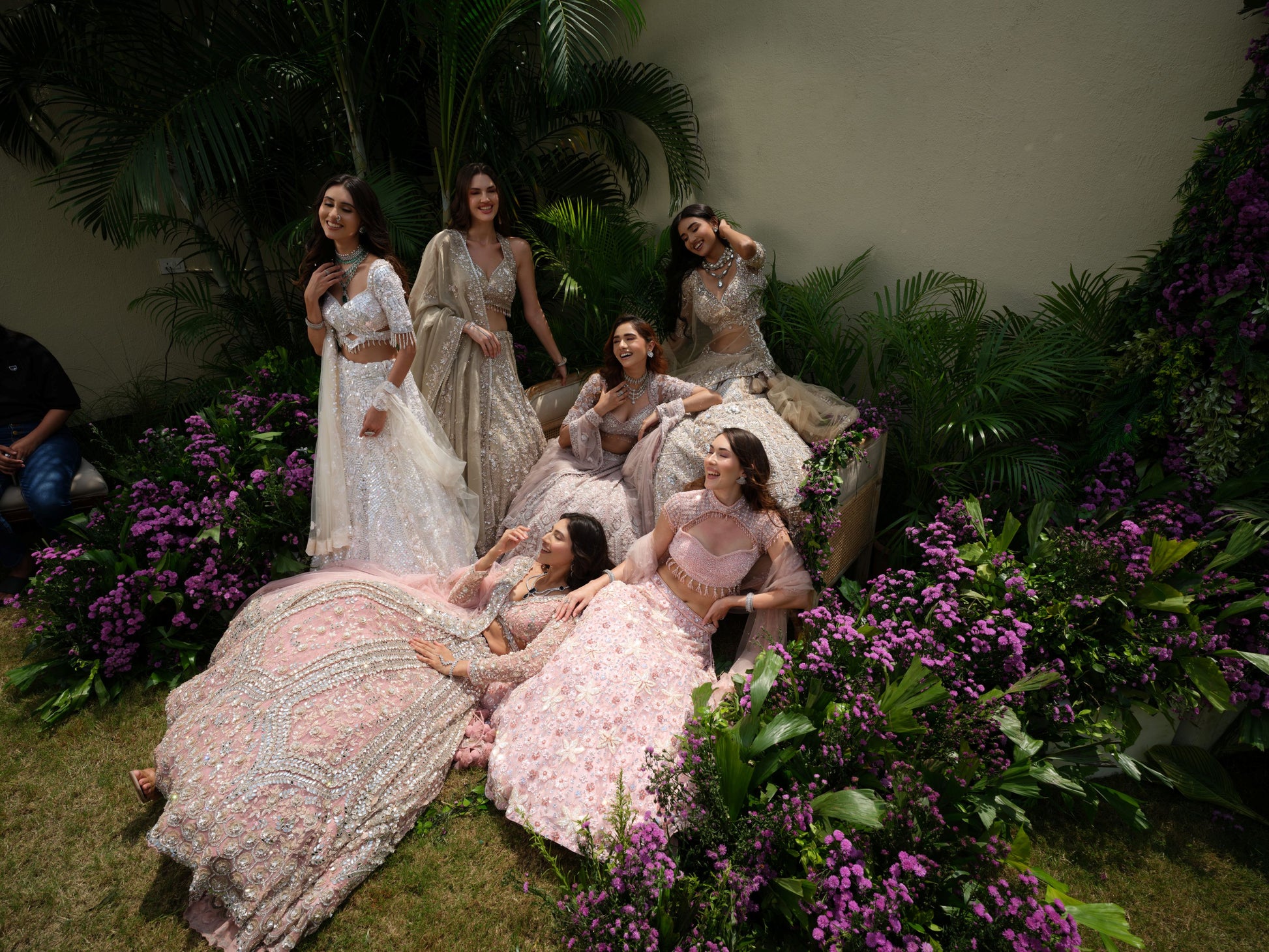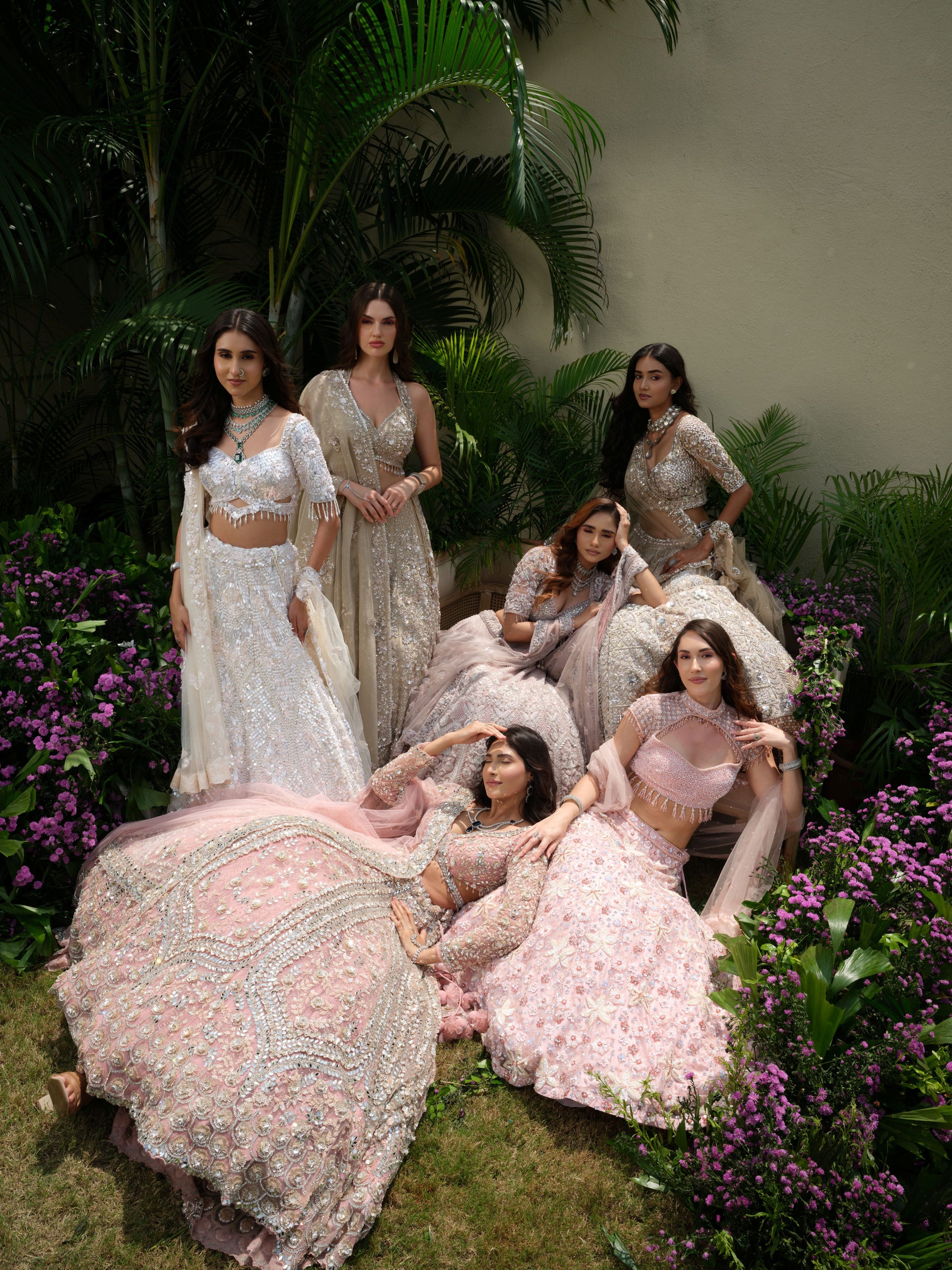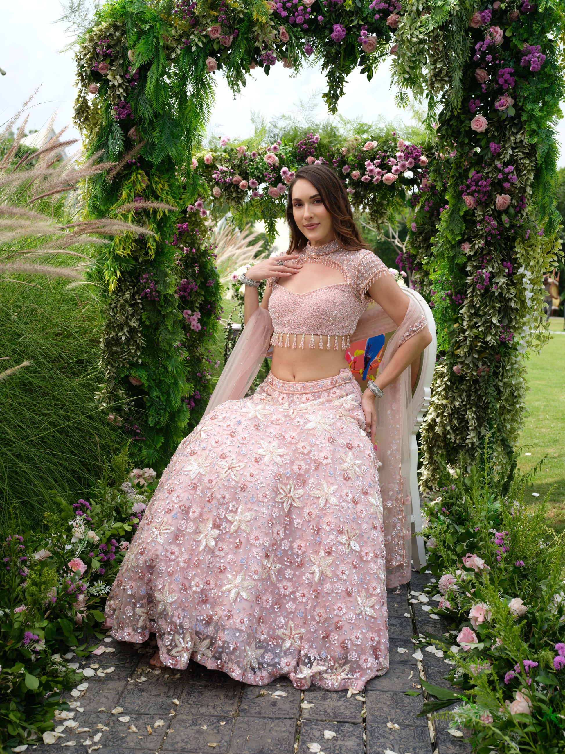 Embrace ethereal charm in this pastel pink lehenga, delicately embellished with floral embroidery and sparkling sequins. The blouse features a chic high-neck cut-out design with tassel detailing, paired with a soft net dupatta for a graceful finish. Perfect for engagements, receptions, and modern-day bridesmaids, this ensemble is the epitome of romantic elegance.