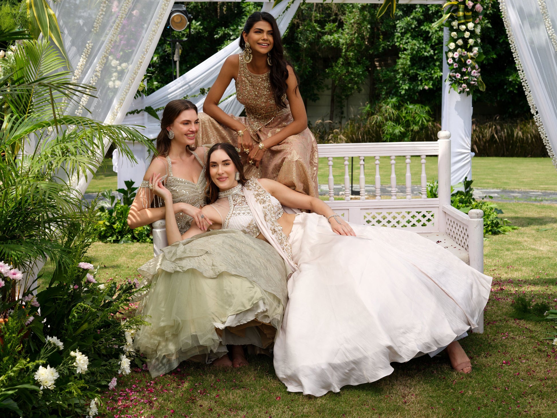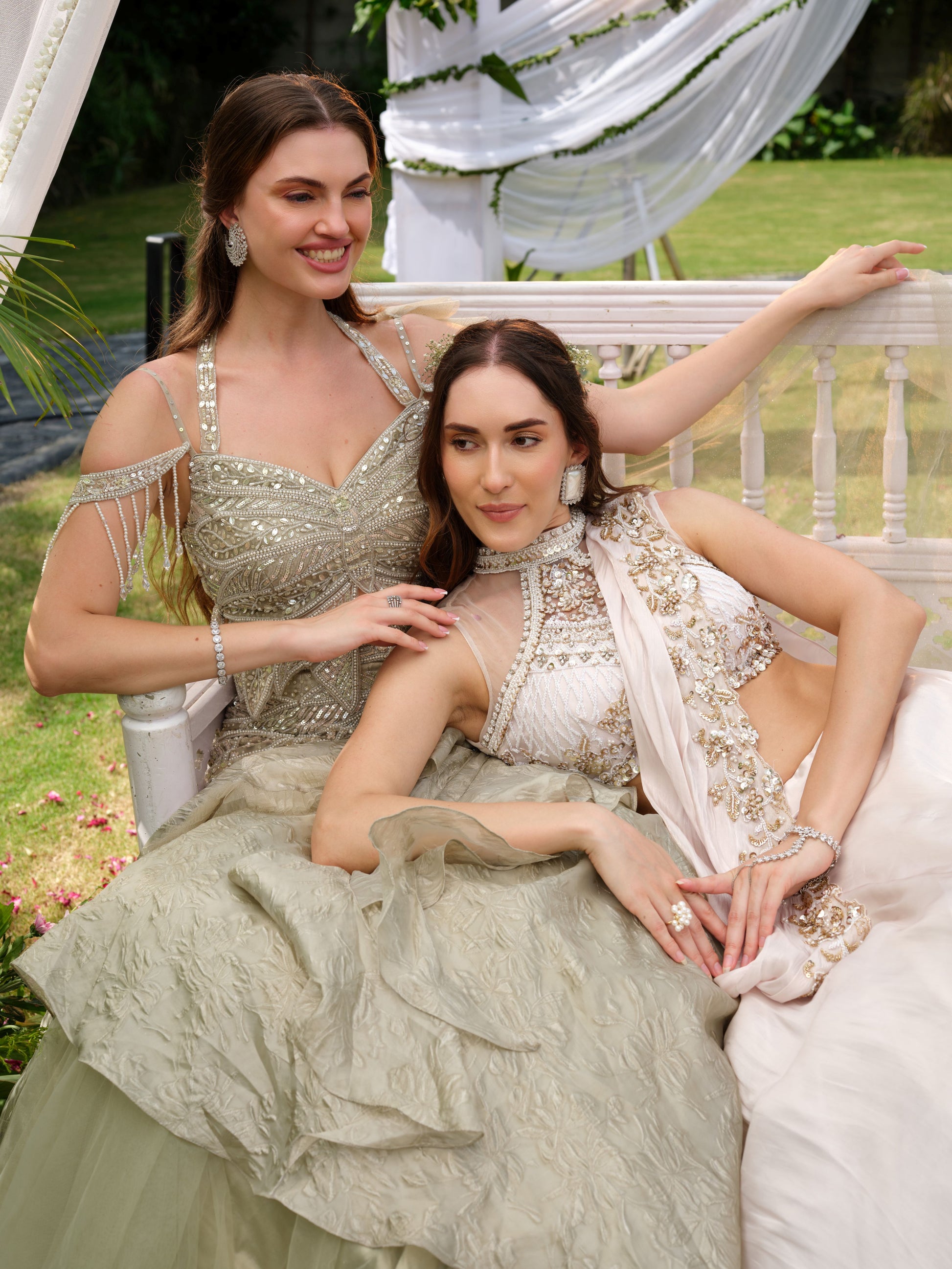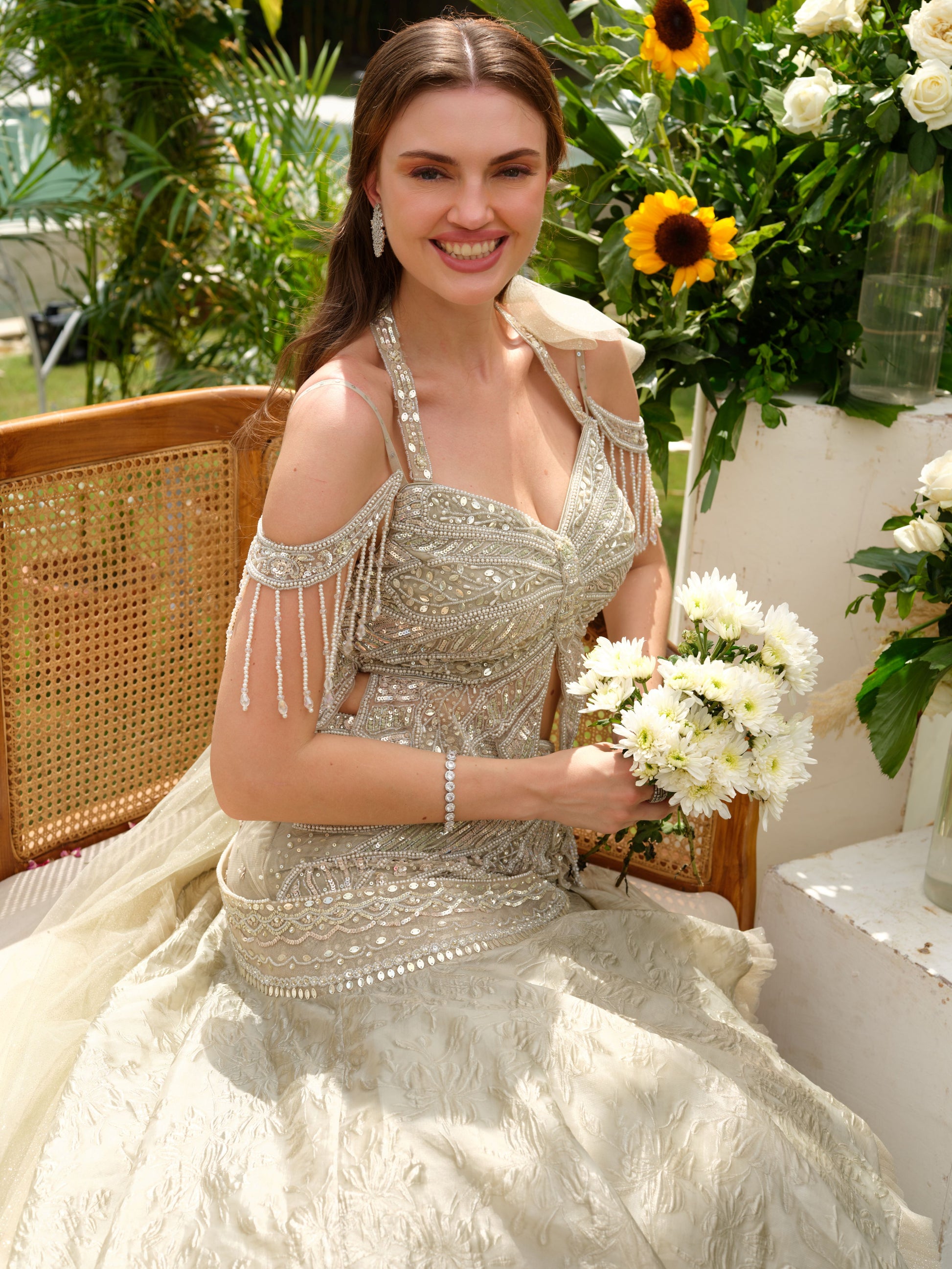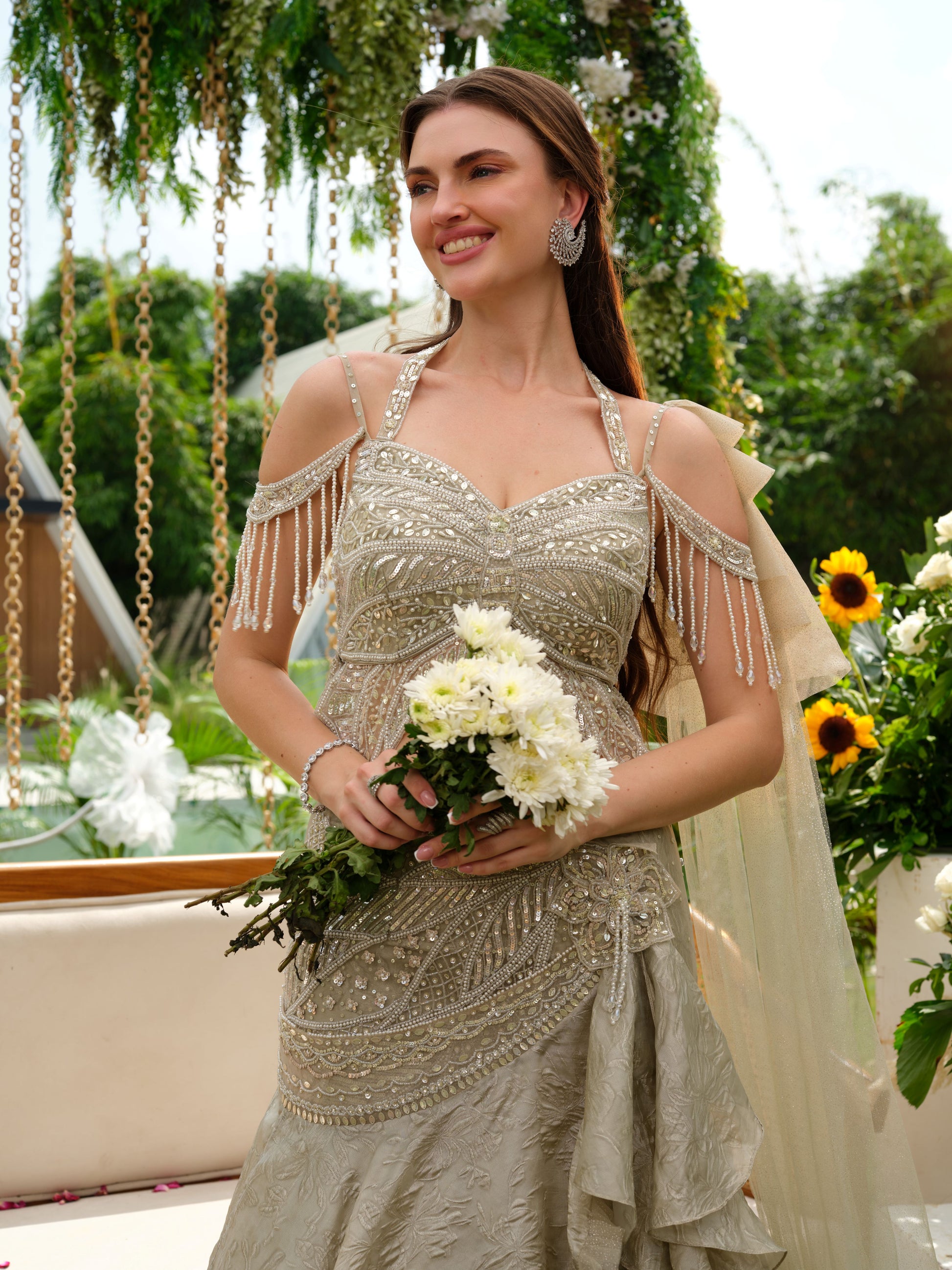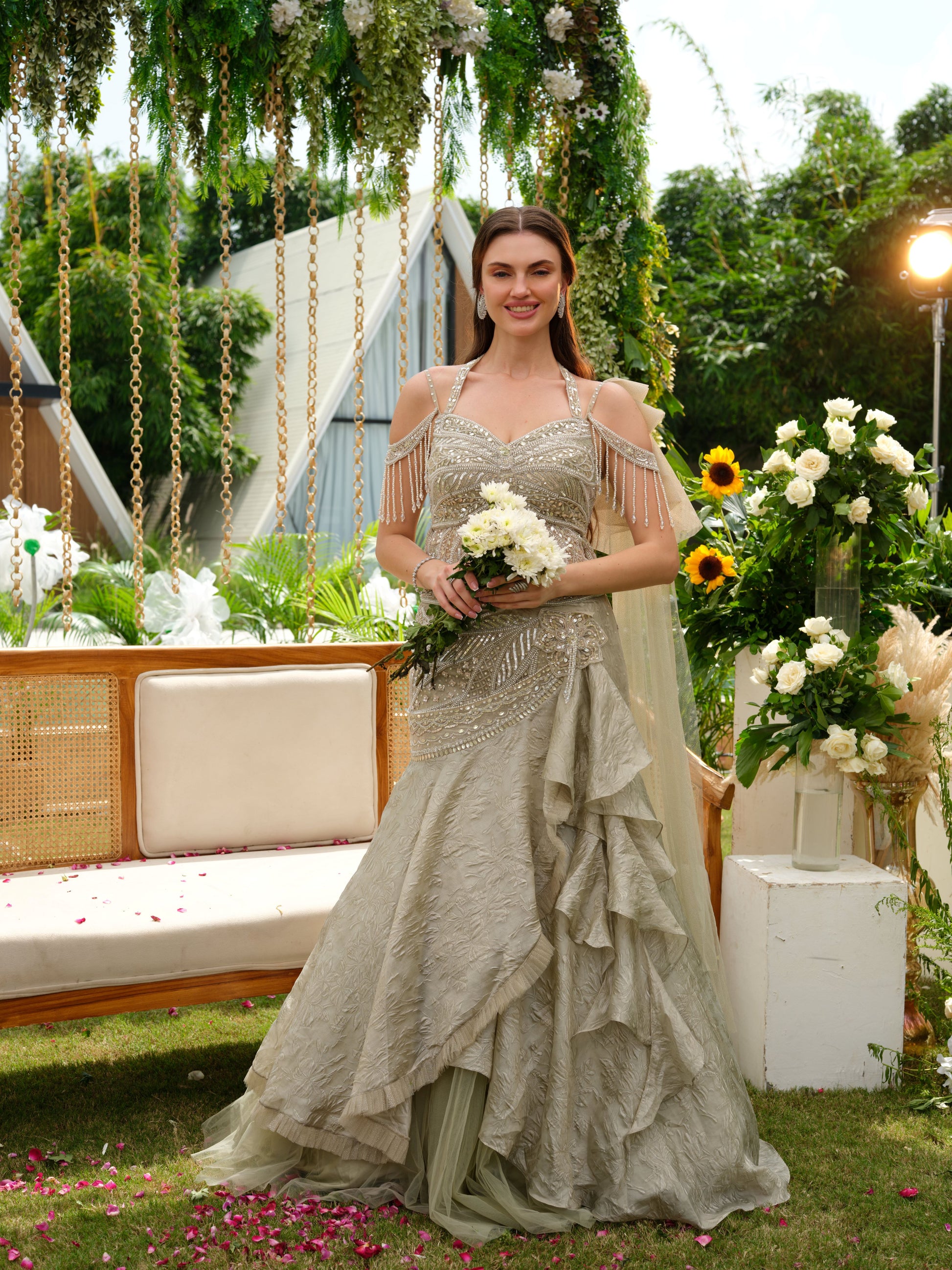 Grace meets grandeur in this champagne beige gown, designed for the modern-day diva. The bodice is intricately embellished with delicate bead and sequin work, while the cascading ruffle layers on the skirt add a touch of dramatic flair. The off-shoulder detailing with fringed sleeves lends a contemporary edge, making it the perfect statement ensemble.