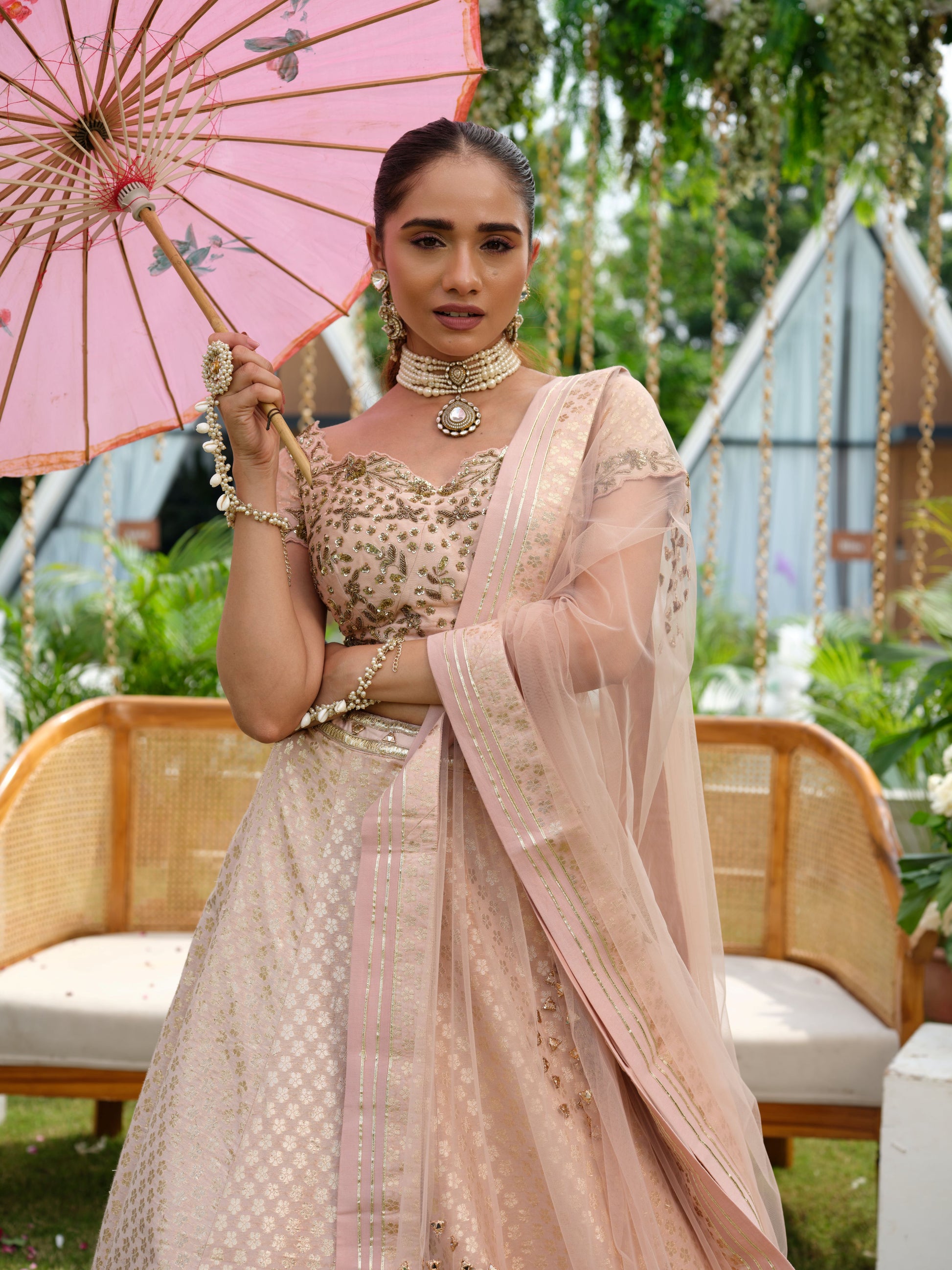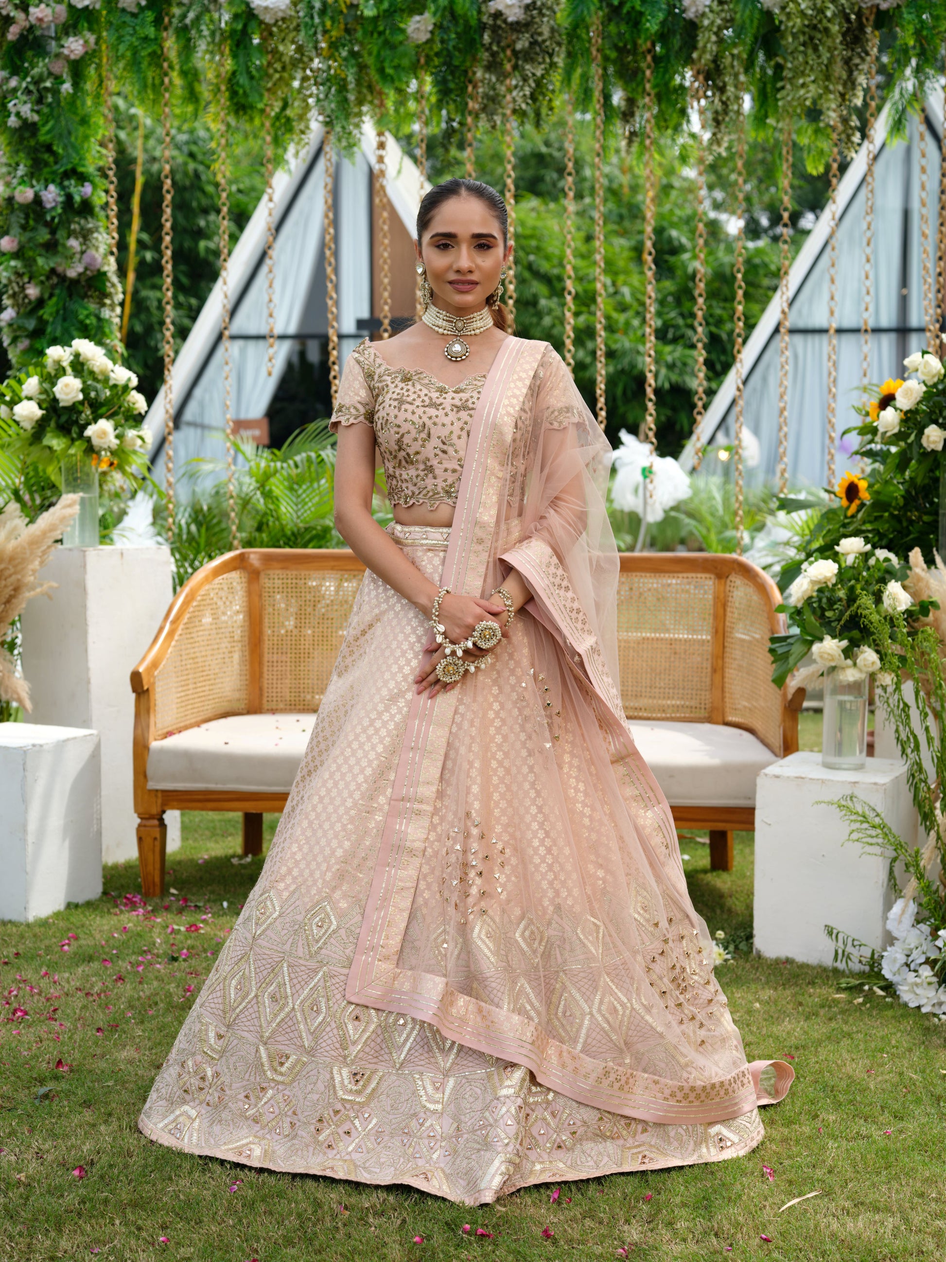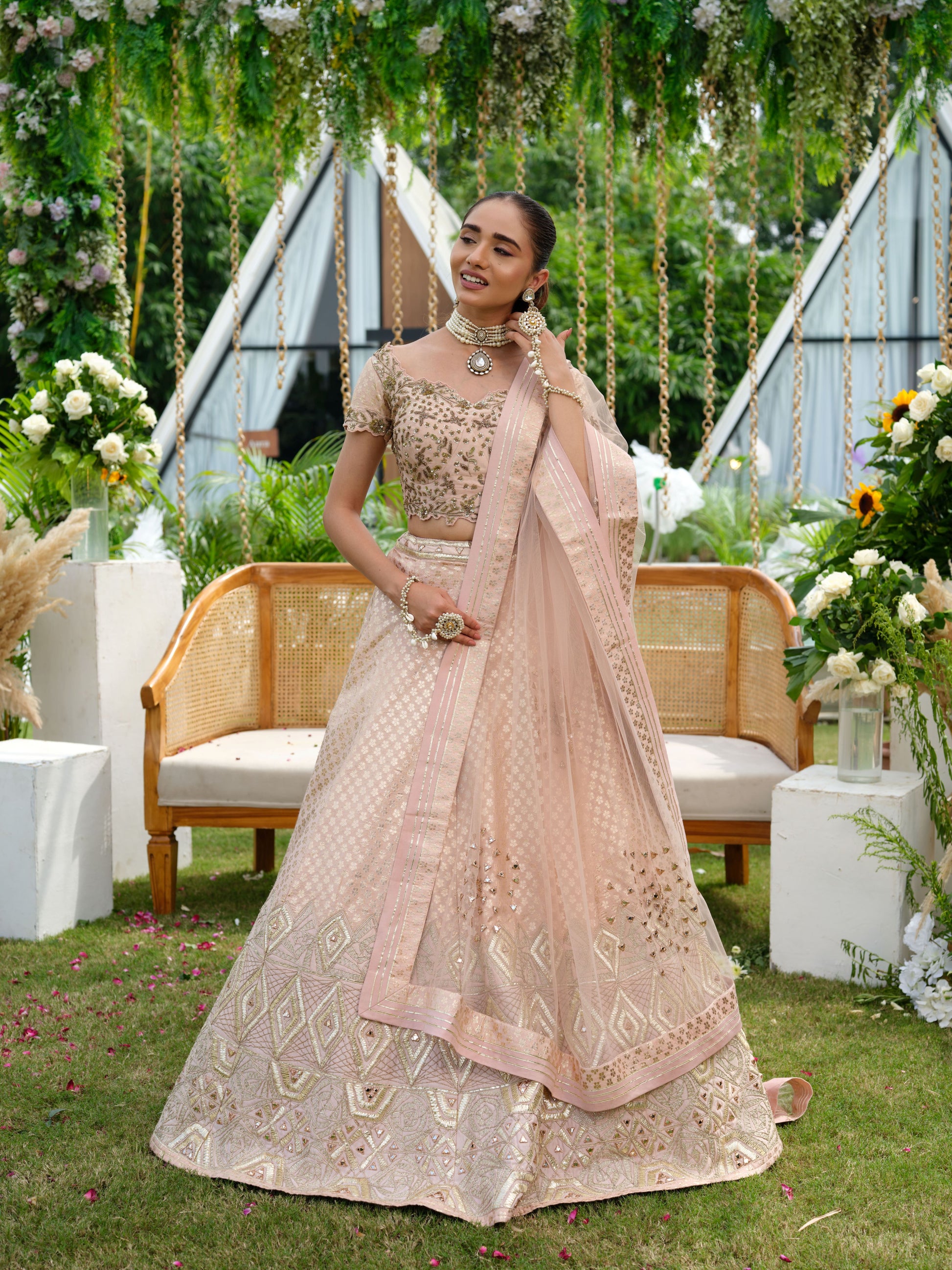 Sophisticated and timeless, this blush pink lehenga set is crafted with delicate artistry and modern finesse. The lehenga showcases intricate geometric zari and sequin embroidery, while the blouse is adorned with elegant floral motifs that exude charm. A sheer dupatta with subtle mirror work and finely detailed borders completes the ensemble with grace.