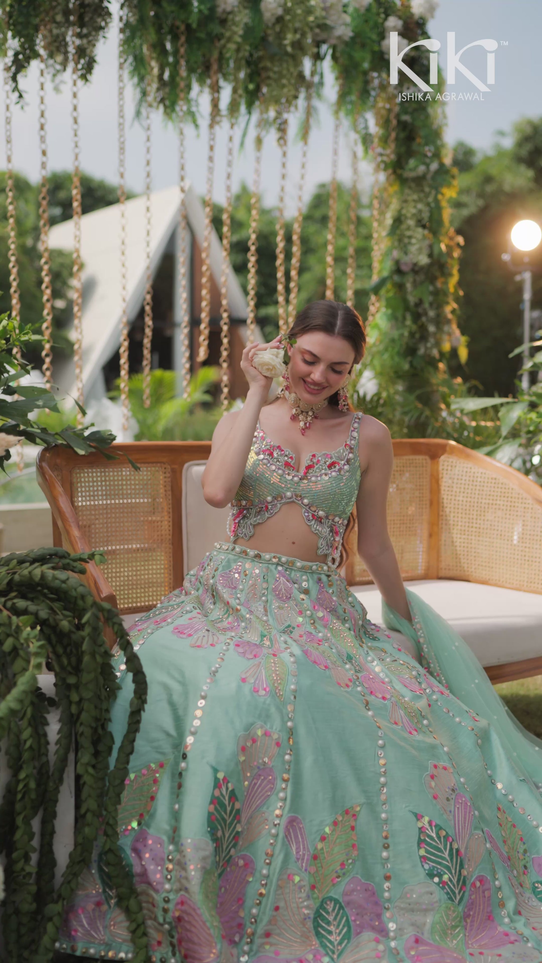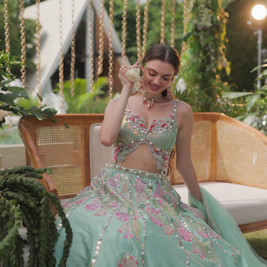A refreshing aqua green lehenga adorned with pastel pink and lilac floral embroidery, enhanced with mirror work and delicate bead embellishments. The blouse features a modern cut with a scalloped hem and thin straps, giving it a chic, youthful appeal. The voluminous skirt flows gracefully with scattered floral motifs, making it playful yet elegant. Paired with minimal jewellery, this look is fresh, radiant, and contemporary.