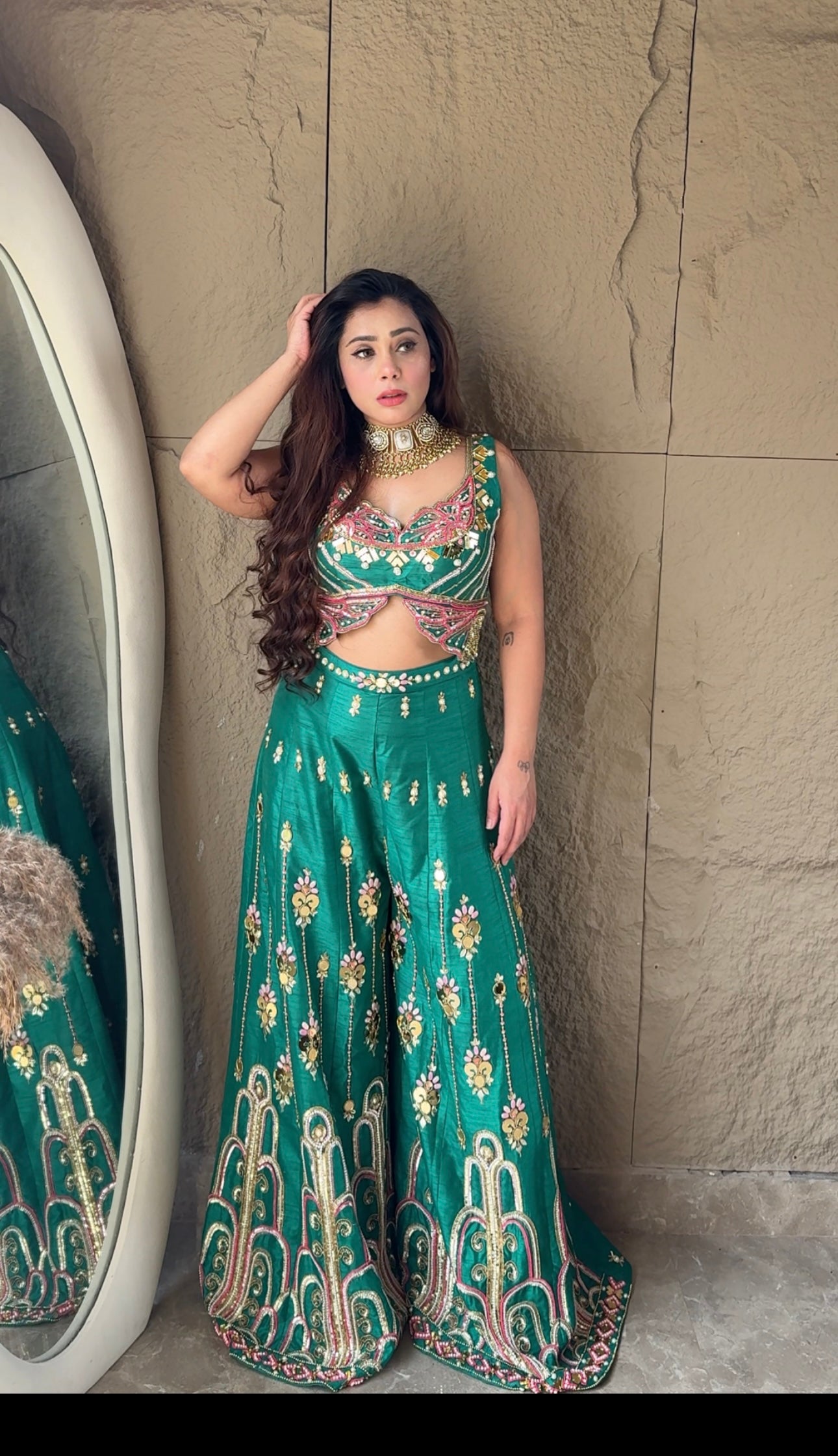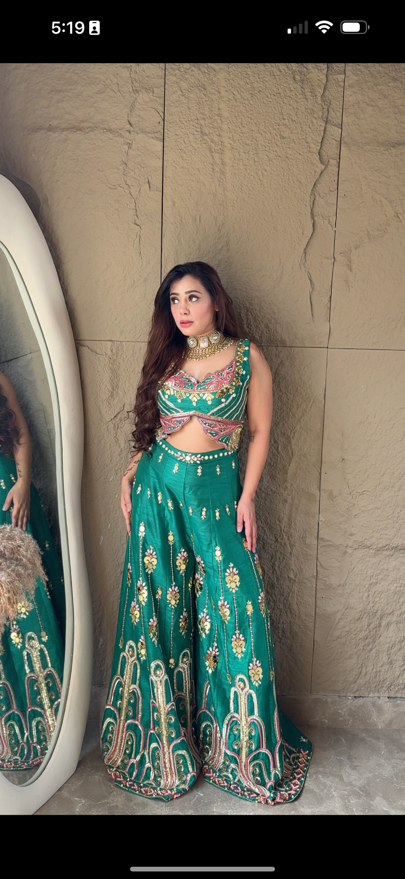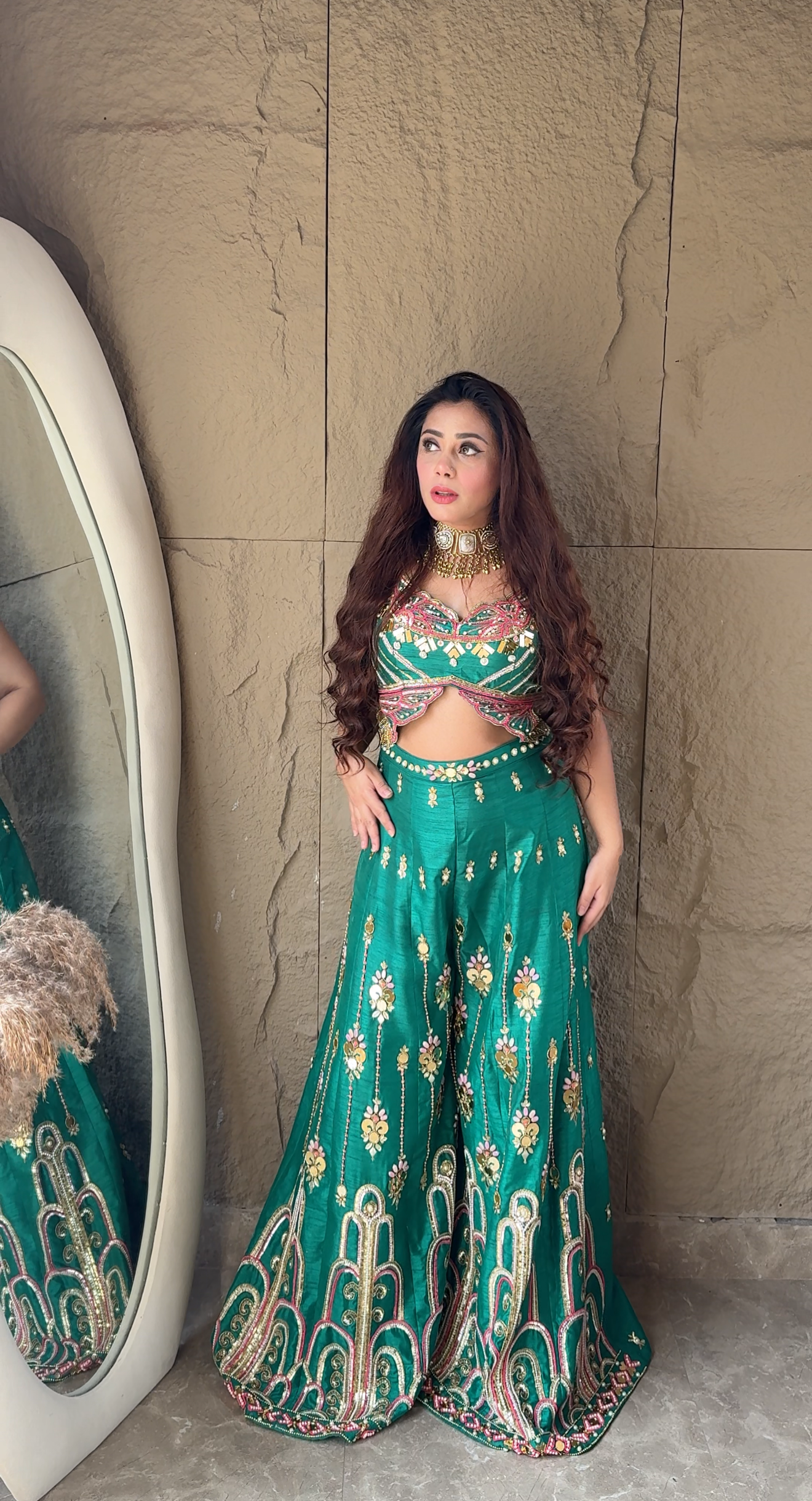 A stylish Indo-western ensemble featuring a sleeveless crop top with a front cut-out and intricate hand embroidery. Paired with wide-legged palazzo pants adorned with traditional floral and geometric motifs. Crafted from a premium satin-silk blend, this outfit blends elegance with comfort, making it a standout festive choice.