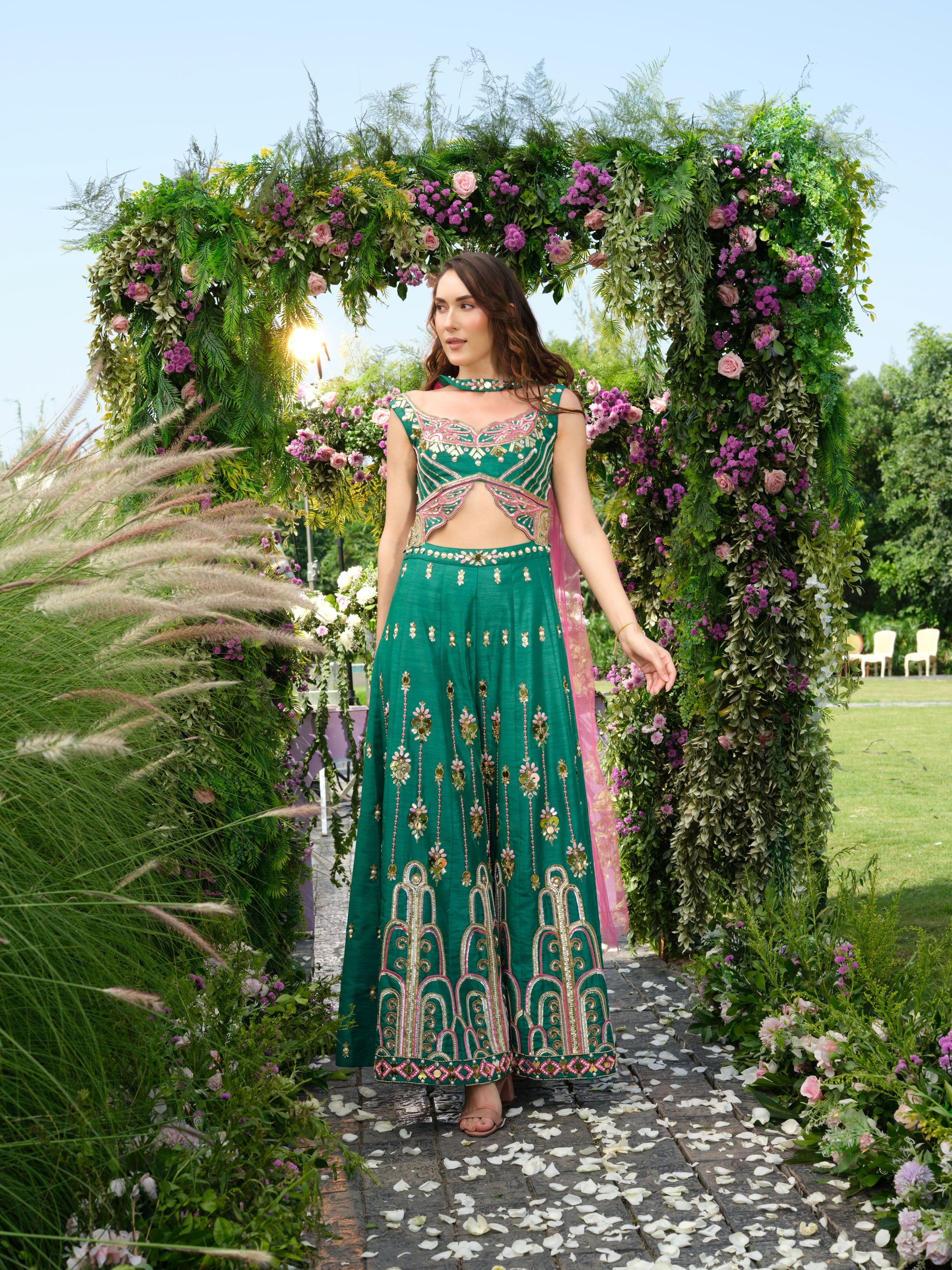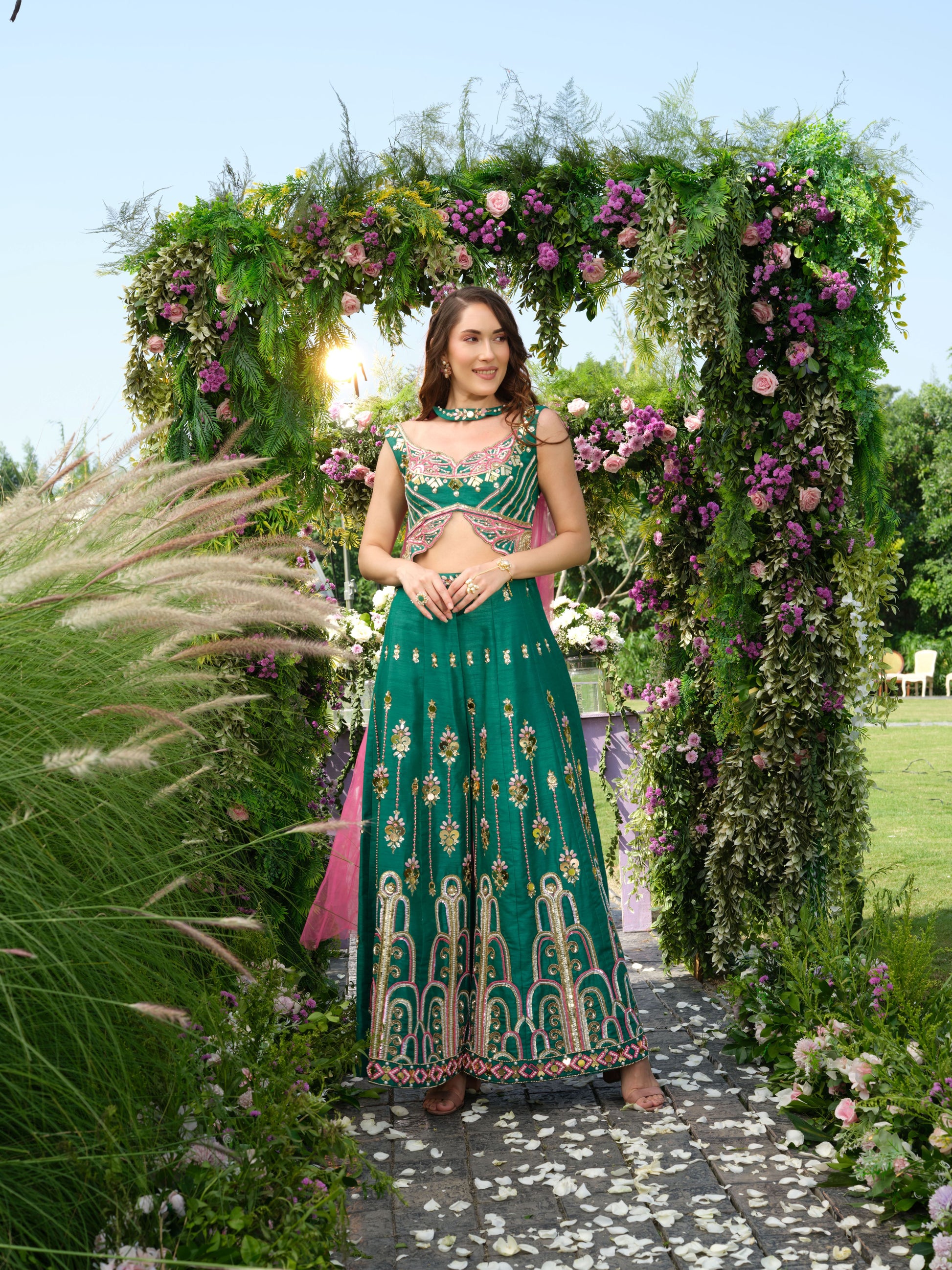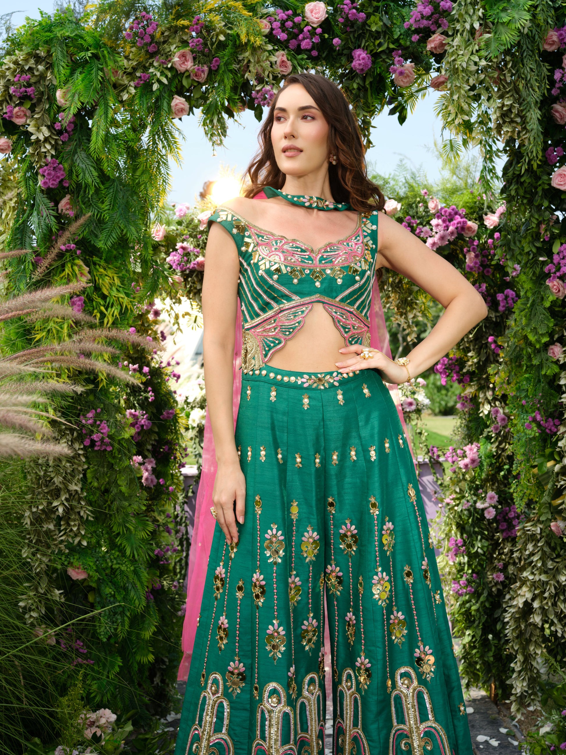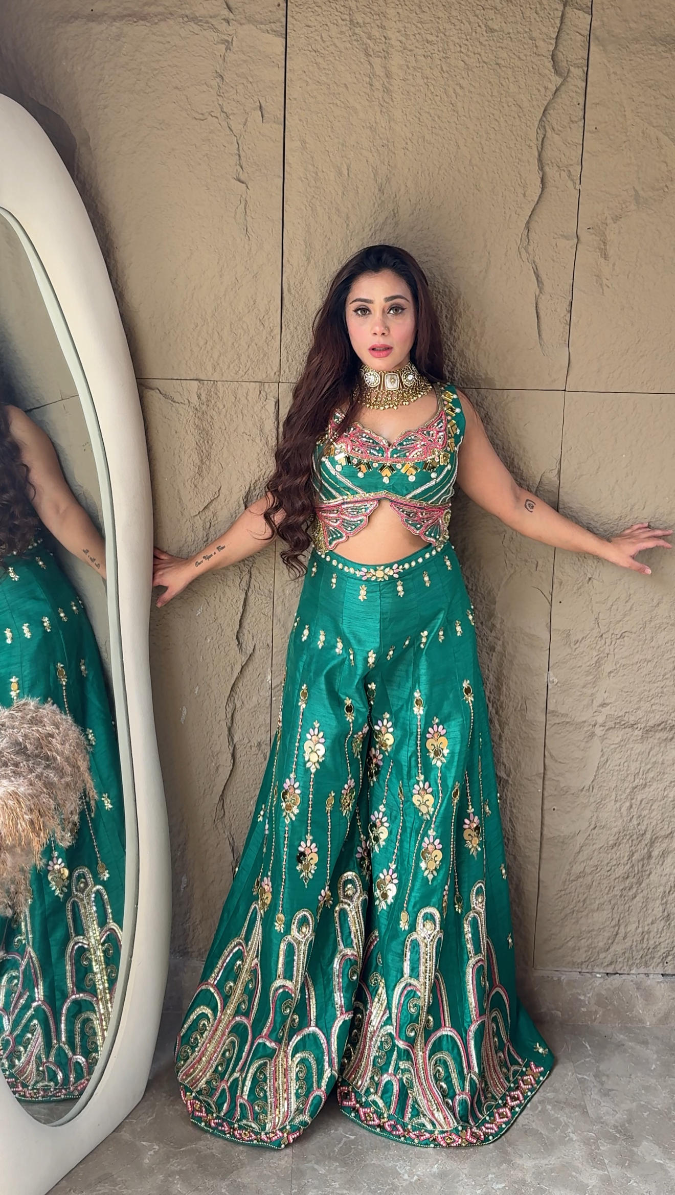 A stylish Indo-western ensemble featuring a sleeveless crop top with a front cut-out and intricate hand embroidery. Paired with wide-legged palazzo pants adorned with traditional floral and geometric motifs. Crafted from a premium satin-silk blend, this outfit blends elegance with comfort, making it a standout festive choice.