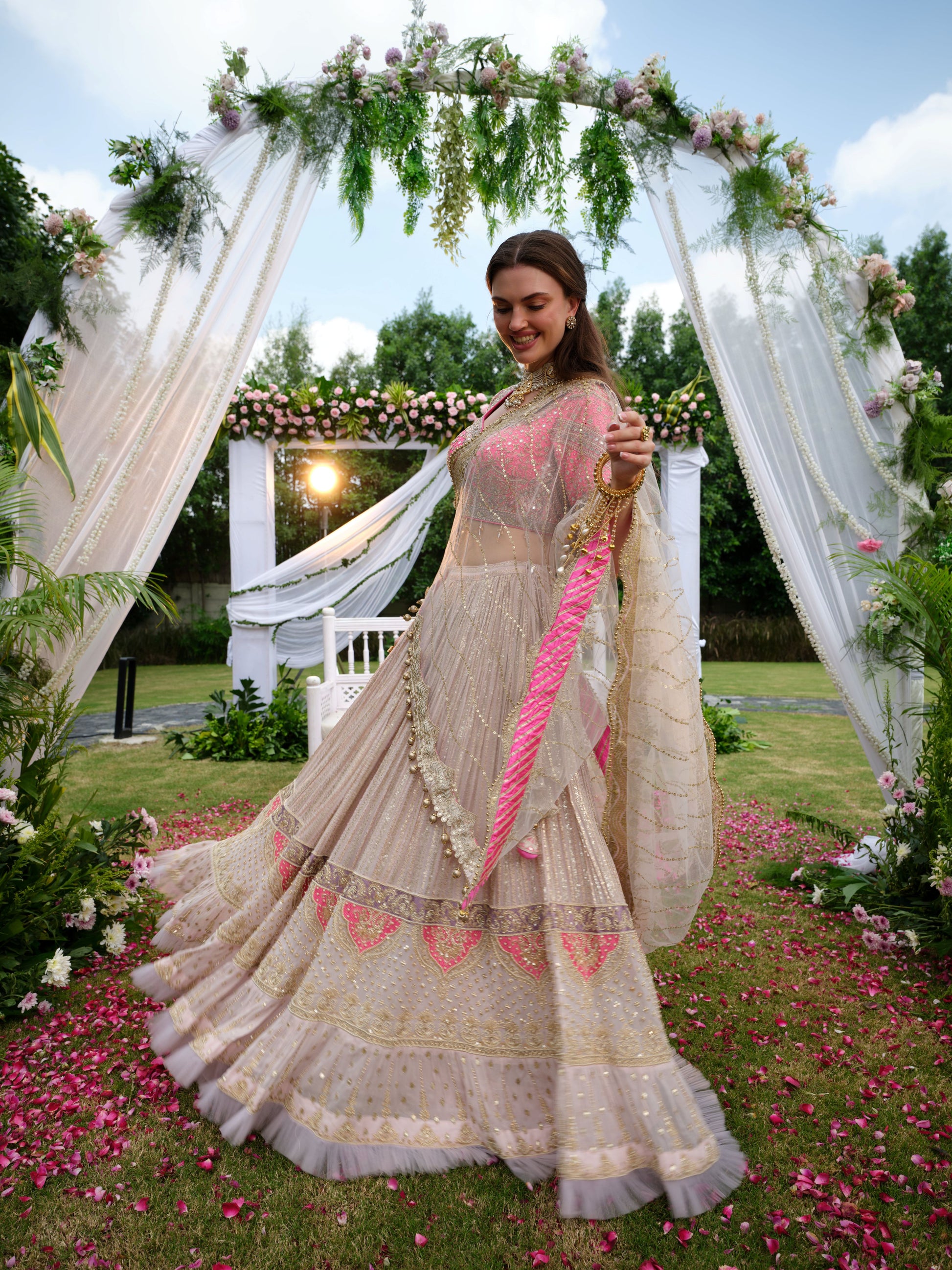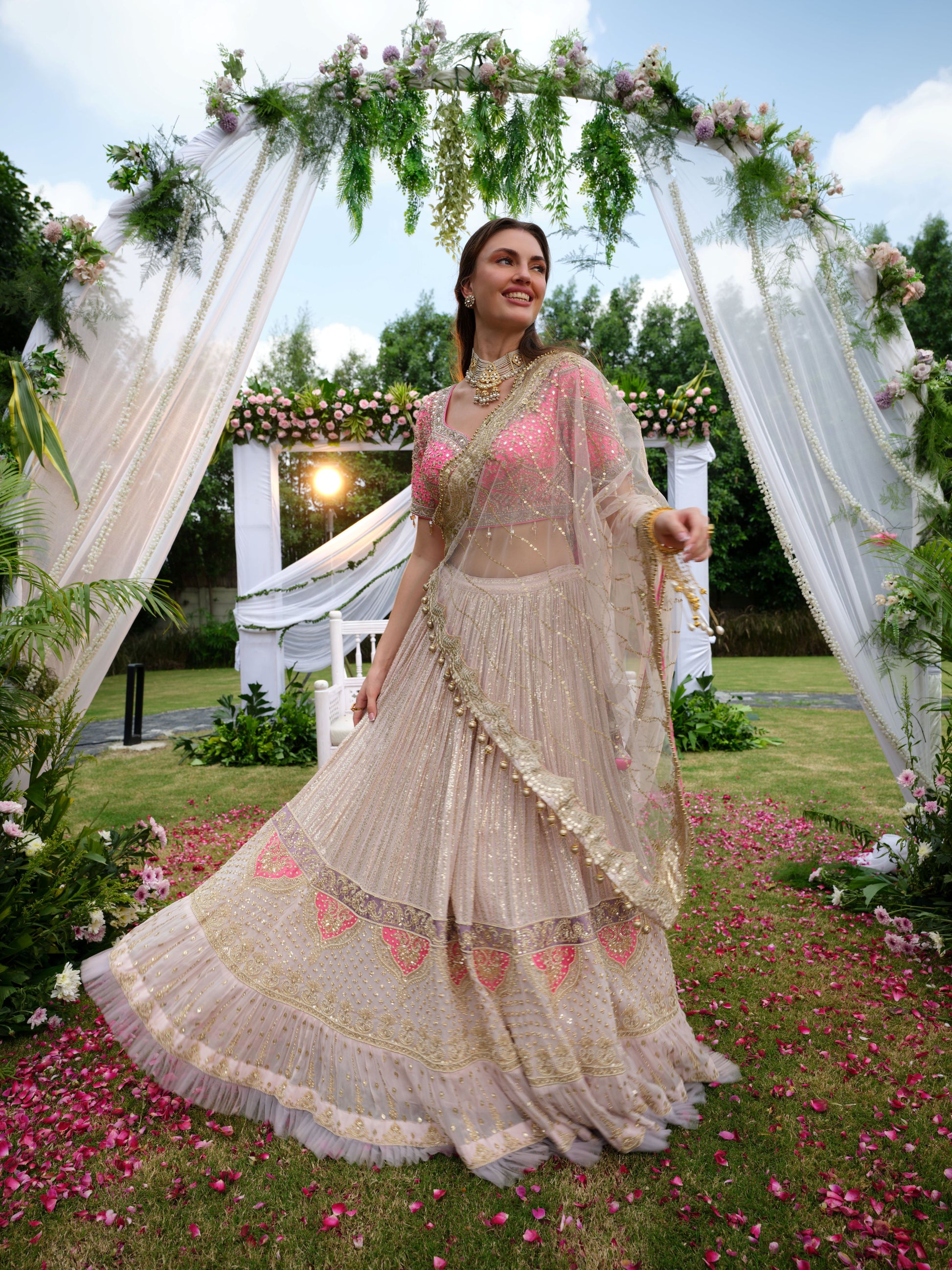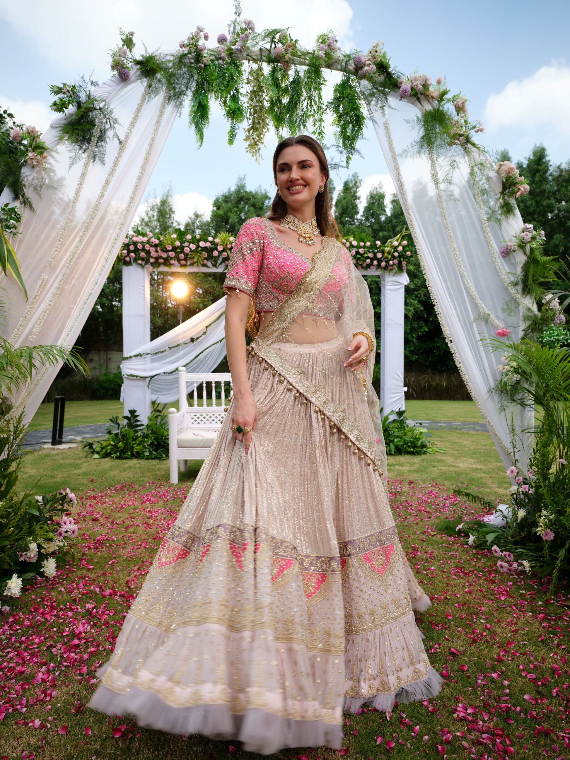 A graceful ivory beige Lehenga enriched with intricate embroidery and pastel pink highlights along the borders and blouse. The delicate threadwork and subtle shimmer add a refined elegance, while the contrasting pink blouse with floral detailing elevates the look. Draped in timeless sophistication, this lehenga is a perfect balance of tradition and contemporary finesse.