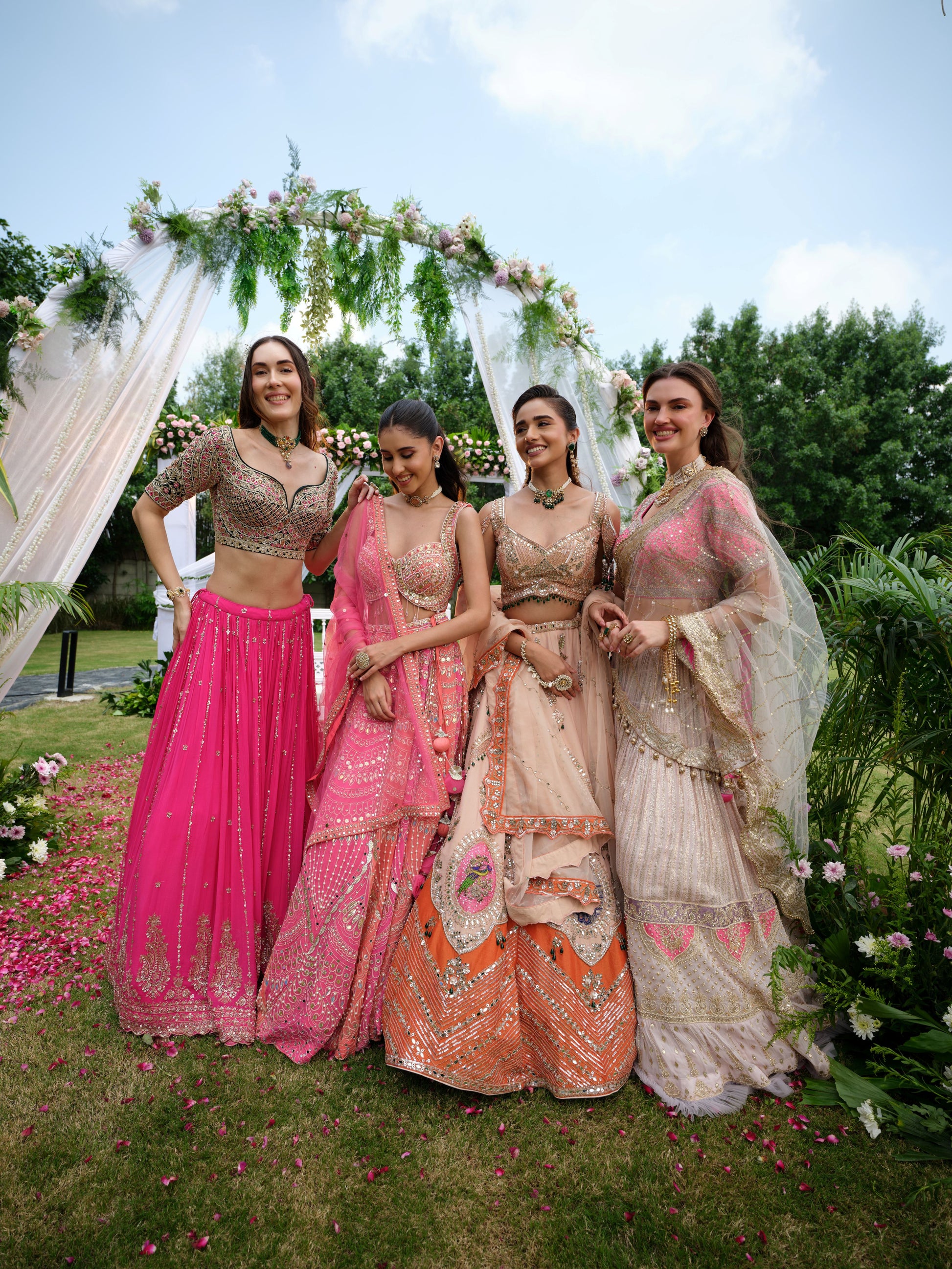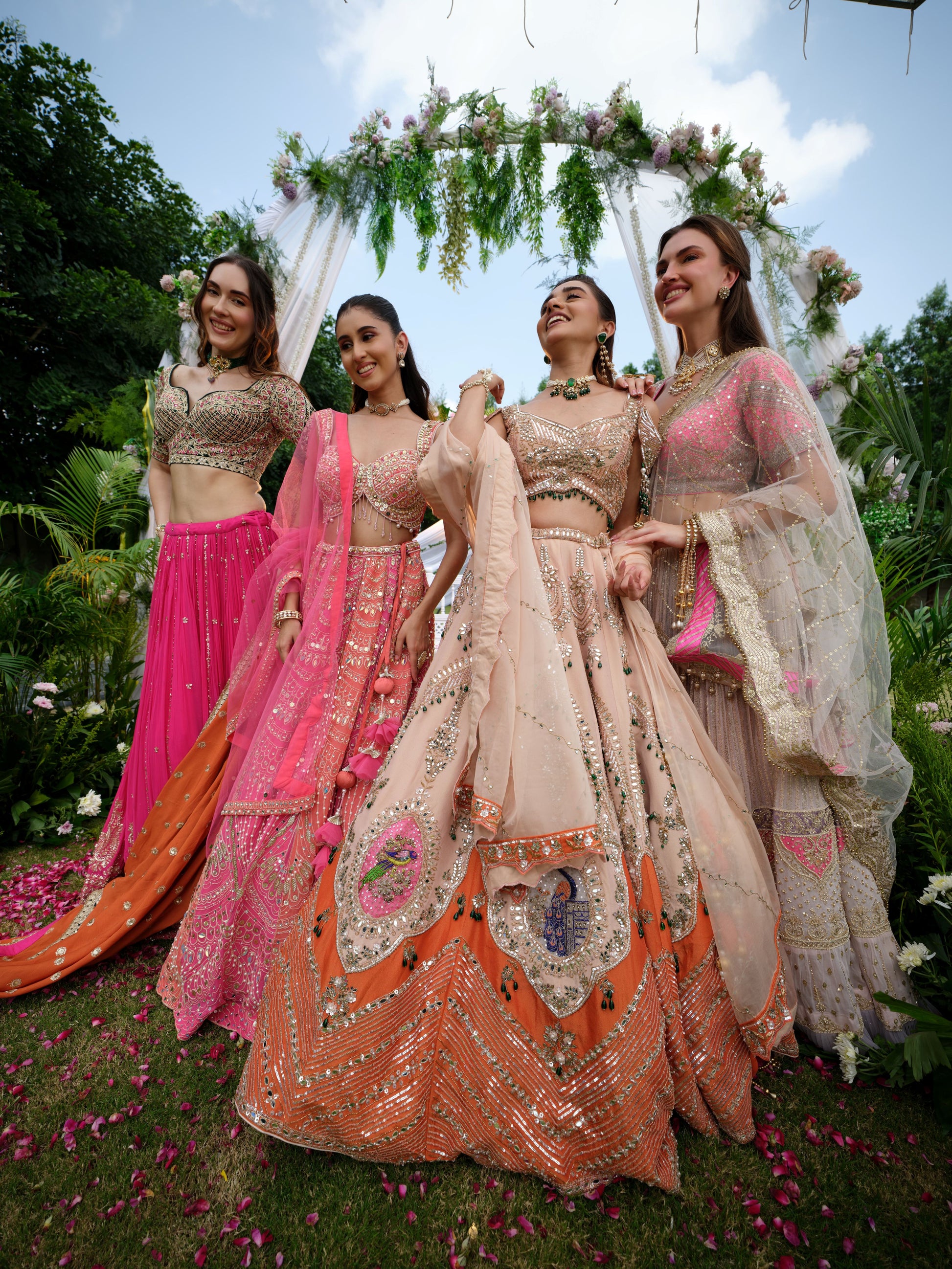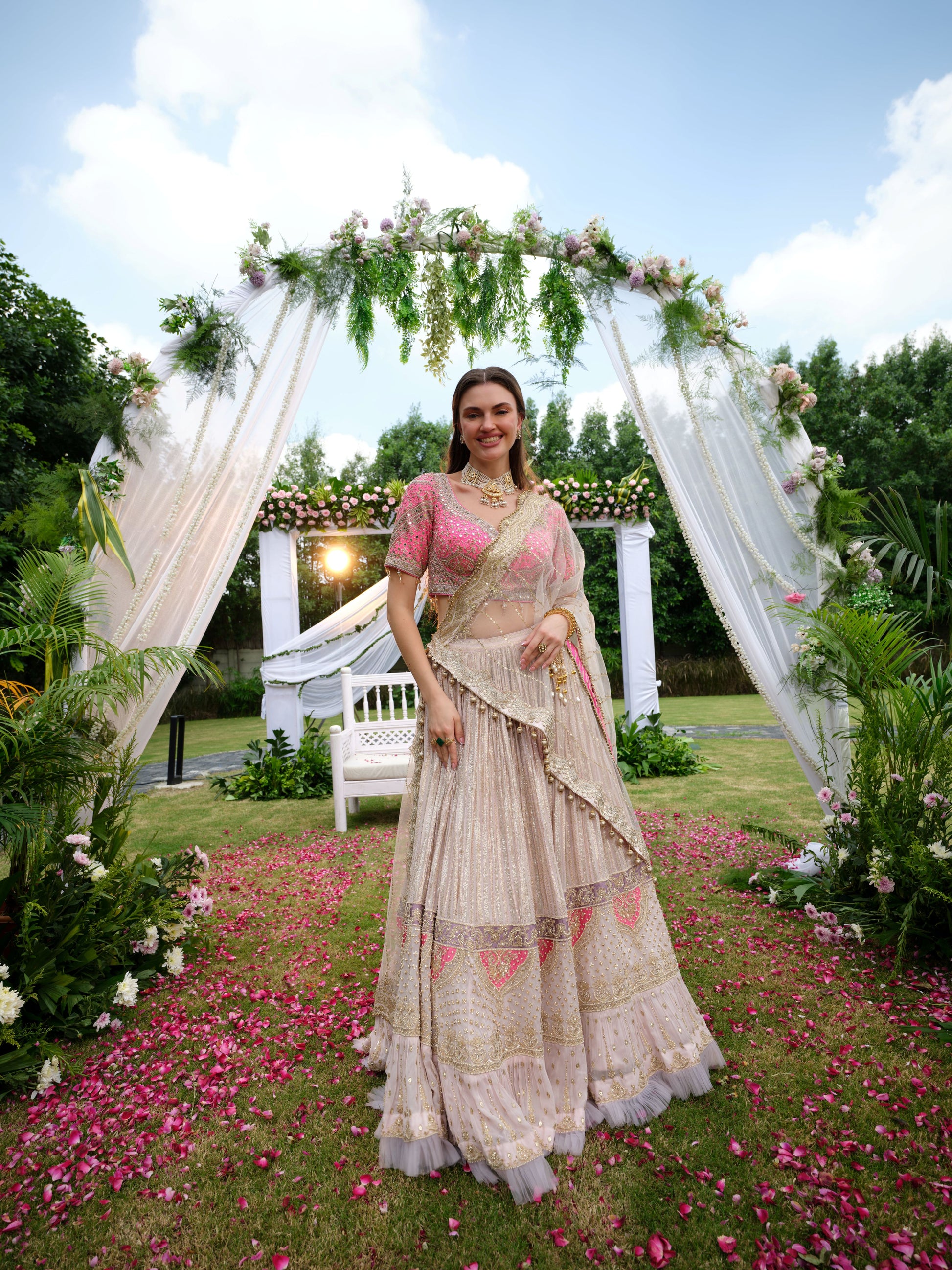 A graceful ivory beige Lehenga enriched with intricate embroidery and pastel pink highlights along the borders and blouse. The delicate threadwork and subtle shimmer add a refined elegance, while the contrasting pink blouse with floral detailing elevates the look. Draped in timeless sophistication, this lehenga is a perfect balance of tradition and contemporary finesse.
