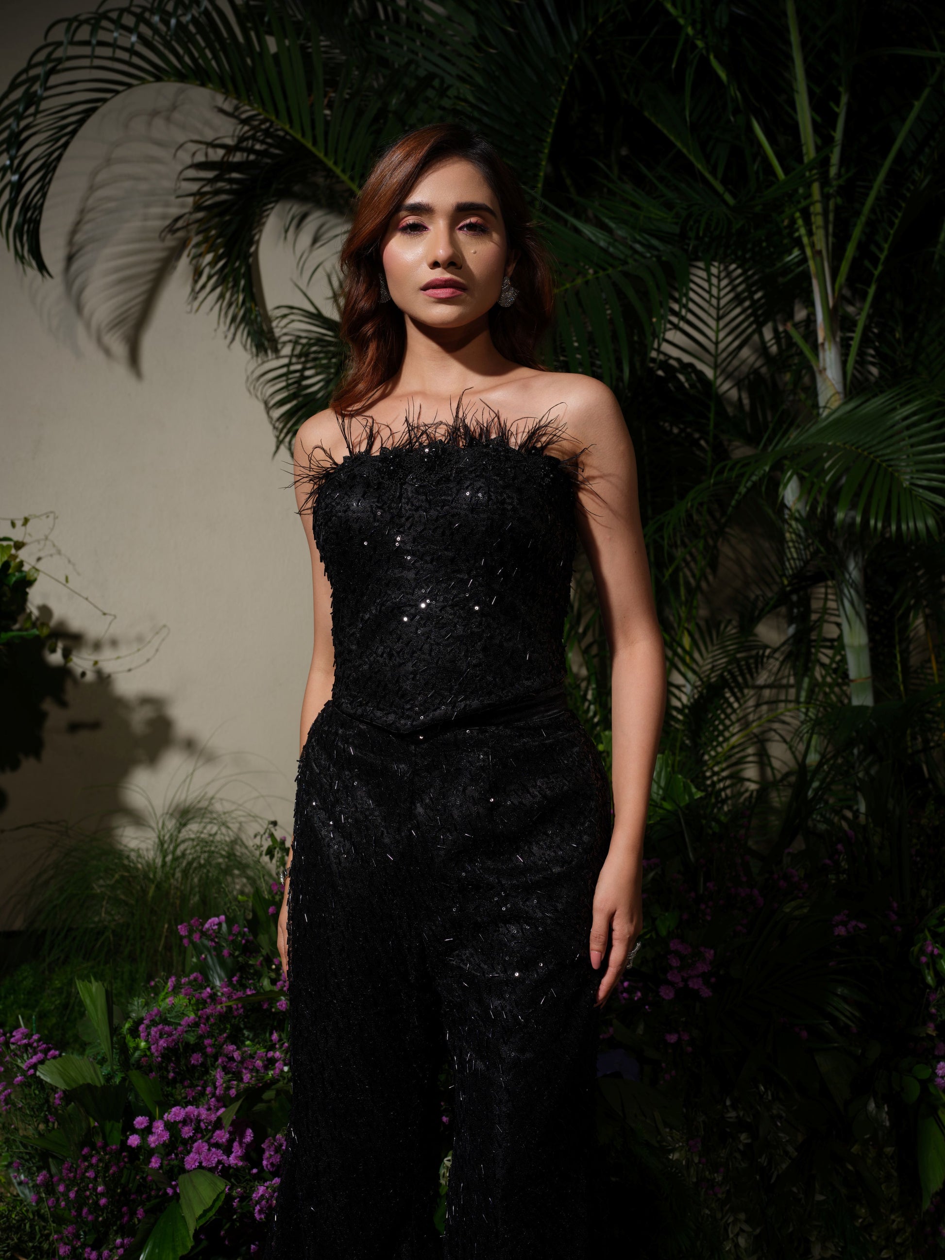 A modern strapless jumpsuit in shimmering black sequins, blending comfort with high glamour. The straight neckline is delicately detailed with feather accents, adding a playful edge to the sleek silhouette. Perfect for those who love making a statement beyond traditional gowns, this outfit is bold, contemporary, and effortlessly stylish.