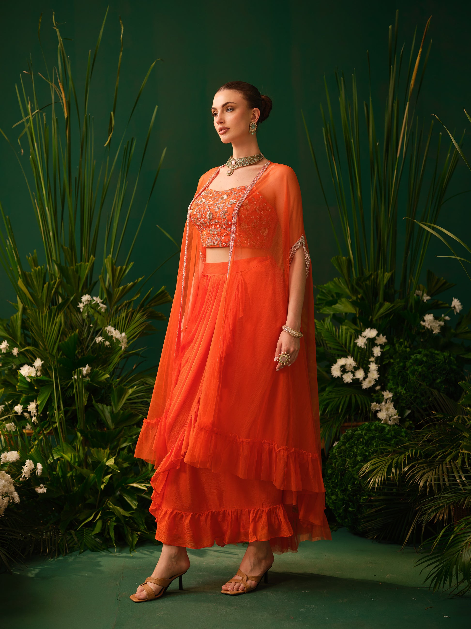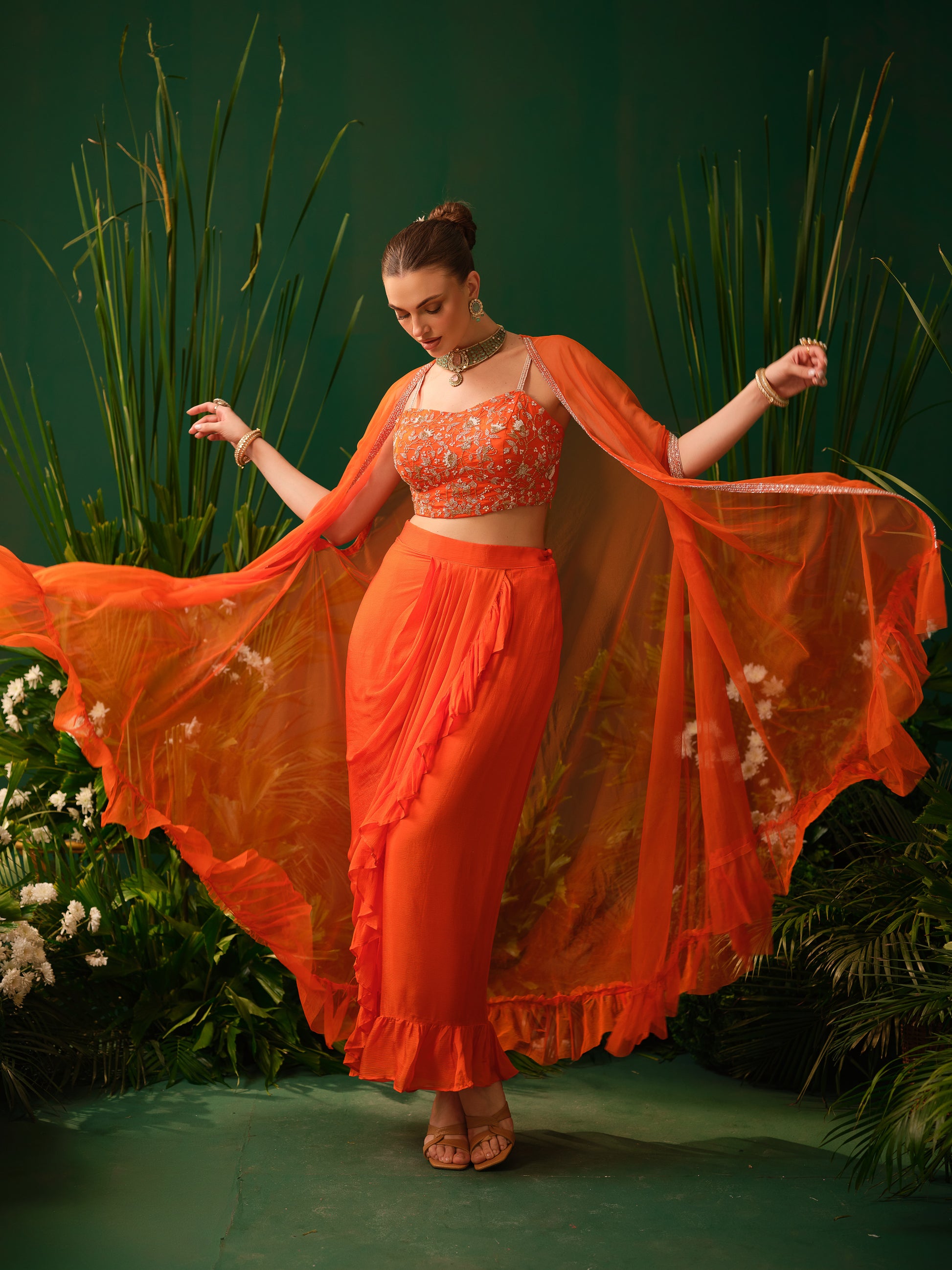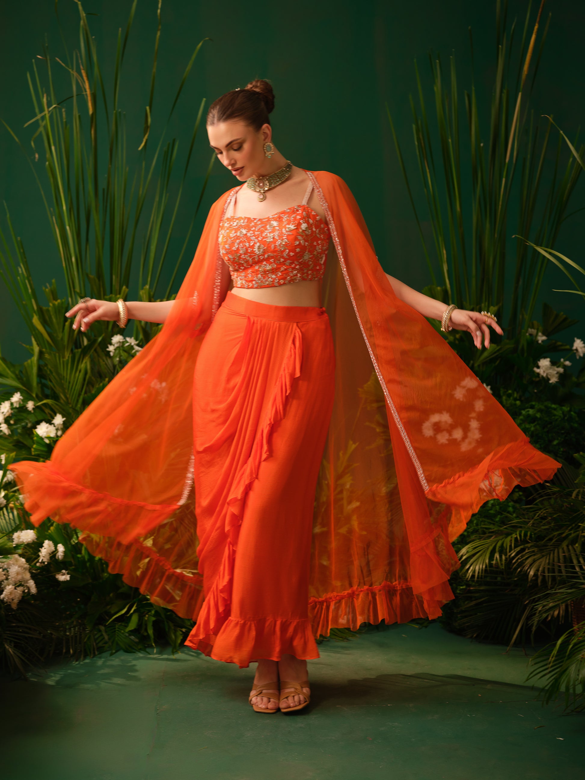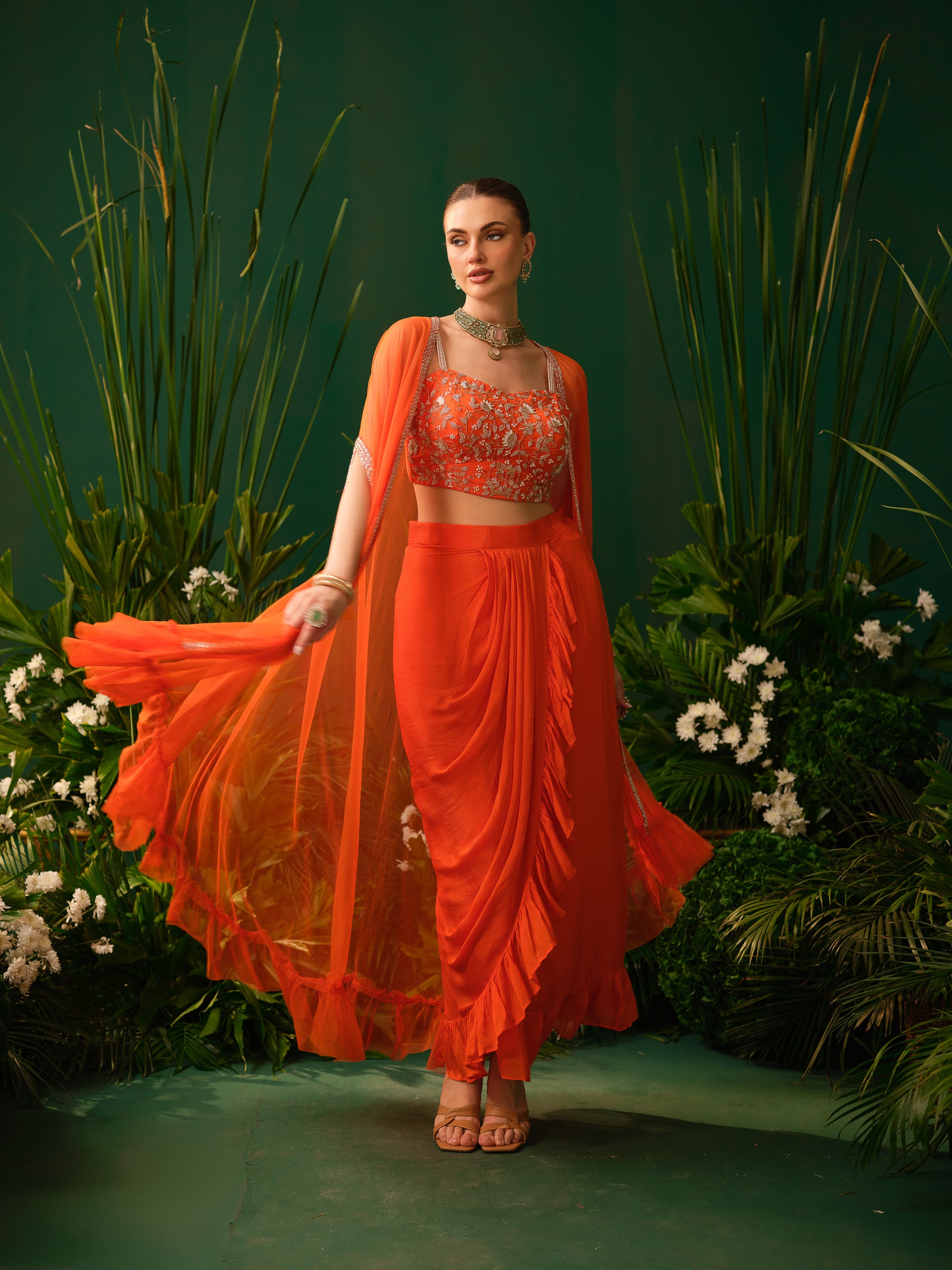 This contemporary orange fusion set features a stylish embroidered blouse paired with a draped skirt, offering a modern twist to traditional silhouettes. The lightweight sheer cape adds movement and drama, enhancing the overall look. The vibrant colour makes it bold and eye-catching, while the fluid drape ensures elegance.