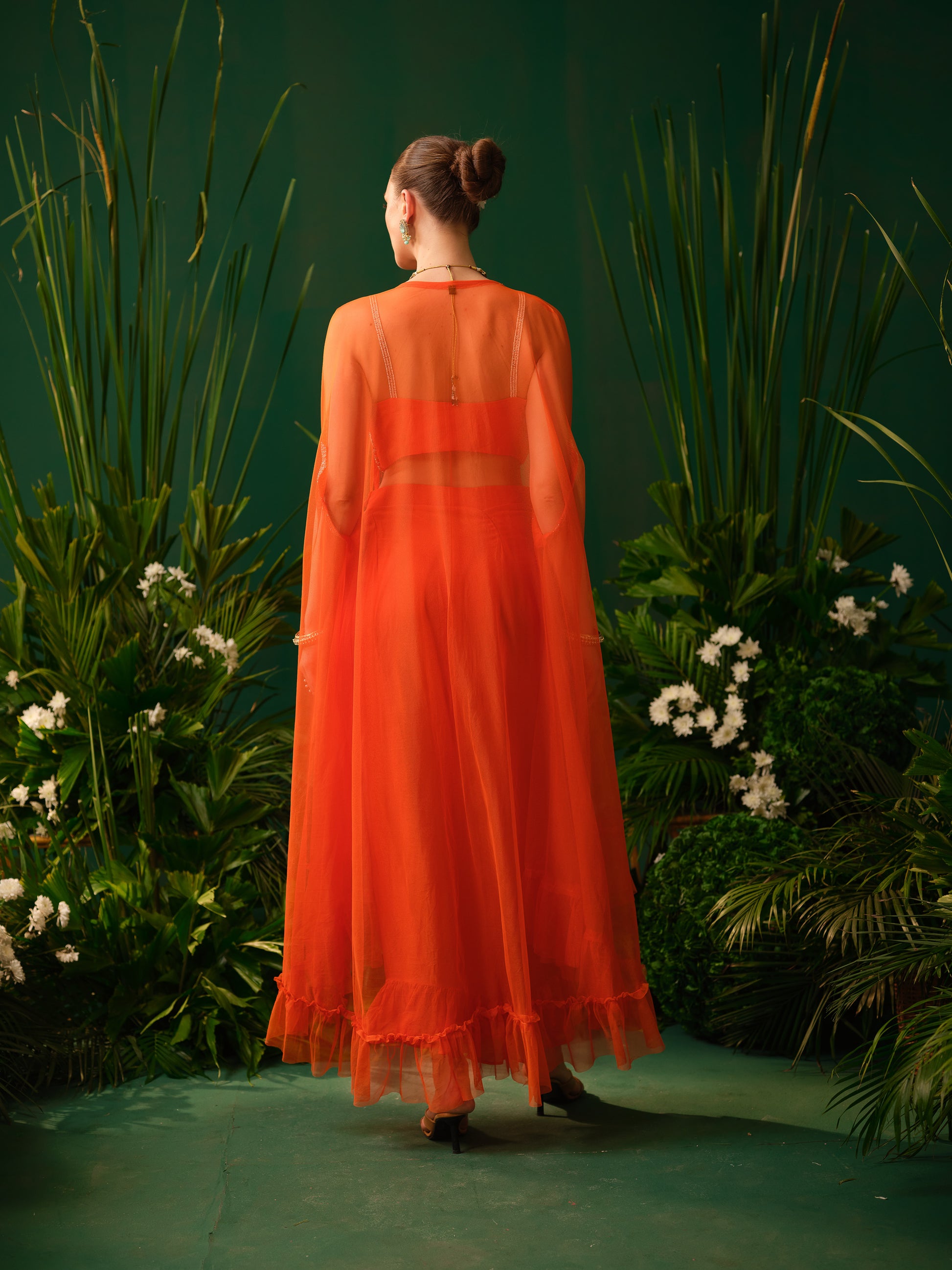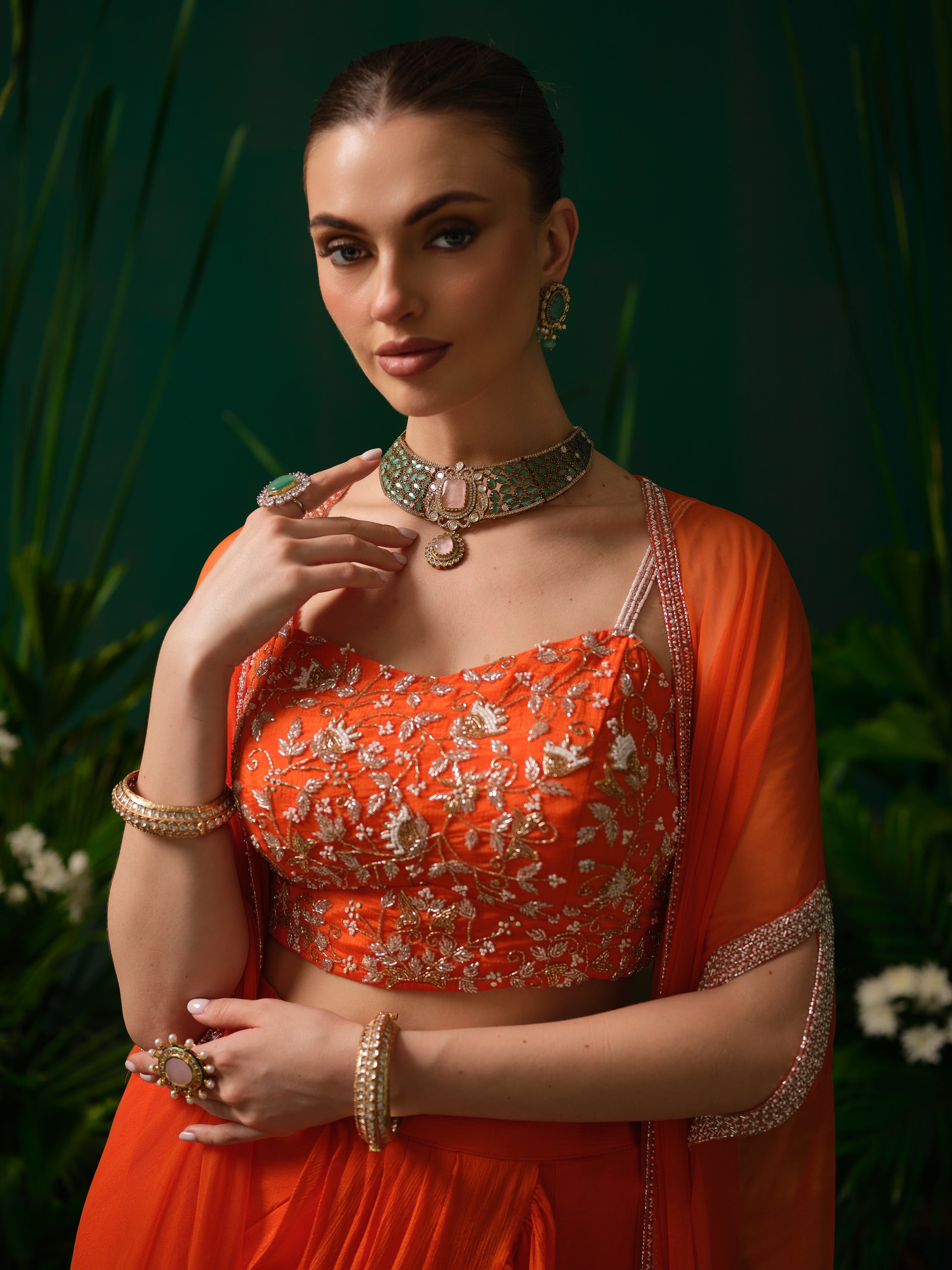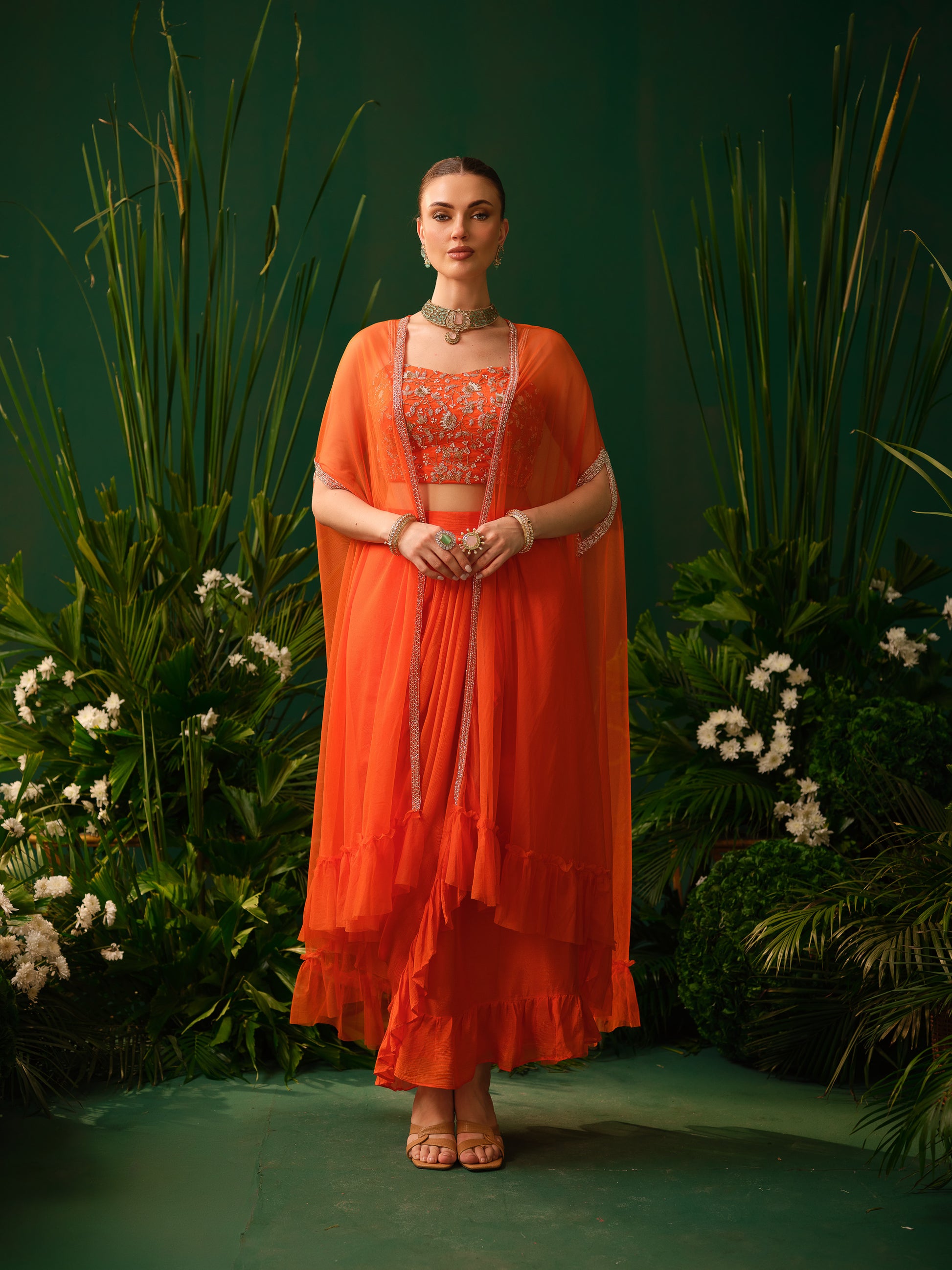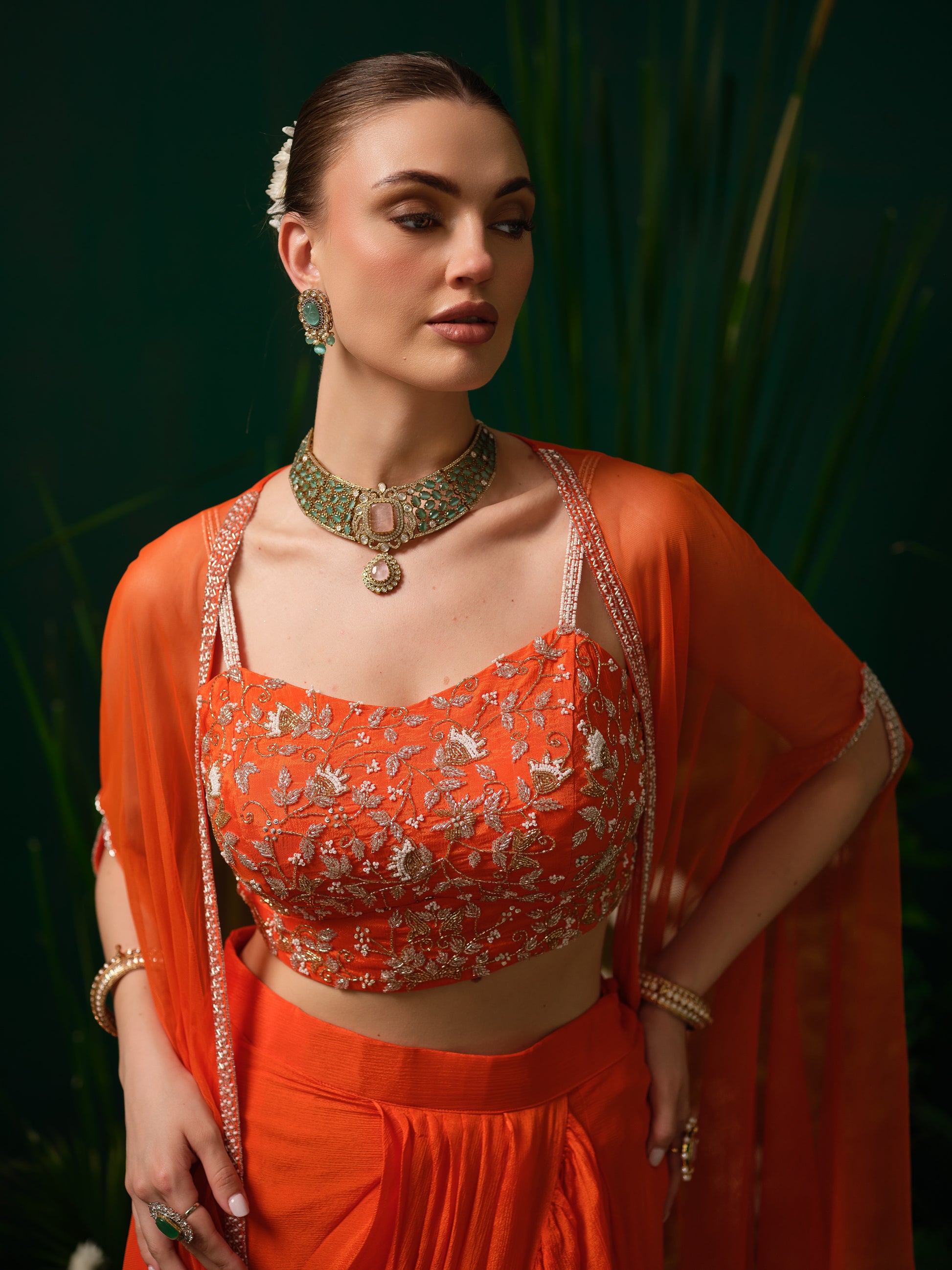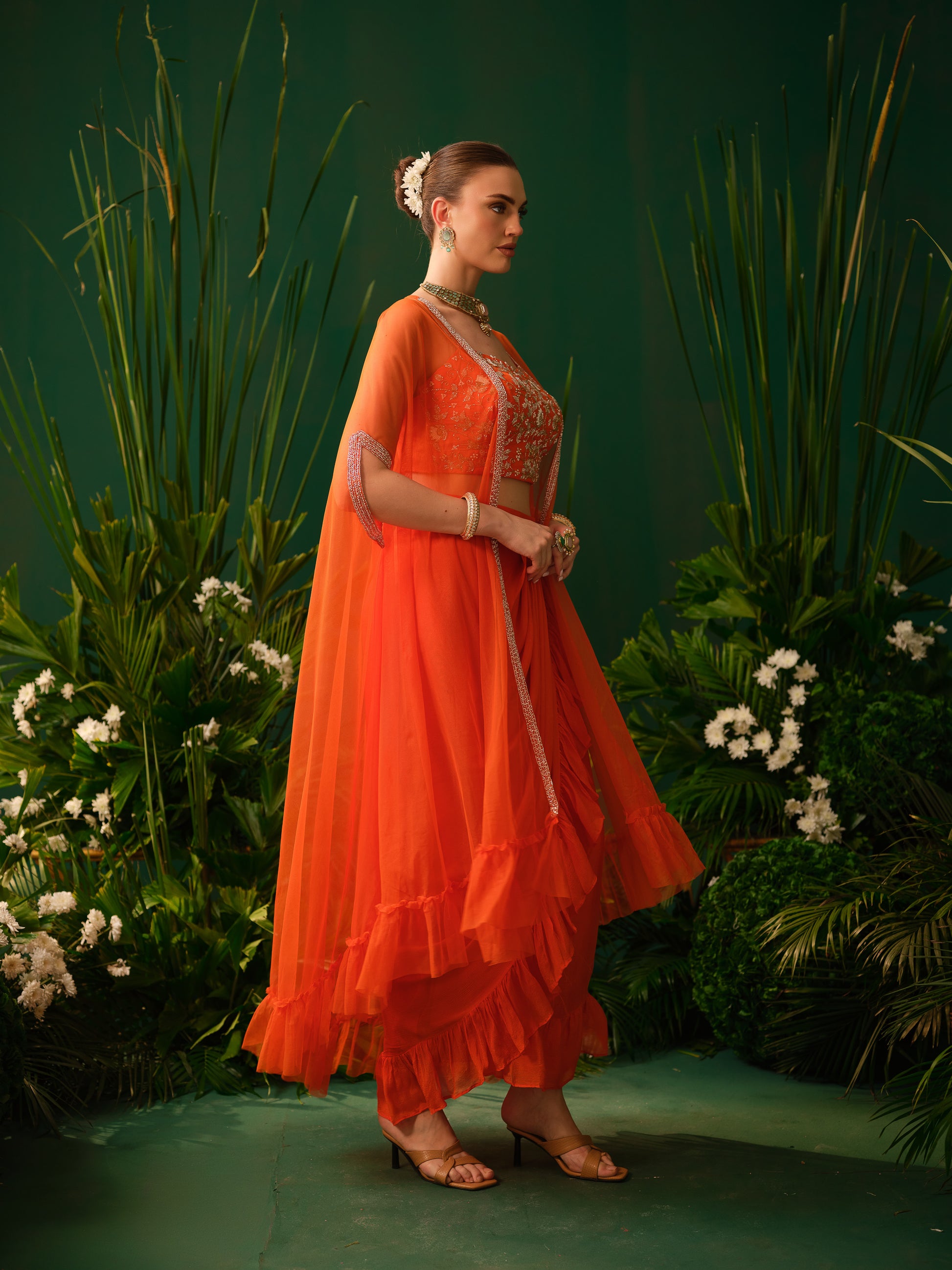 This contemporary orange fusion set features a stylish embroidered blouse paired with a draped skirt, offering a modern twist to traditional silhouettes. The lightweight sheer cape adds movement and drama, enhancing the overall look. The vibrant colour makes it bold and eye-catching, while the fluid drape ensures elegance.