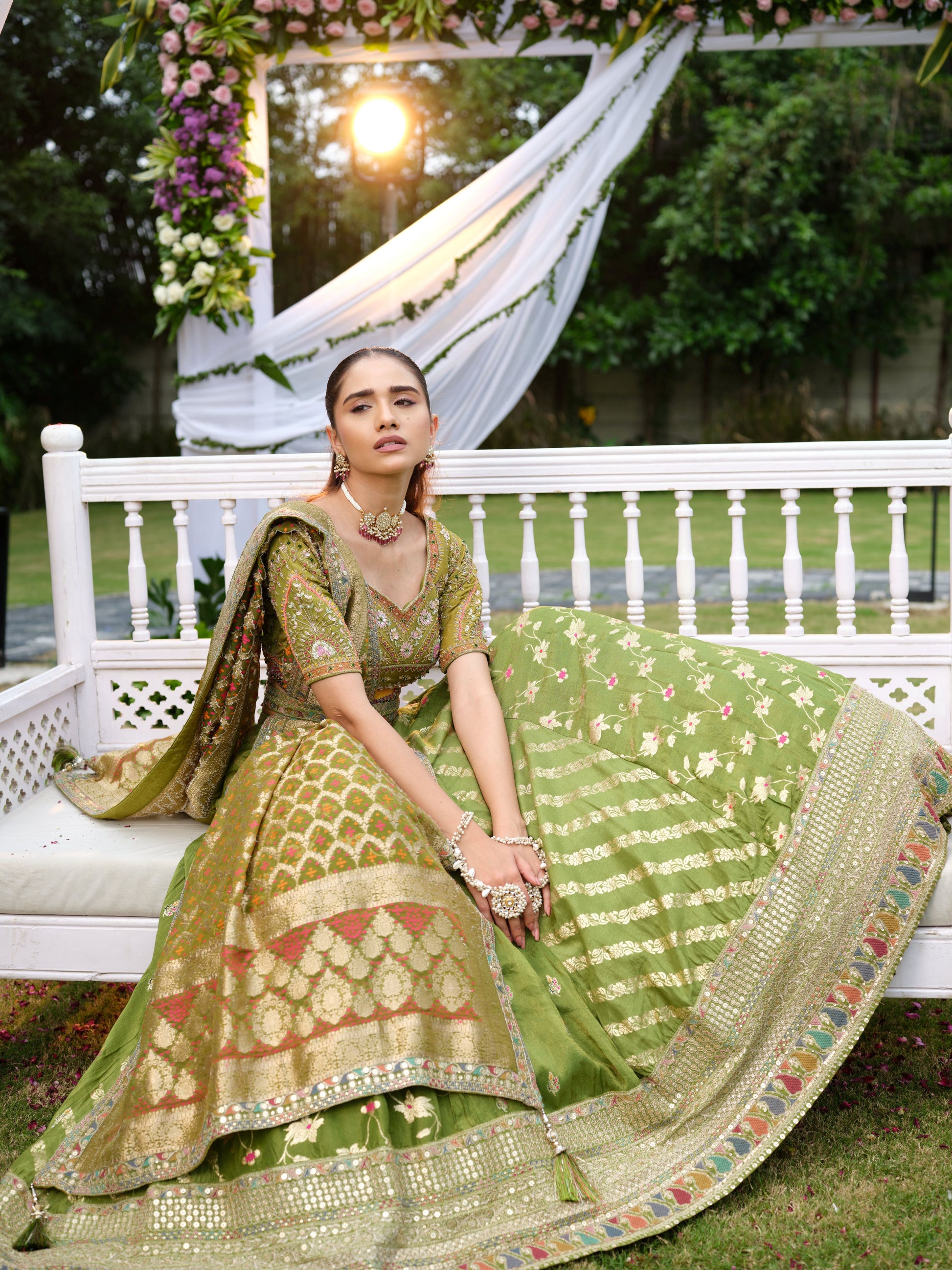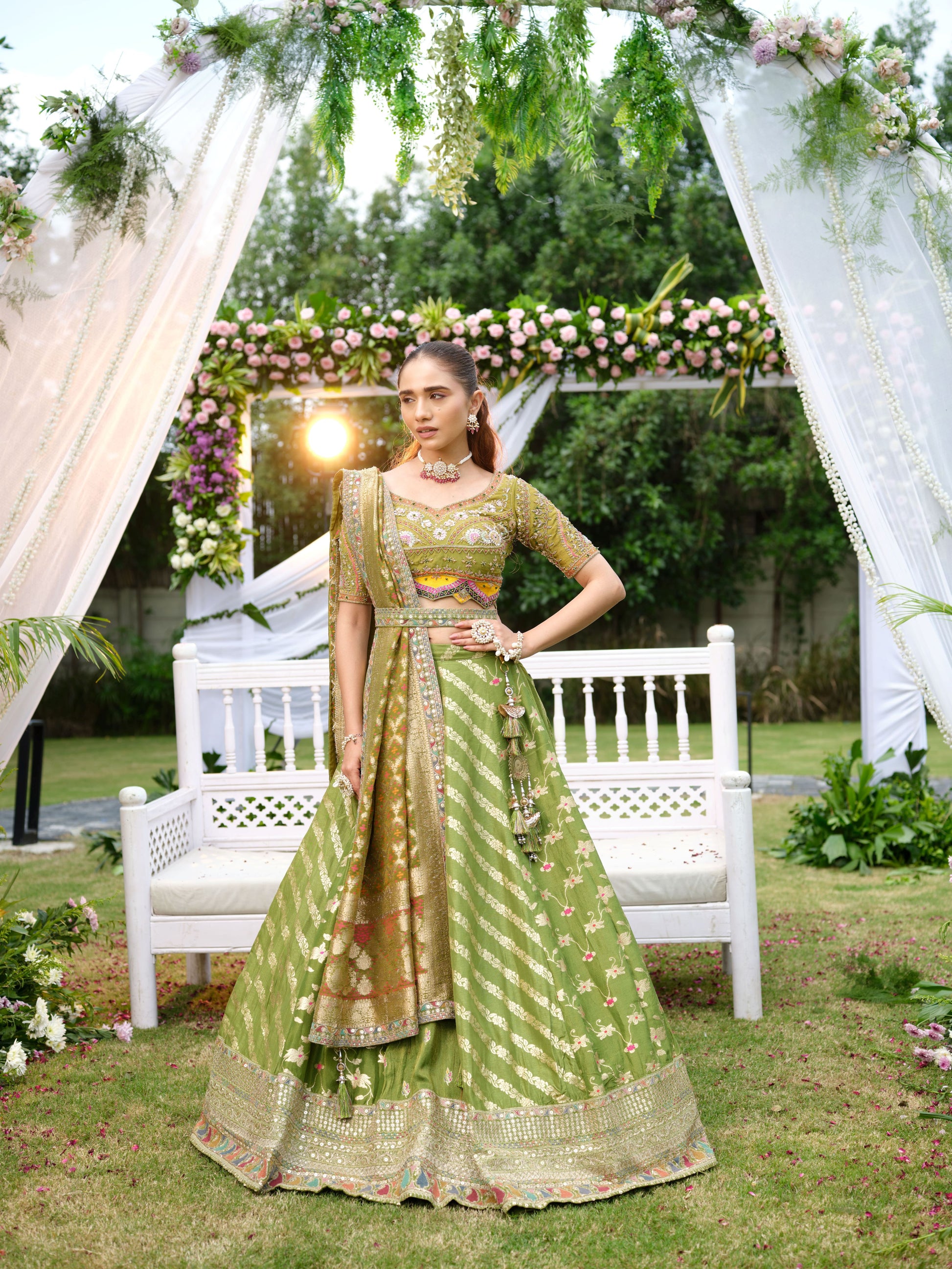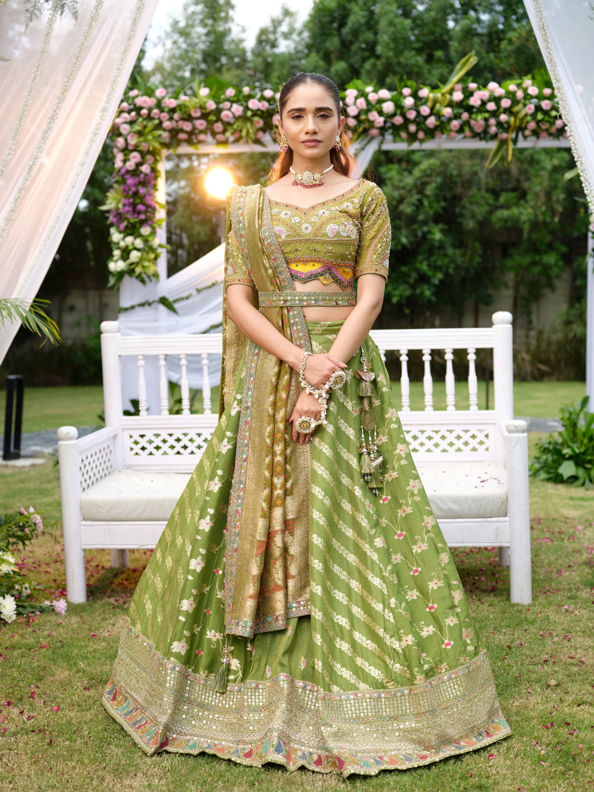 A heritage-inspired olive green lehenga set rich with intricate detailing. The blouse is beautifully embroidered with pastel threads and mirrorwork, paired with a flared lehenga featuring delicate floral butis and a wide ornate border. The contrasting dupatta, woven with traditional golden motifs and finished with mirrorwork edges, elevates the ensemble with a regal charm.