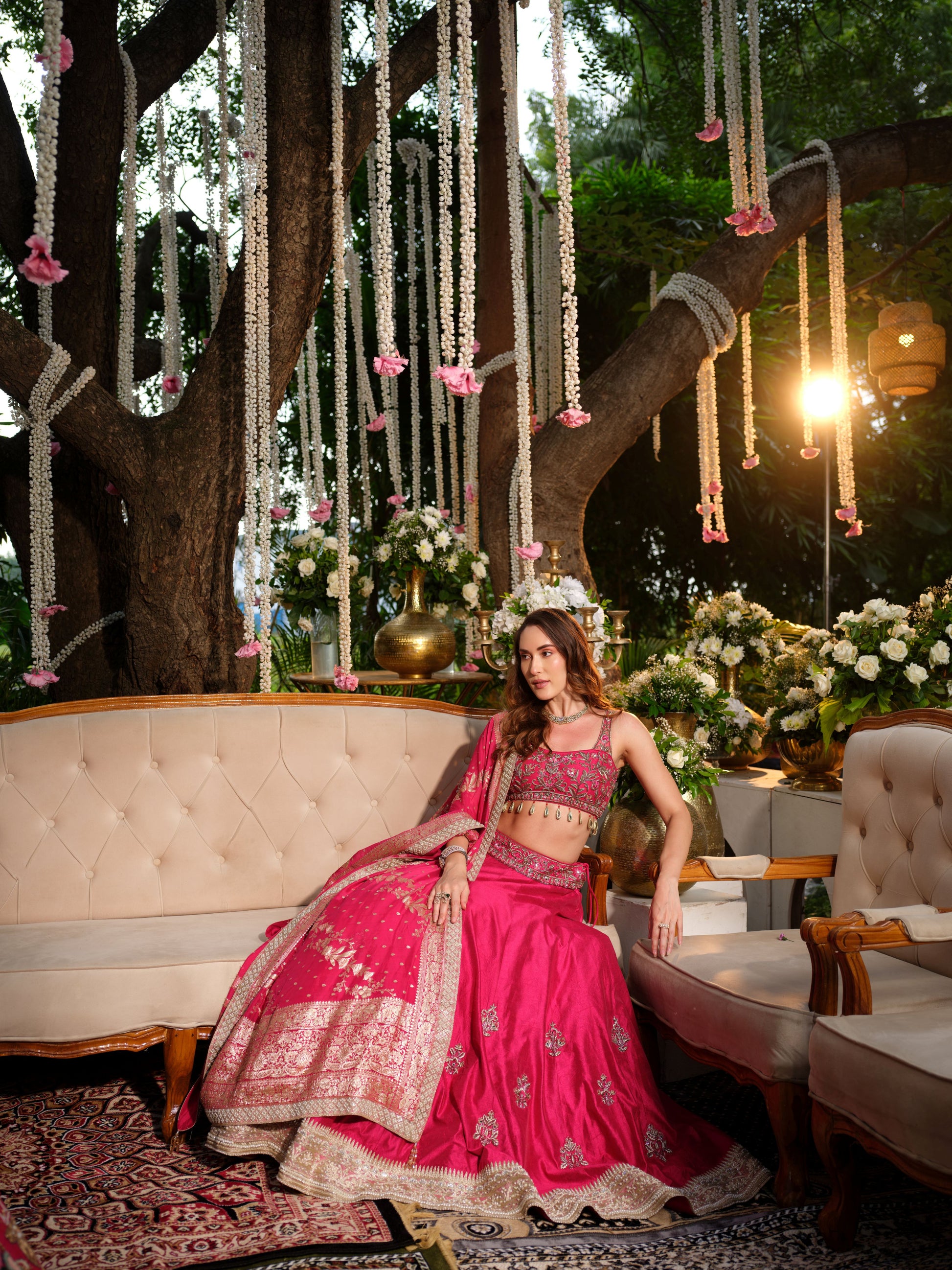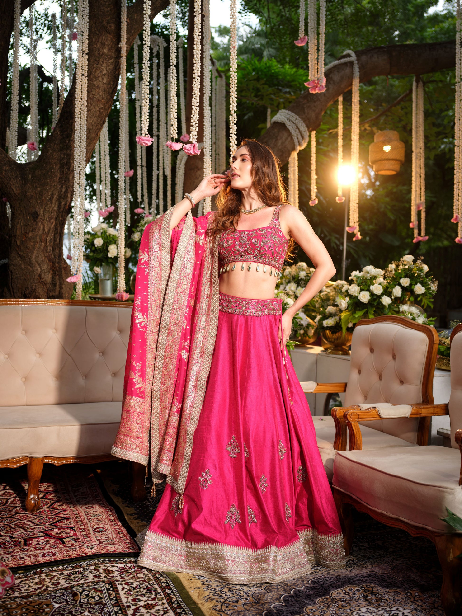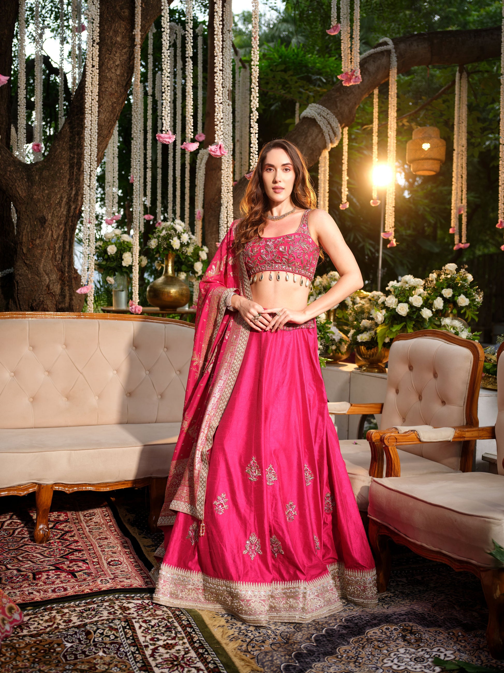 Exuding grace and tradition, this rani pink lehenga set is a timeless classic for festive and wedding occasions. The lehenga features delicate golden motifs, accentuated with an intricately woven border that lends richness to the ensemble. Paired with a matching blouse embellished with fine detailing and a complementing dupatta adorned with traditional patterns, this outfit blends vibrancy with elegance.