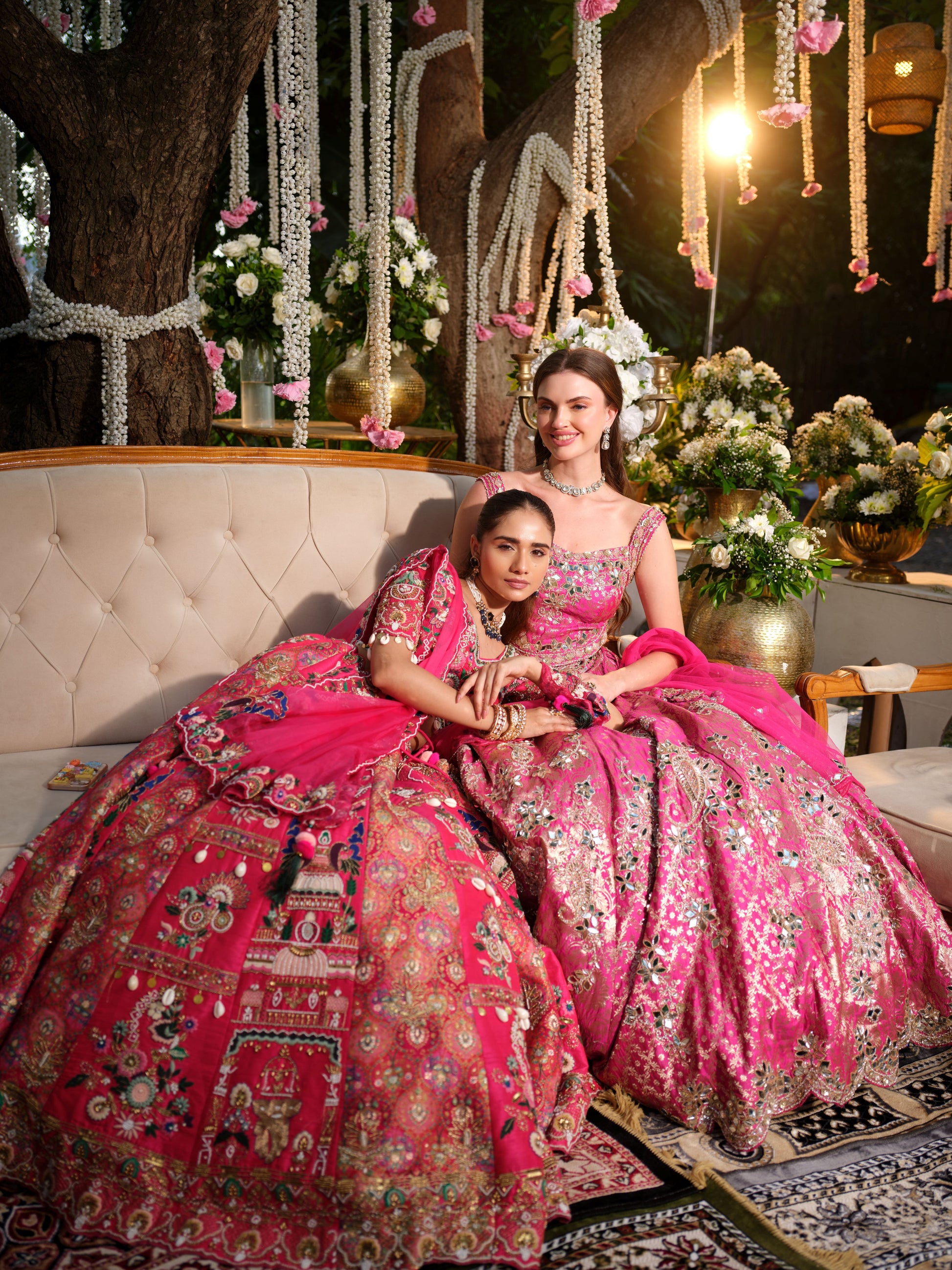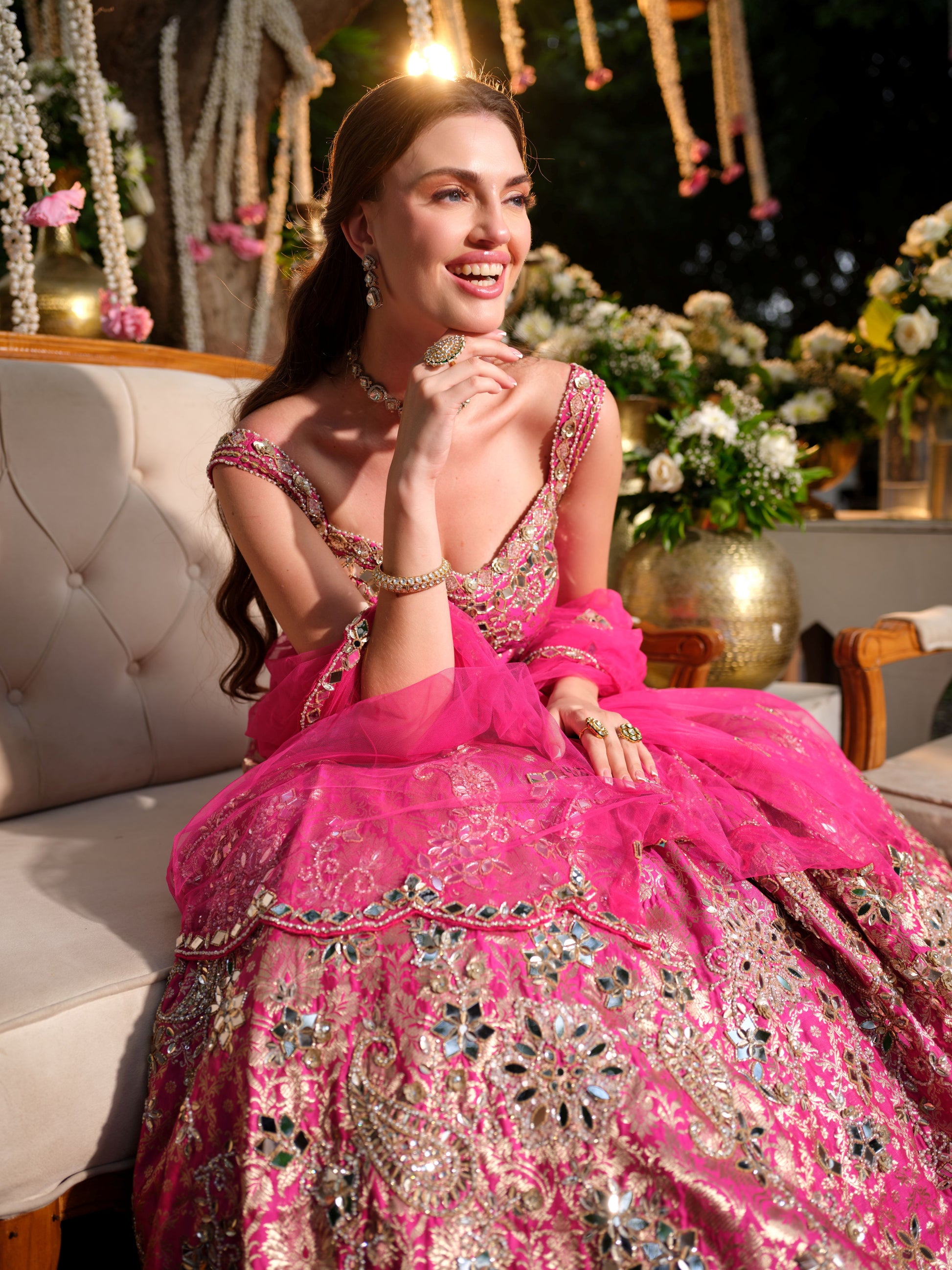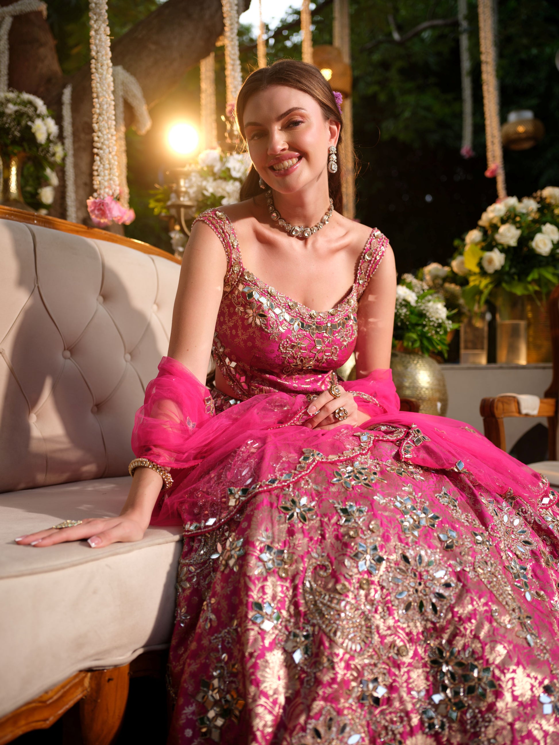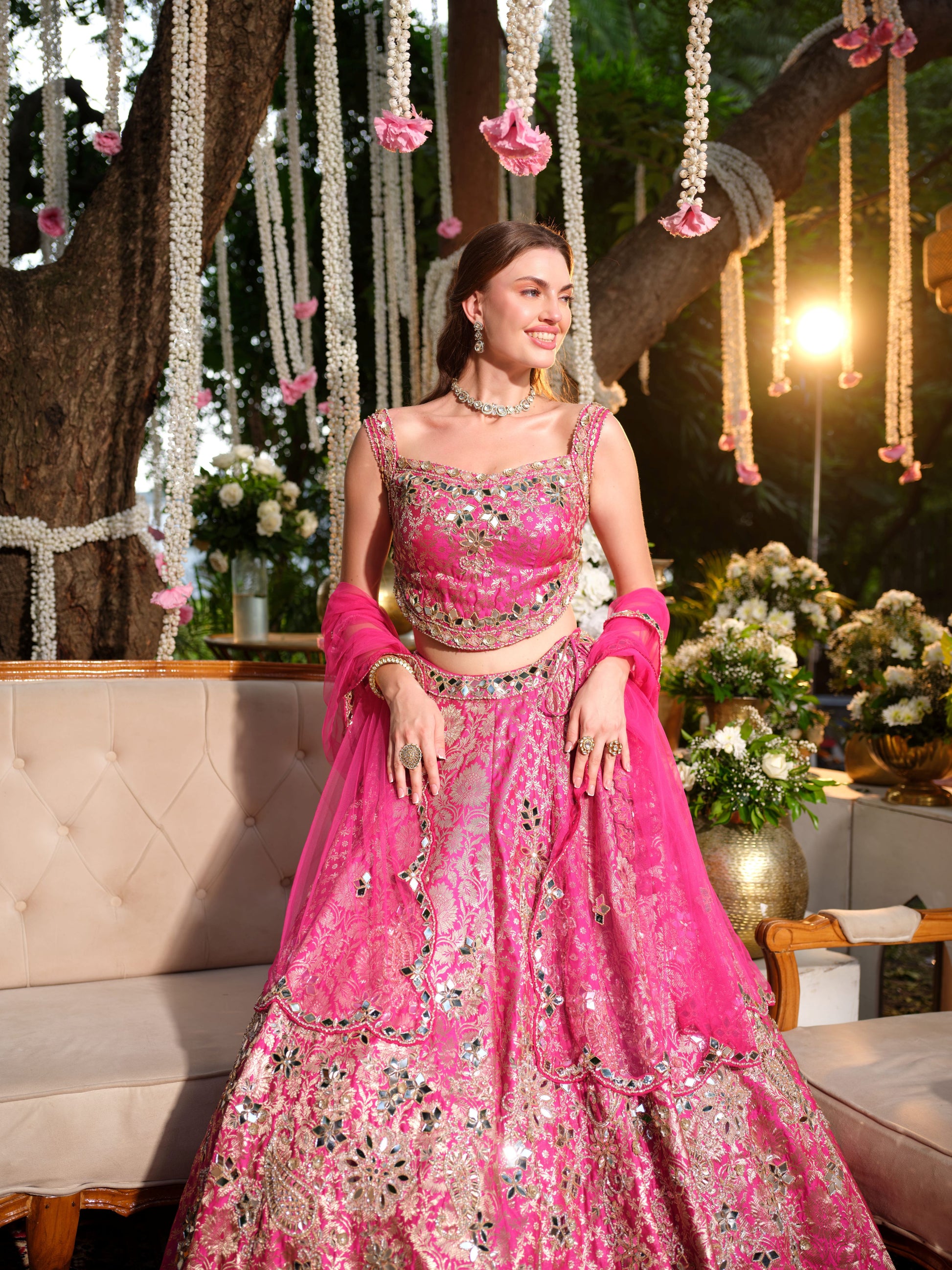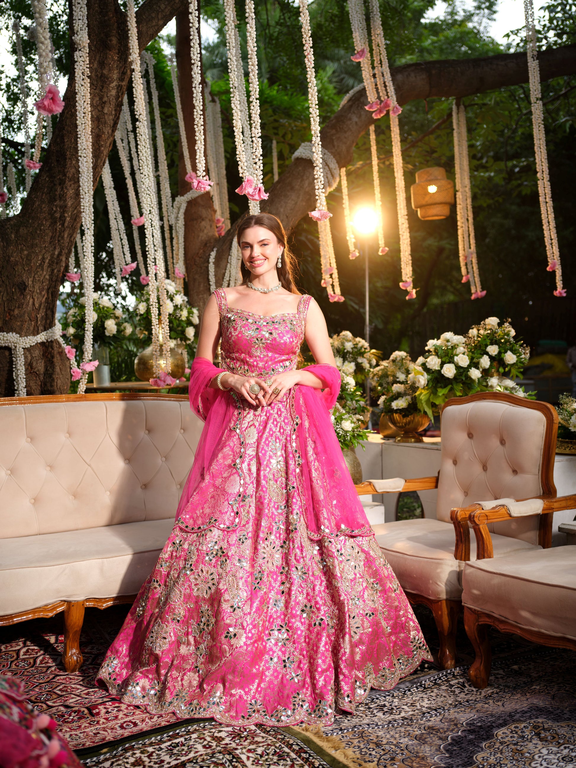 Radiating sheer elegance, this fuchsia pink lehenga set is a celebration of vibrant femininity and regal charm. The ensemble features a heavily embroidered lehenga adorned with intricate floral motifs in silver and golden zari, sequins, and resham threadwork that add a dazzling shimmer. Paired with a delicately embellished blouse and a matching sheer dupatta with dainty border detailing, the outfit strikes the perfect balance between tradition and glamour.This masterpiece exudes grace while making a bold style statement.