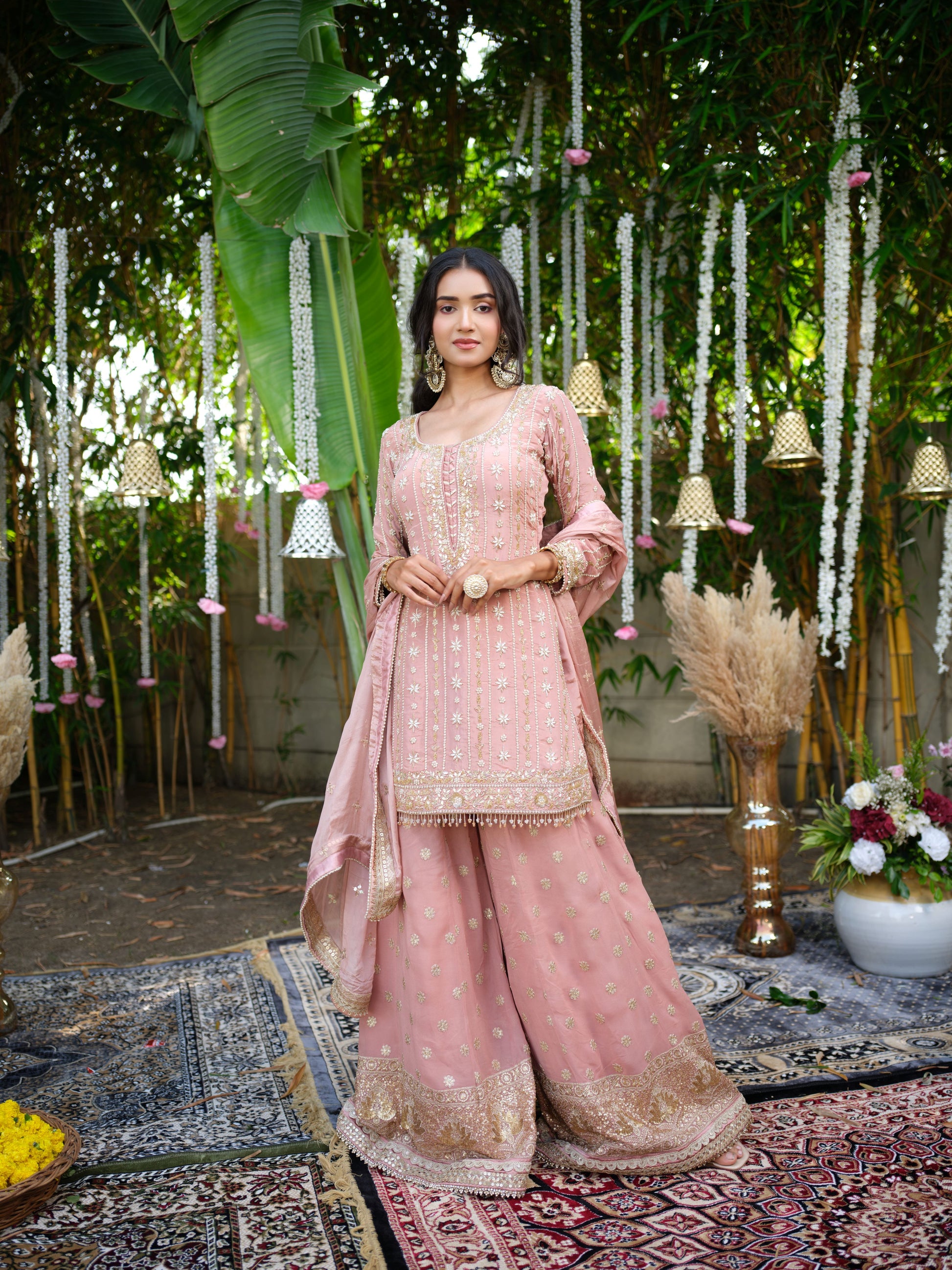 Soft, feminine, and regal, this blush-toned sharara set is beautifully detailed with zari and sequin embroidery. The long kurta features delicate vertical patterns that elongate the silhouette, while the flared sharara bottoms and matching dupatta complete the ensemble with graceful charm. A perfect choice for weddings, festive celebrations, and elegant soirées.