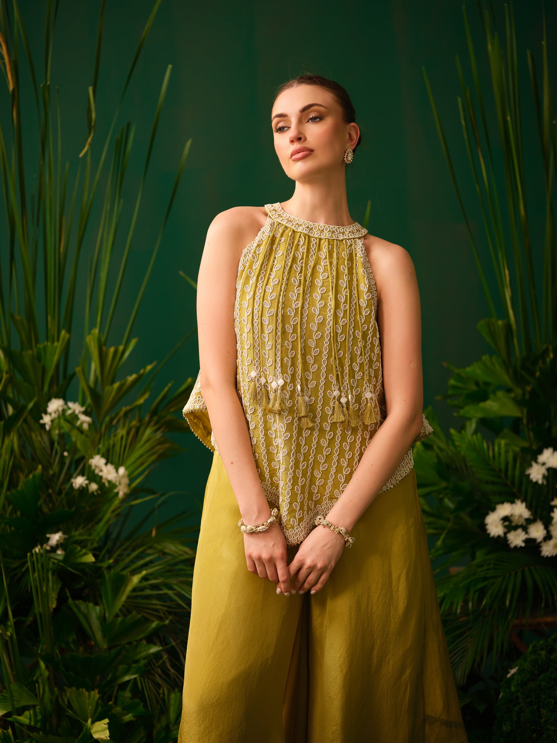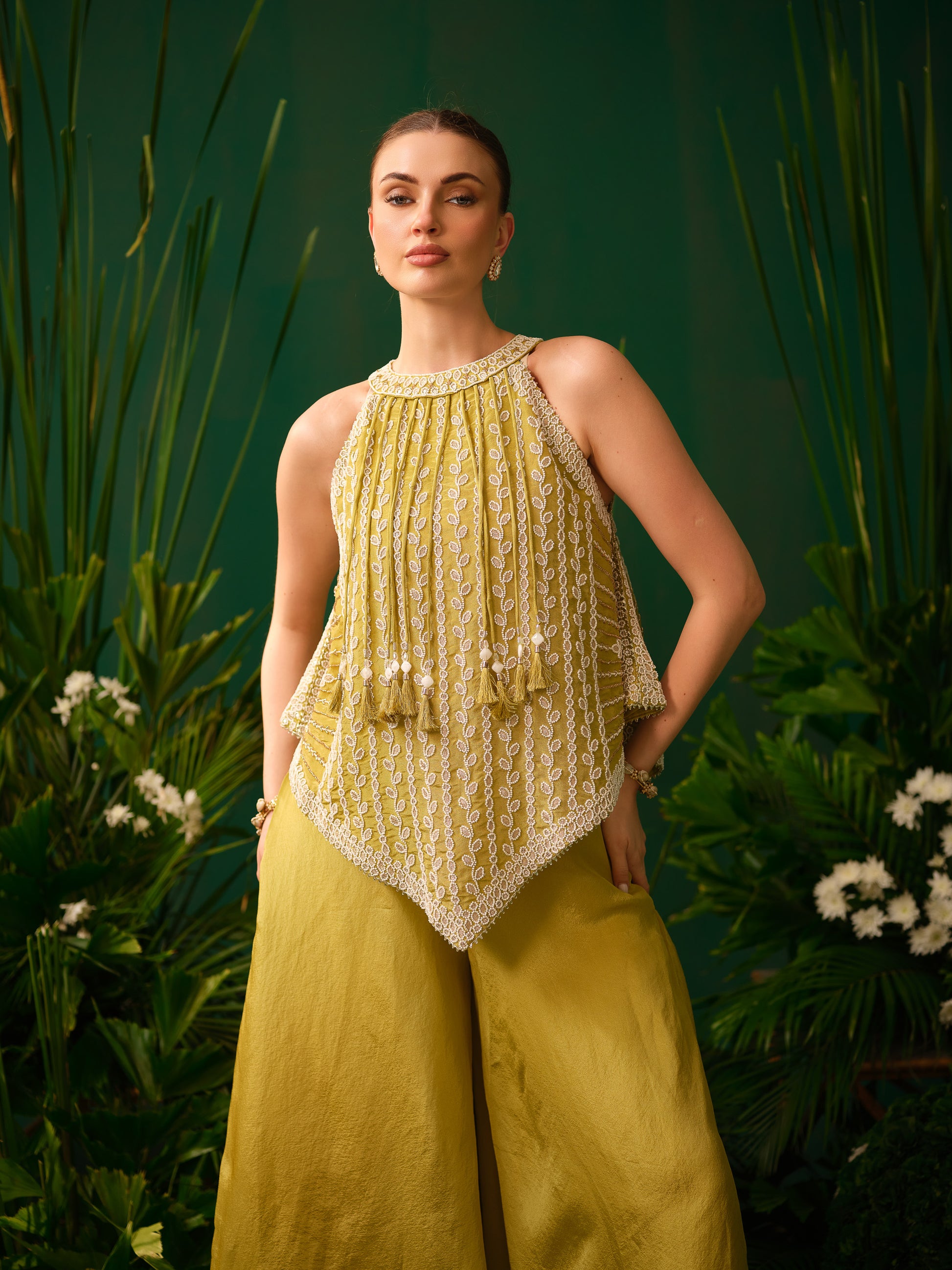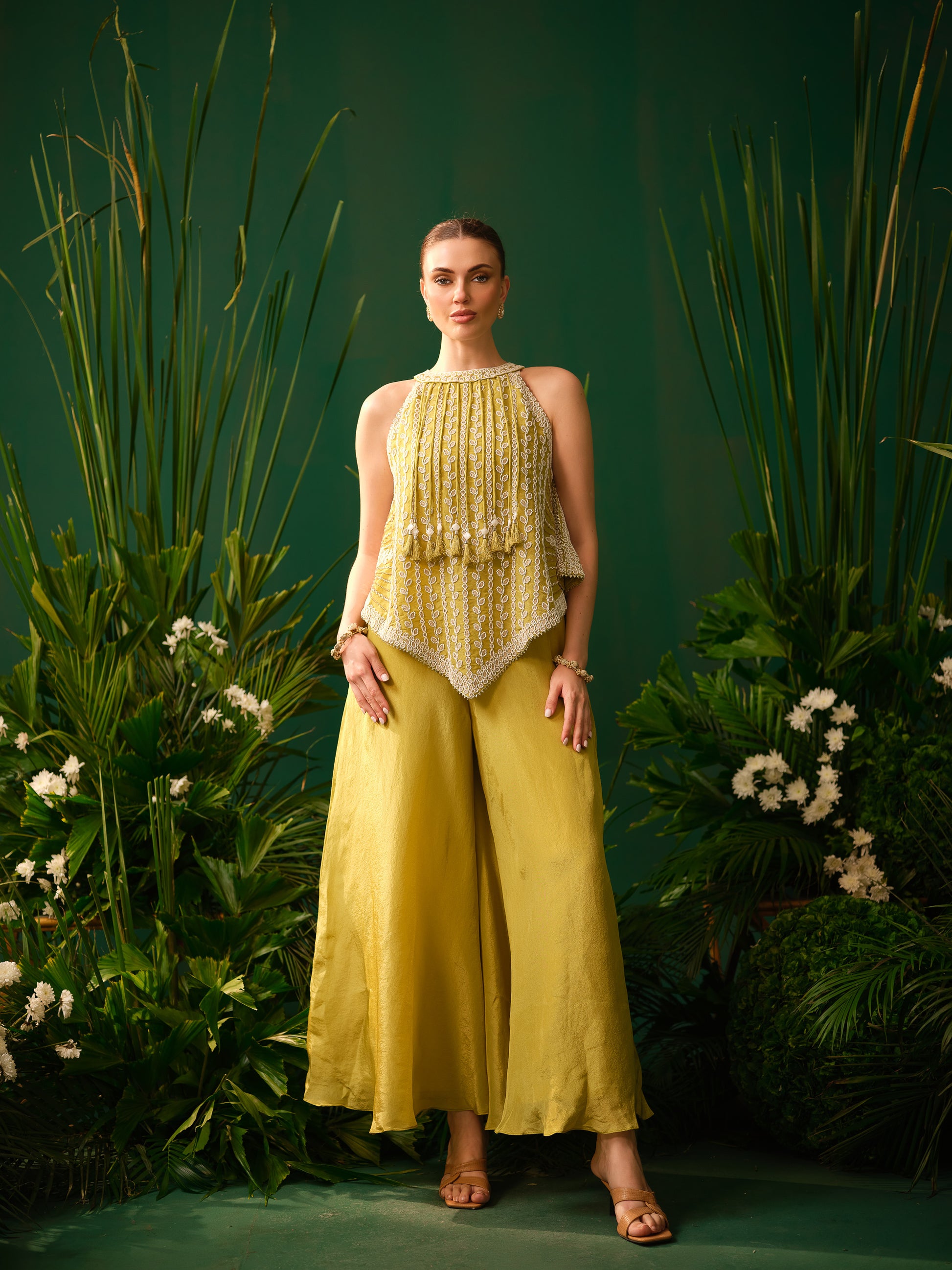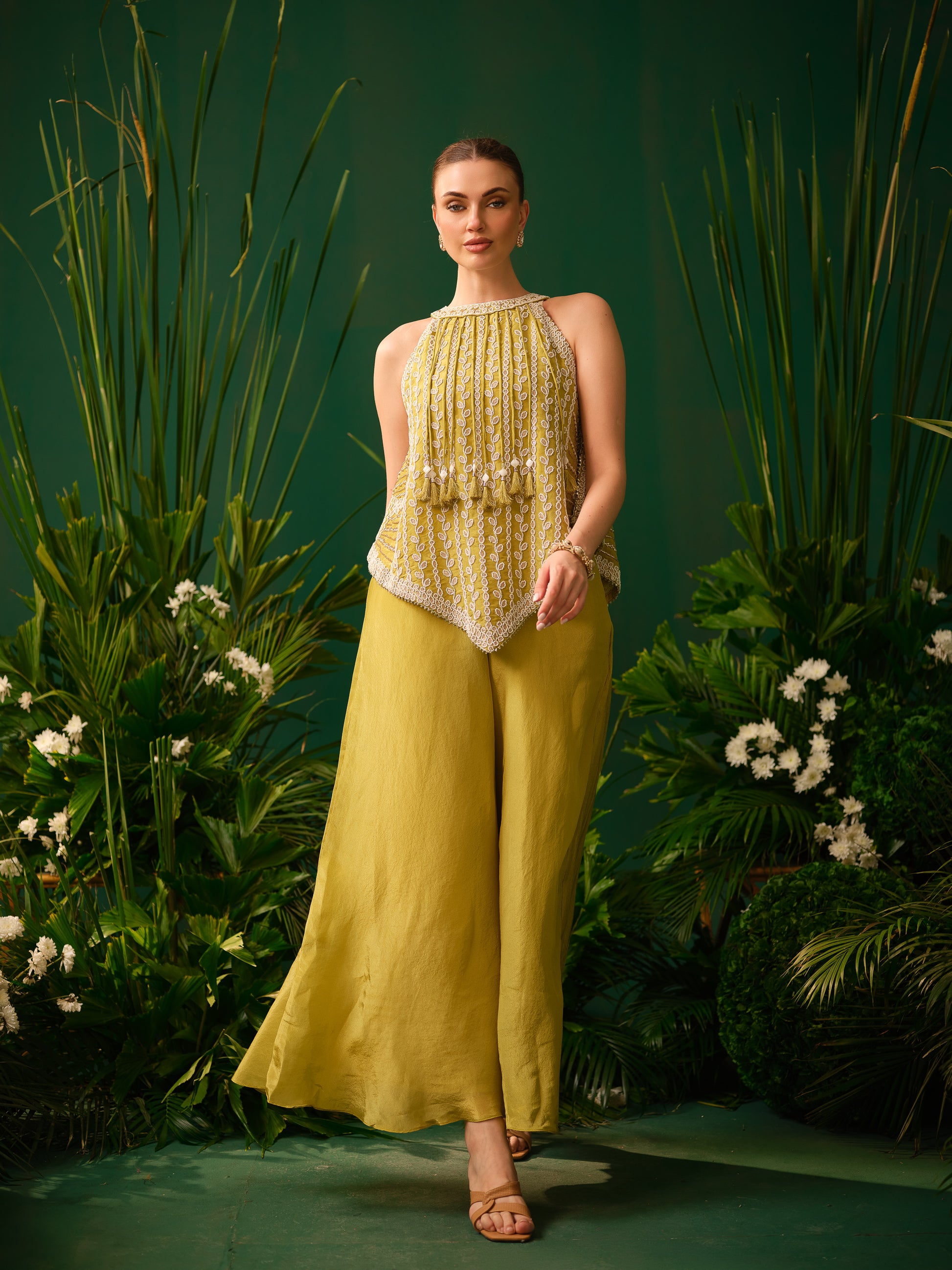 This contemporary coord set features a mustard yellow halter-style top paired with wide-leg palazzo pants. The top is adorned with delicate lace and tassel detailing, adding a playful yet elegant touch. The flowy silhouette ensures comfort while maintaining a chic look. The minimal design is elevated with subtle textures and finishes. Perfect for modern festive occasions or intimate gatherings. The outfit blends Indo-western aesthetics seamlessly. Its breathable fabric makes it ideal for warm weather events. A stylish choice for those who prefer fusion wear.