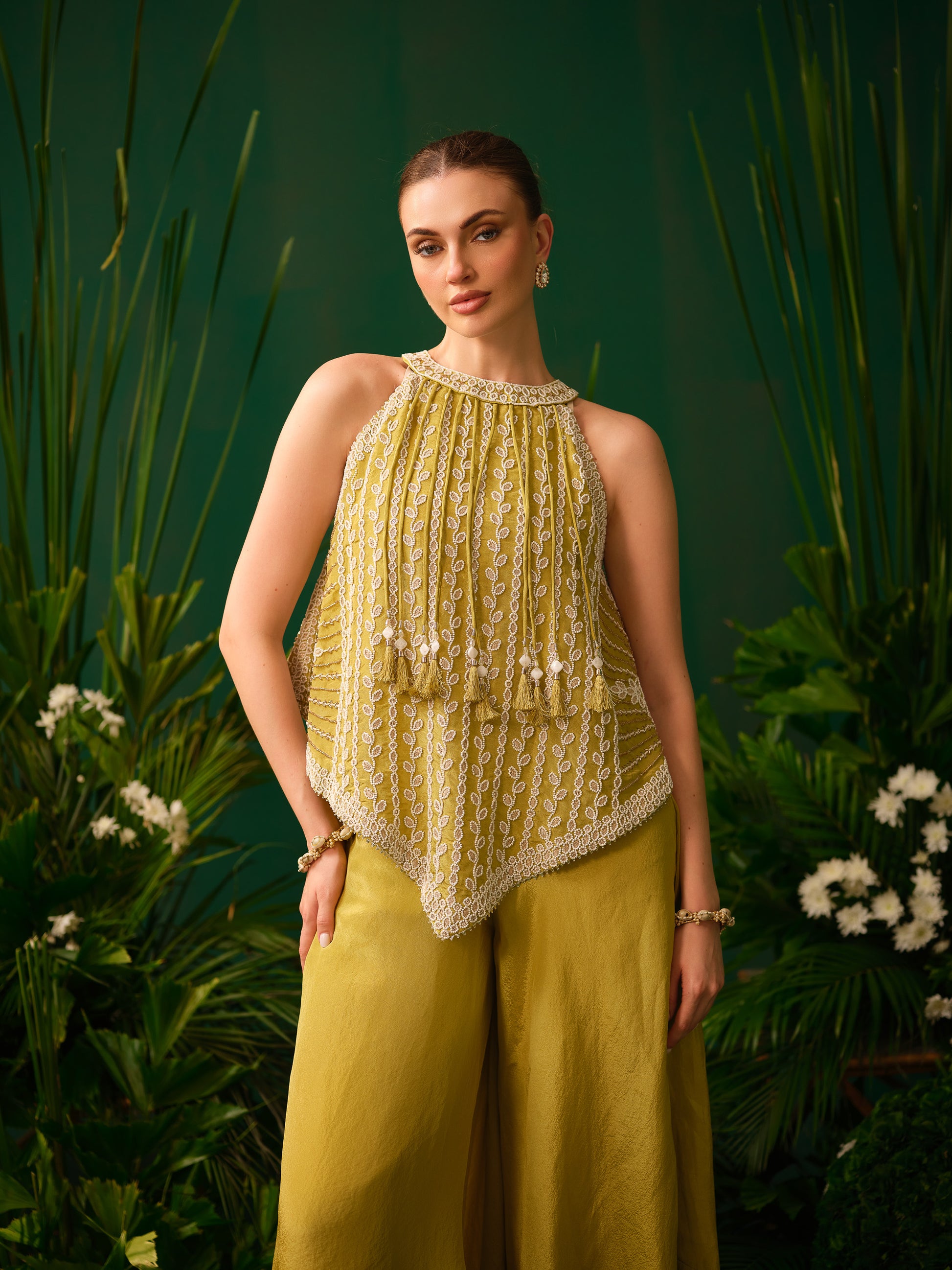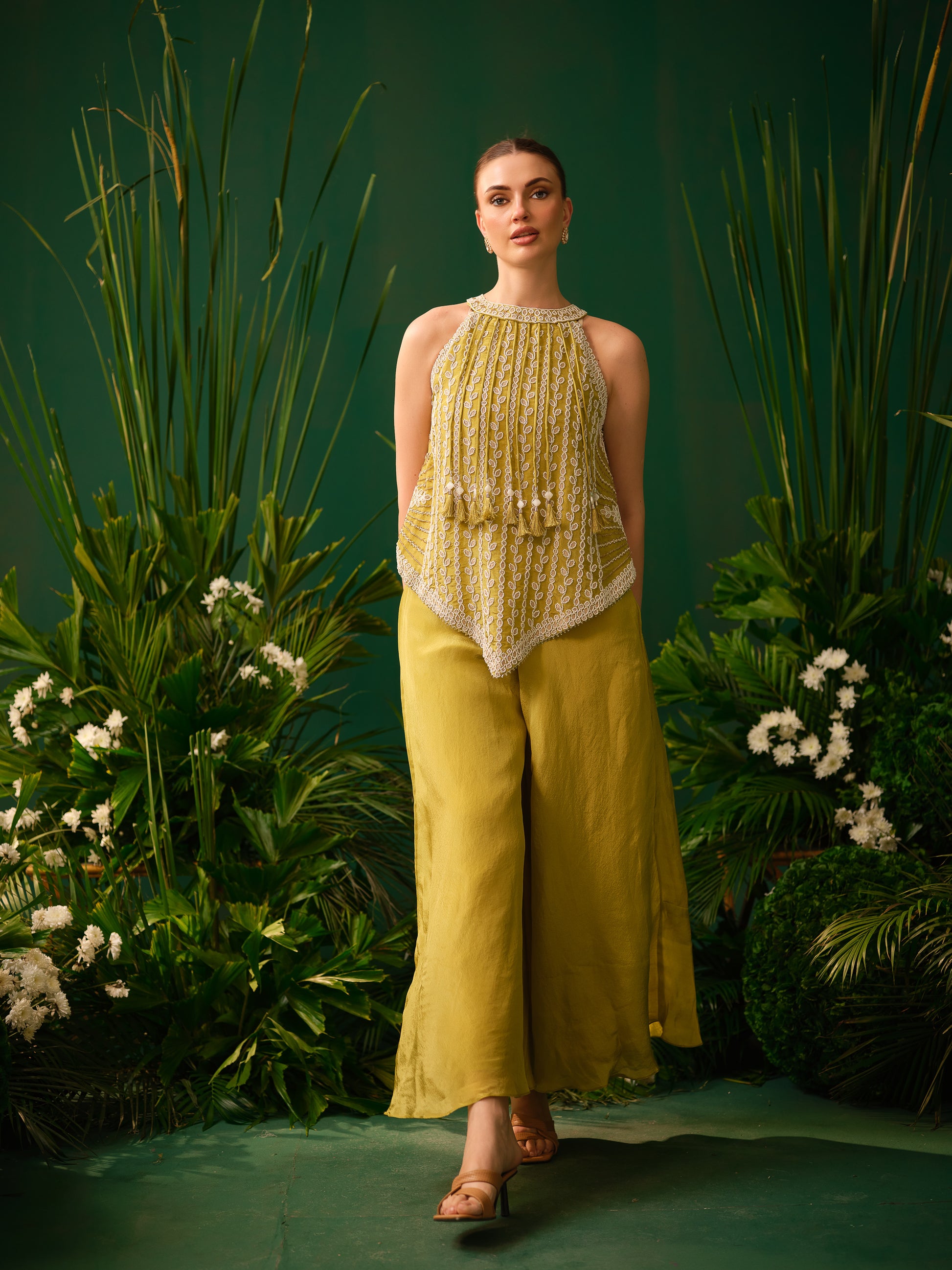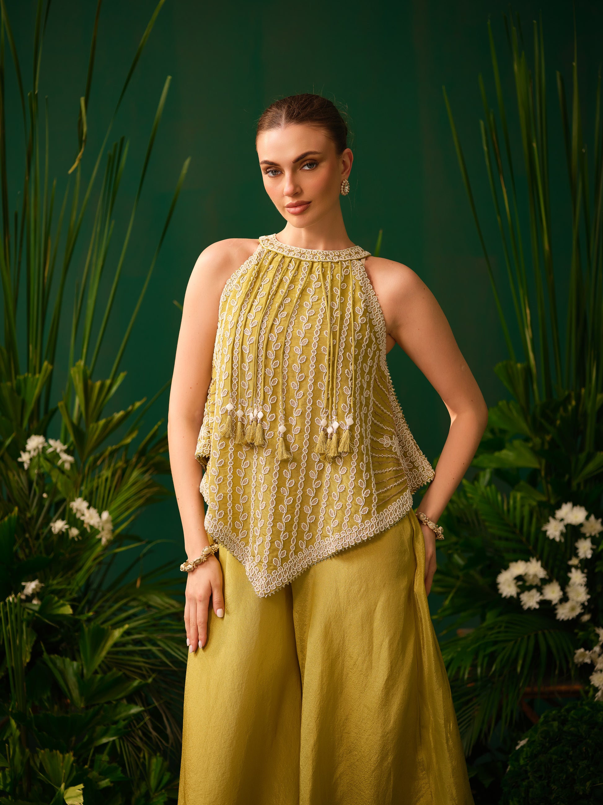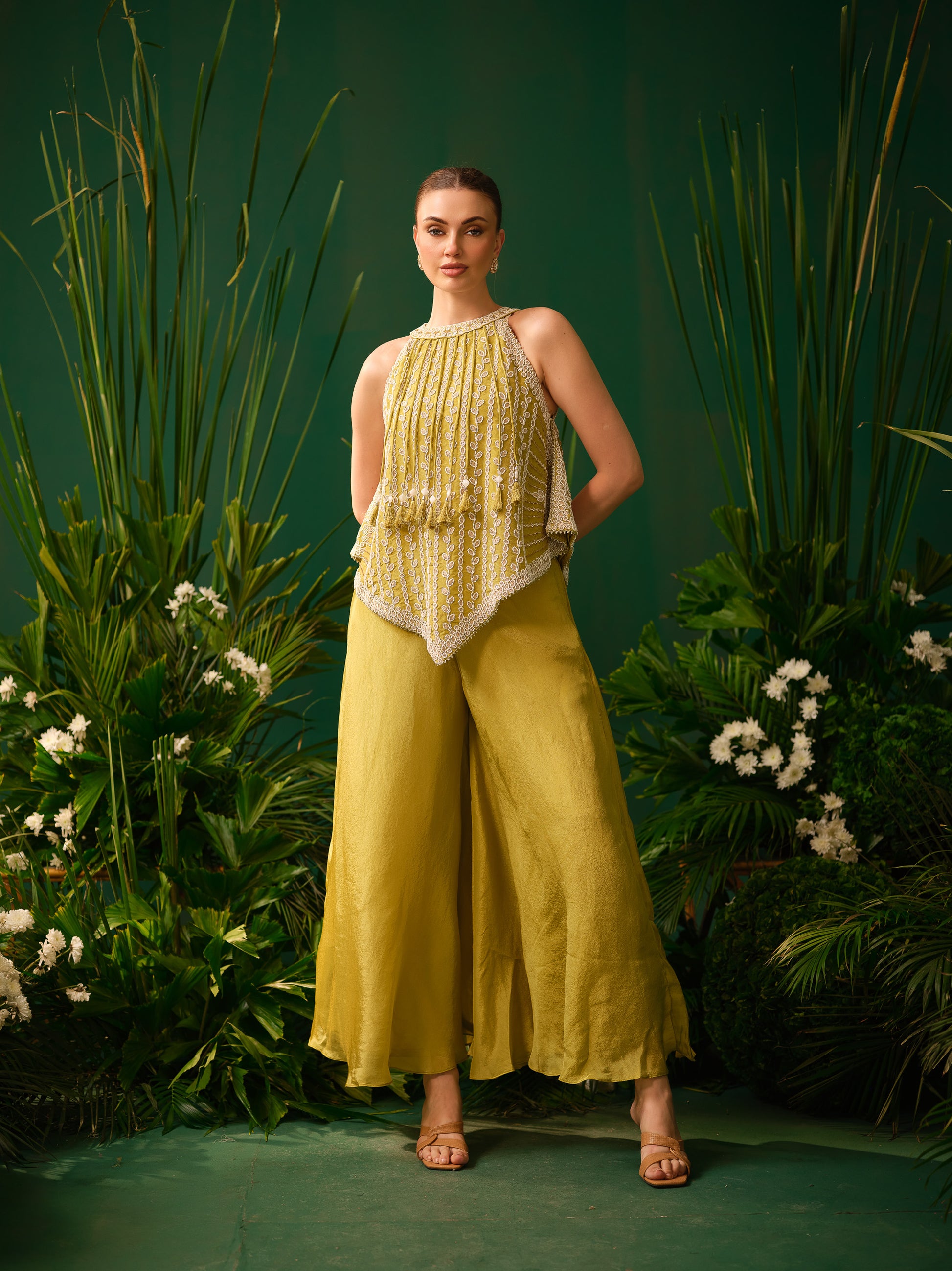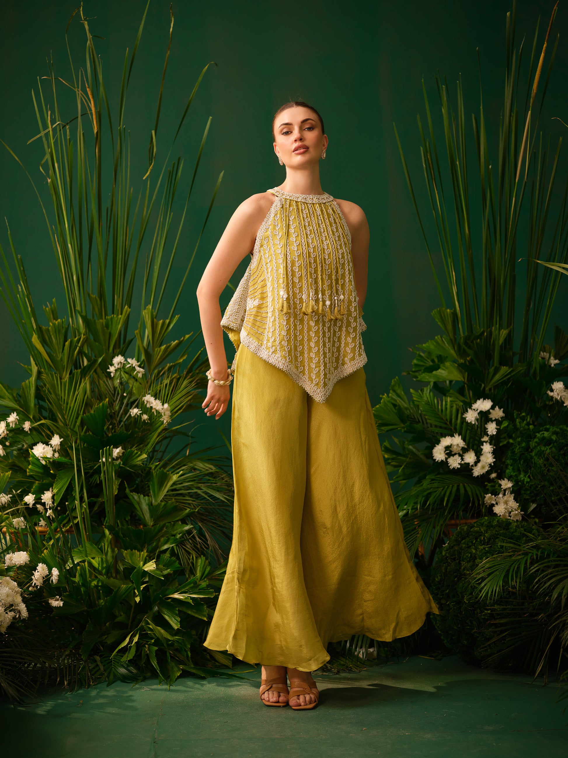 This contemporary coord set features a mustard yellow halter-style top paired with wide-leg palazzo pants. The top is adorned with delicate lace and tassel detailing, adding a playful yet elegant touch. The flowy silhouette ensures comfort while maintaining a chic look. The minimal design is elevated with subtle textures and finishes. Perfect for modern festive occasions or intimate gatherings. The outfit blends Indo-western aesthetics seamlessly. Its breathable fabric makes it ideal for warm weather events. A stylish choice for those who prefer fusion wear.