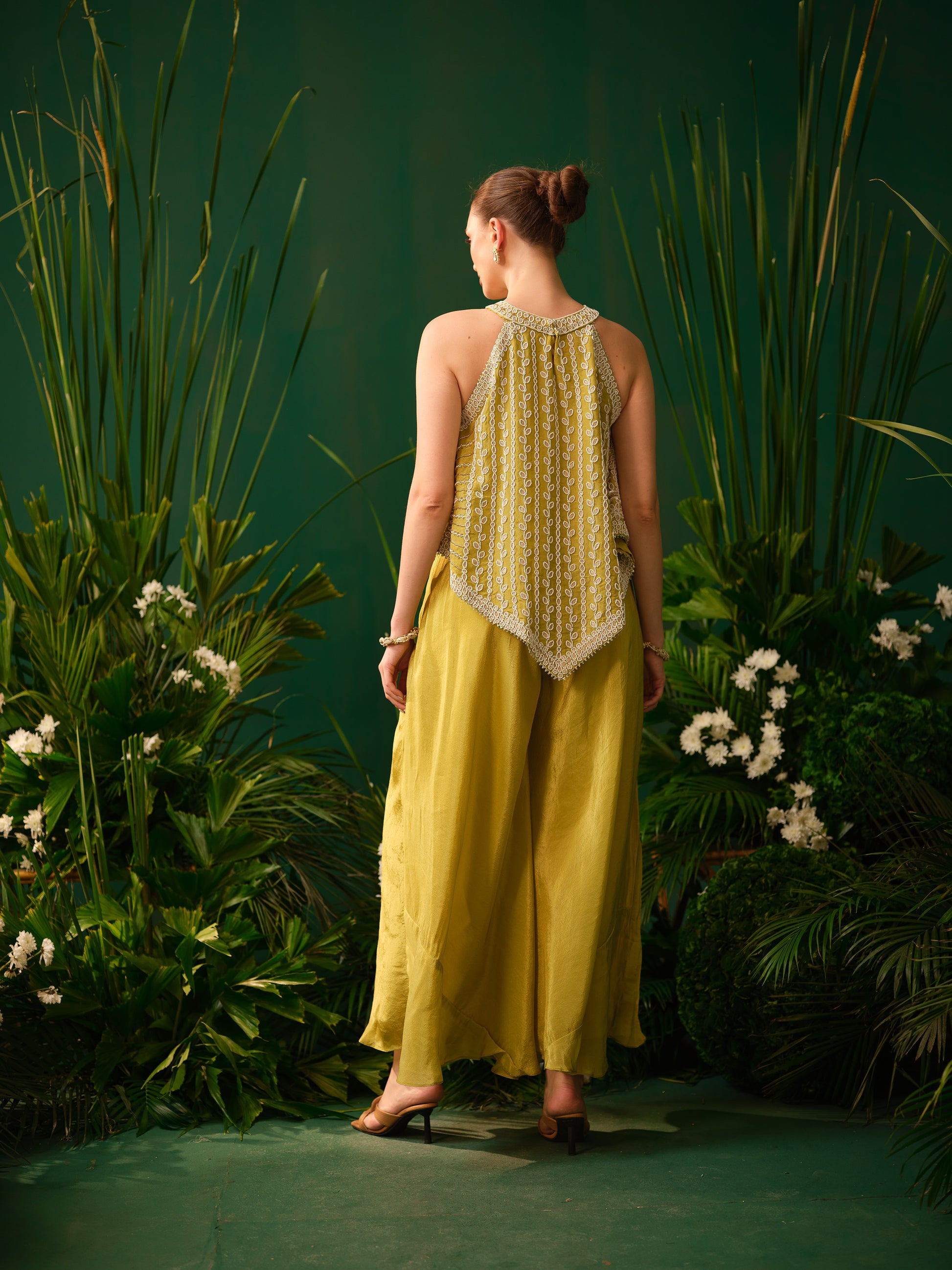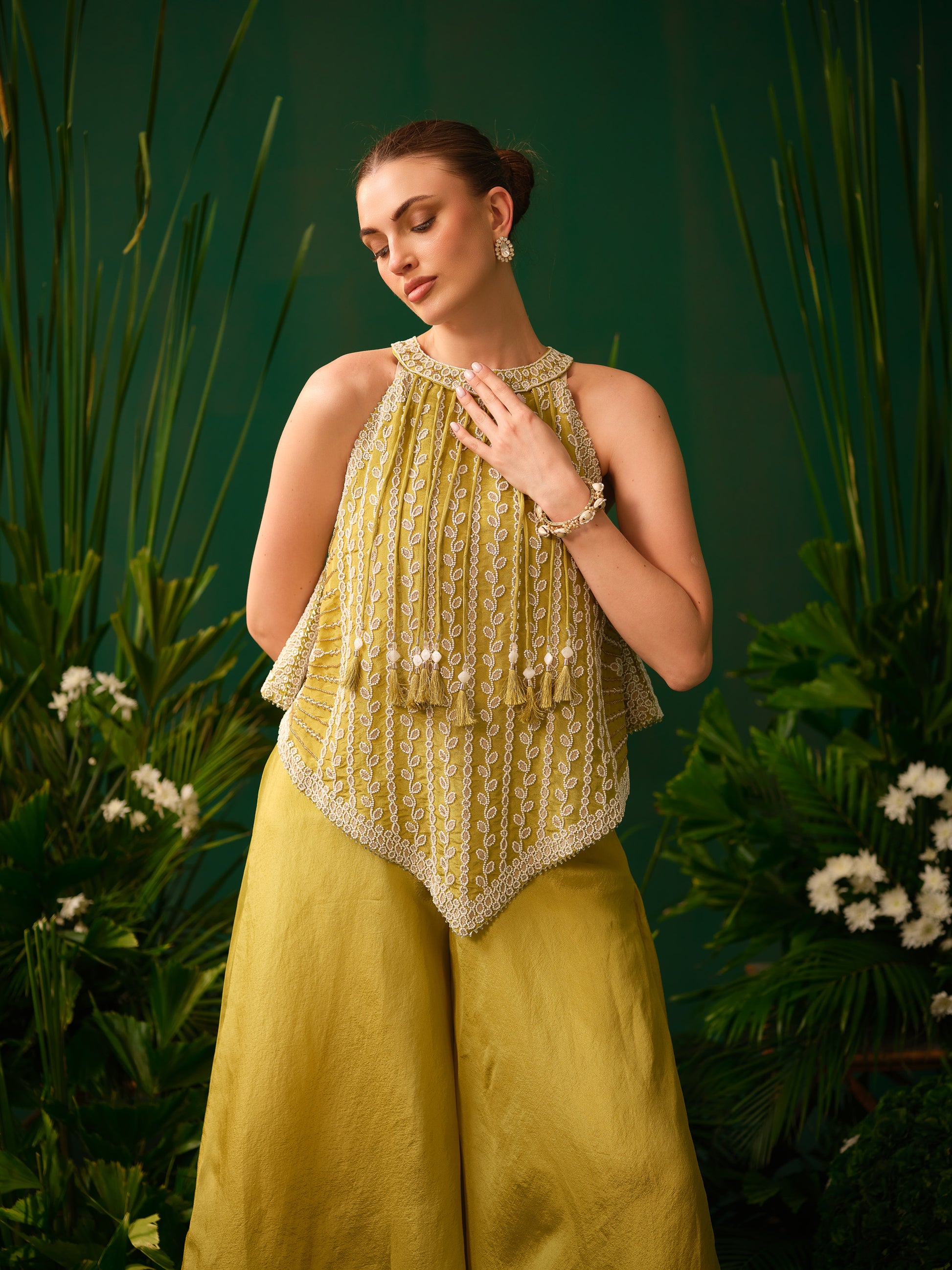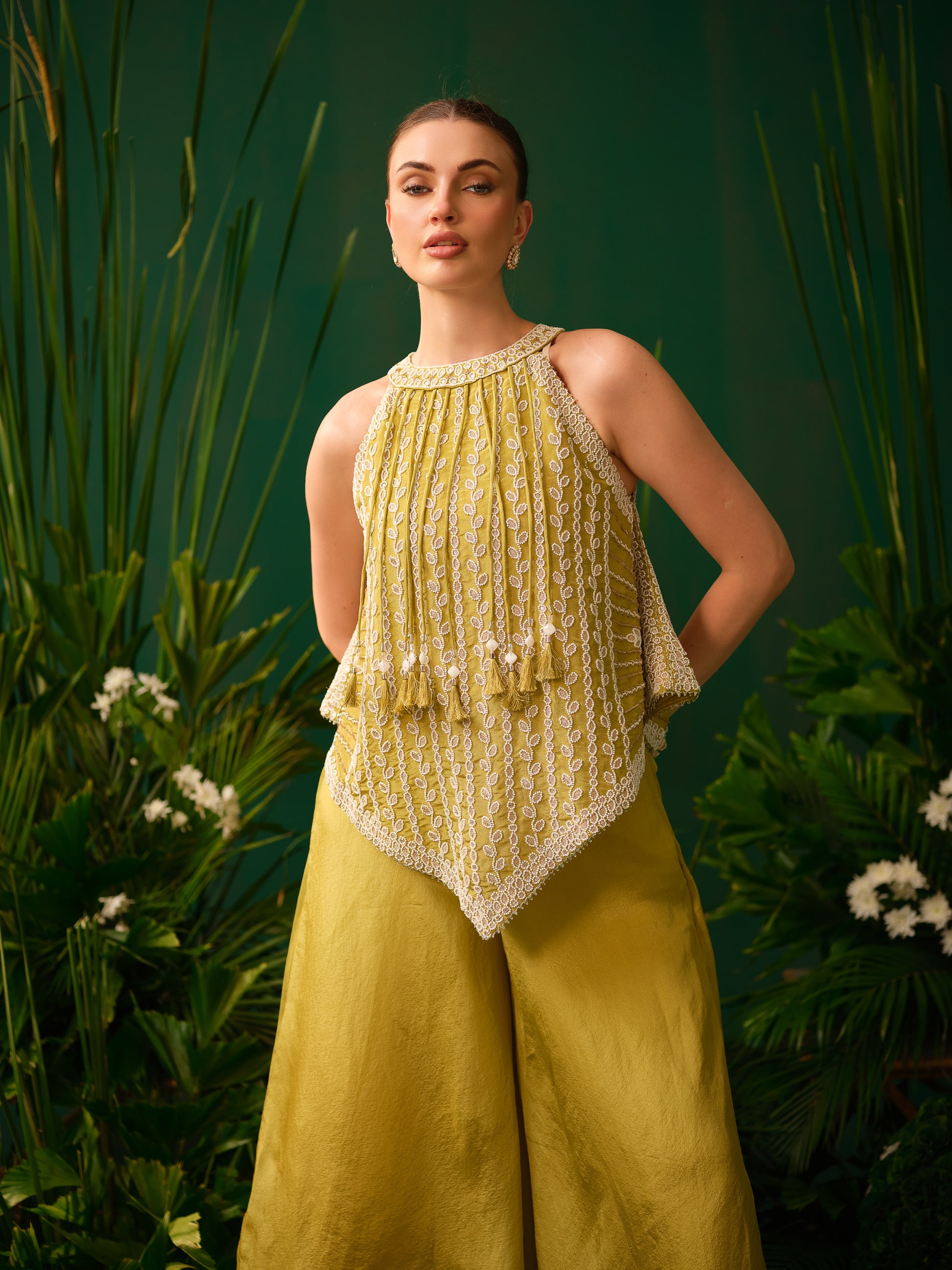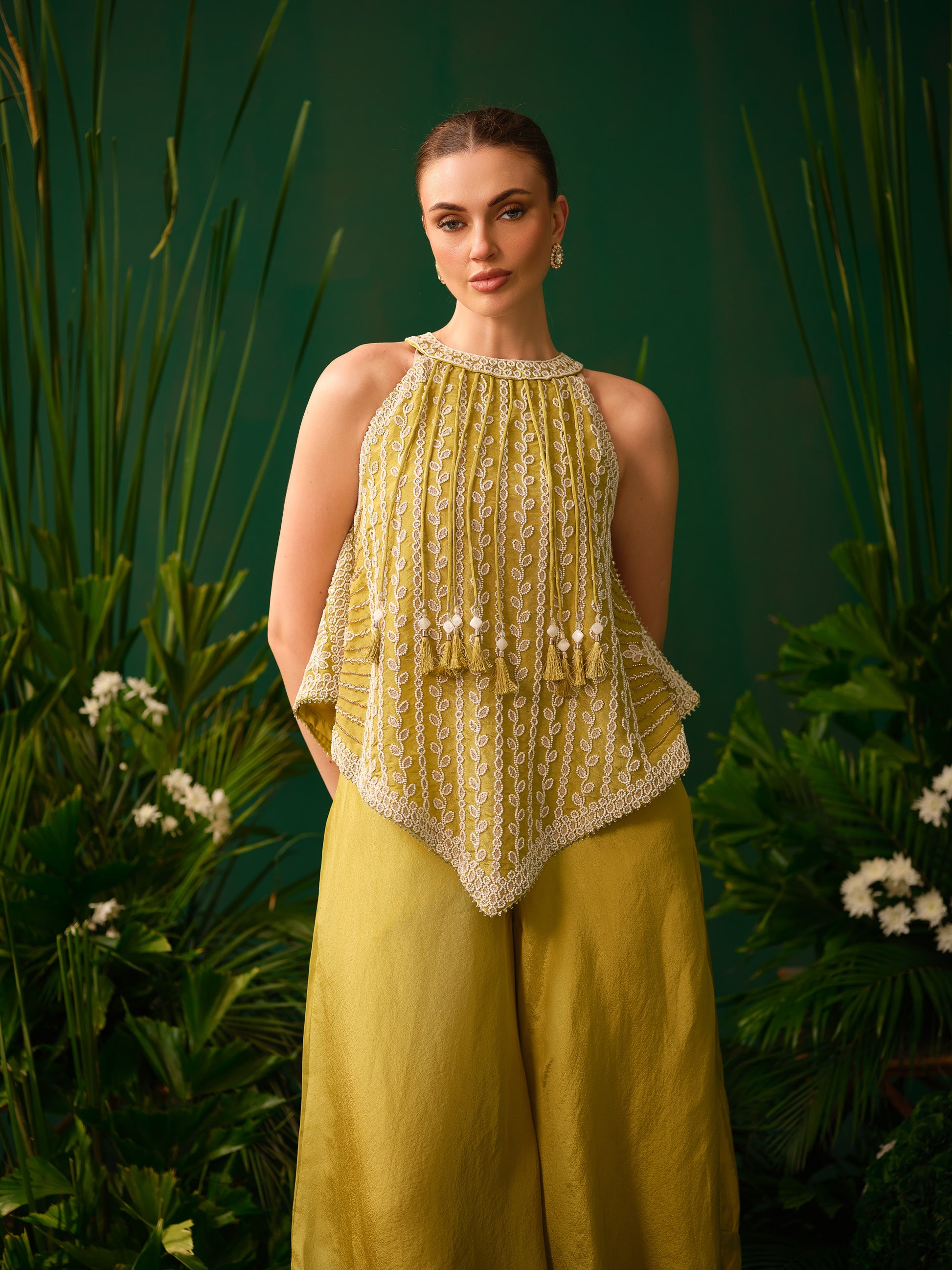 This contemporary coord set features a mustard yellow halter-style top paired with wide-leg palazzo pants. The top is adorned with delicate lace and tassel detailing, adding a playful yet elegant touch. The flowy silhouette ensures comfort while maintaining a chic look. The minimal design is elevated with subtle textures and finishes. Perfect for modern festive occasions or intimate gatherings. The outfit blends Indo-western aesthetics seamlessly. Its breathable fabric makes it ideal for warm weather events. A stylish choice for those who prefer fusion wear.