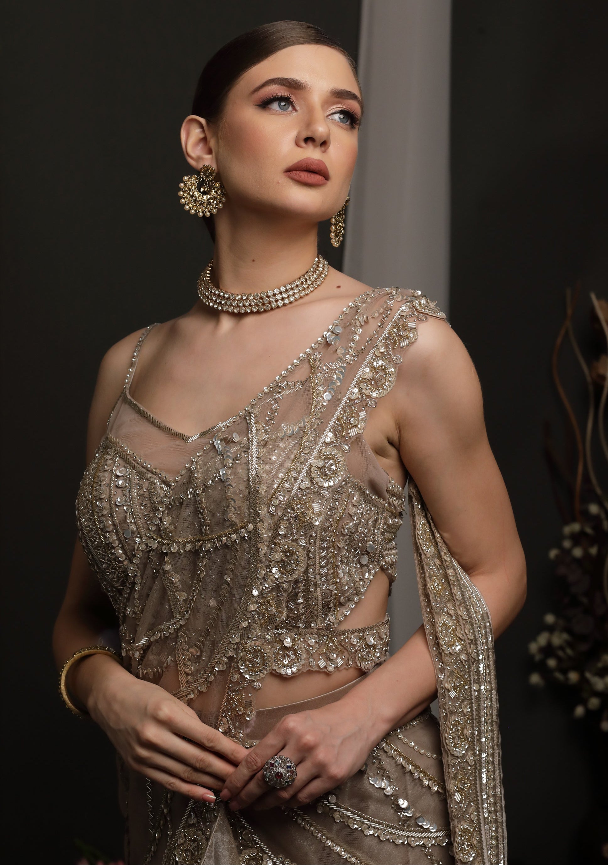 A contemporary fusion lehenga-gown featuring an asymmetrical layered skirt in satin silk, paired with a heavily embellished blouse and draped pallu-style panel. Intricate hand embroidery with sequins and beads runs across the bodice and drape, creating a shimmering effect.