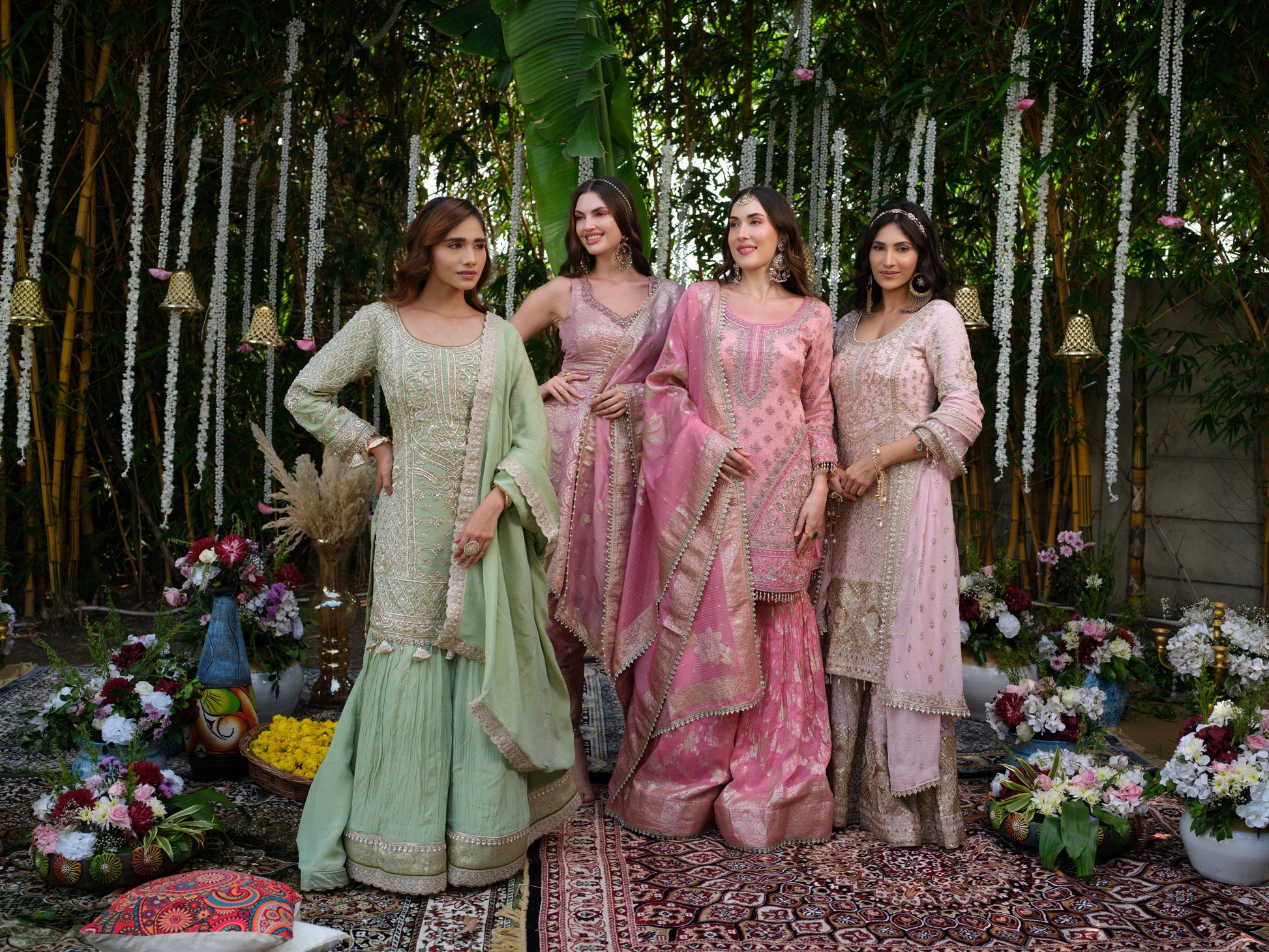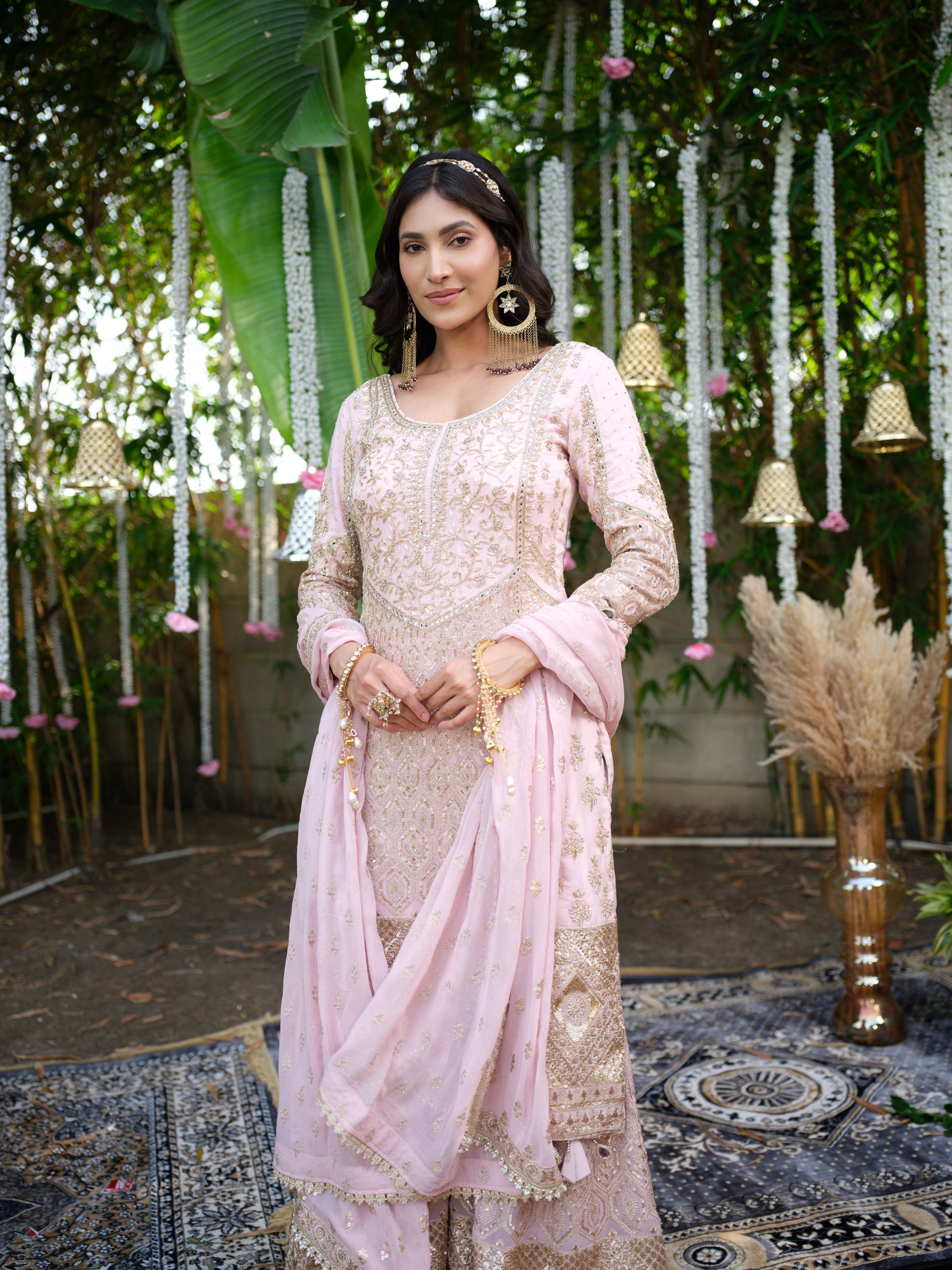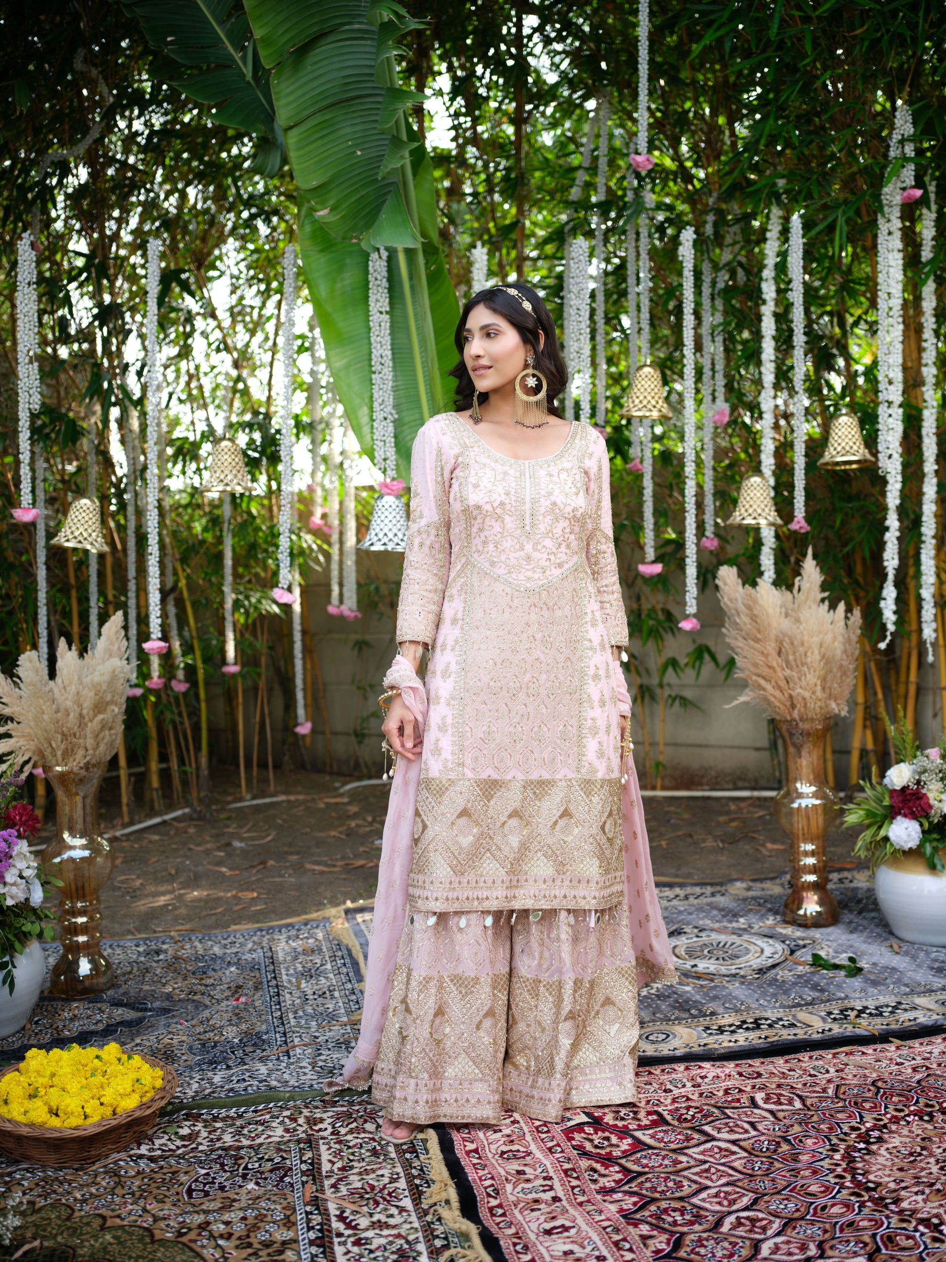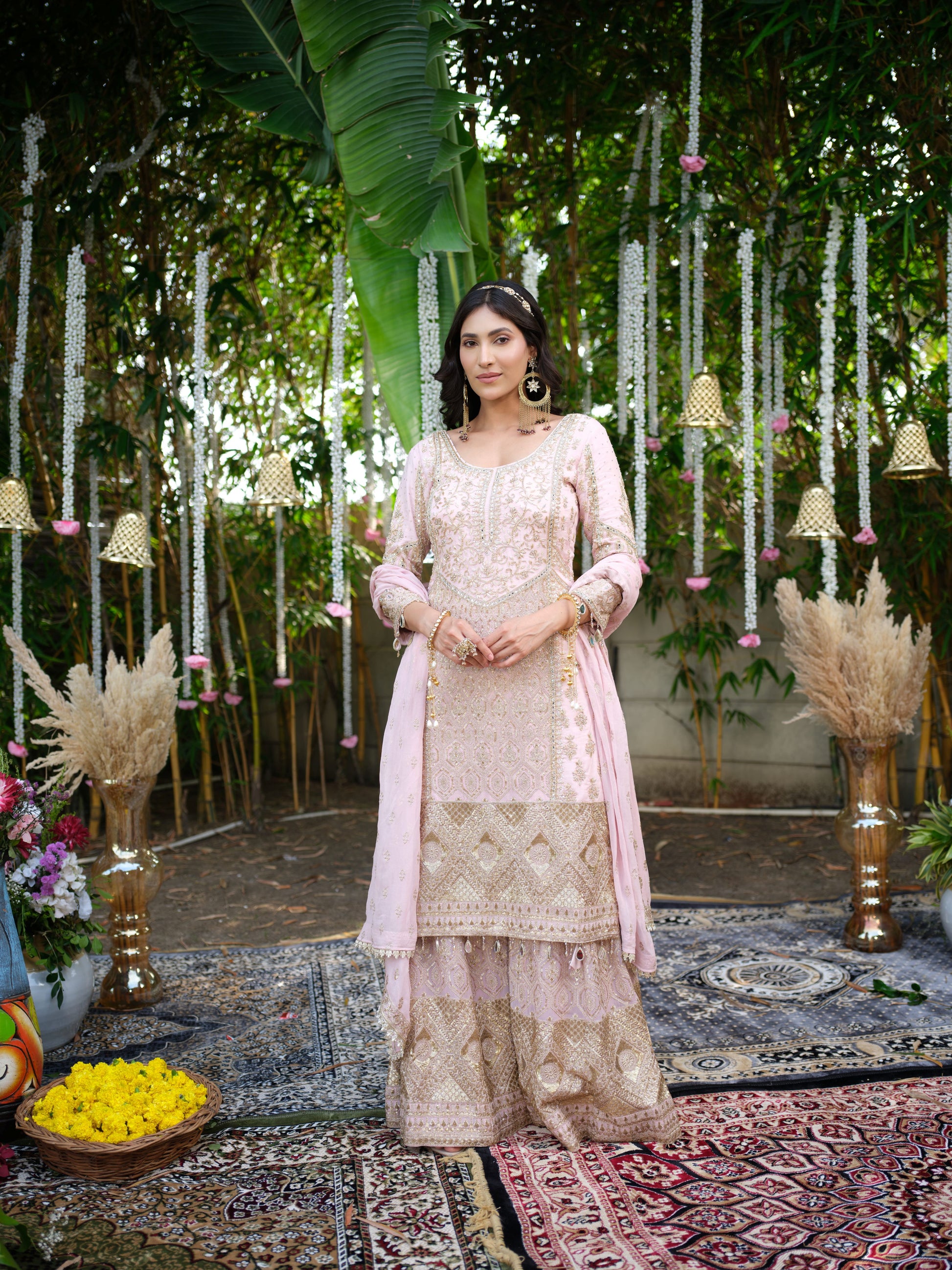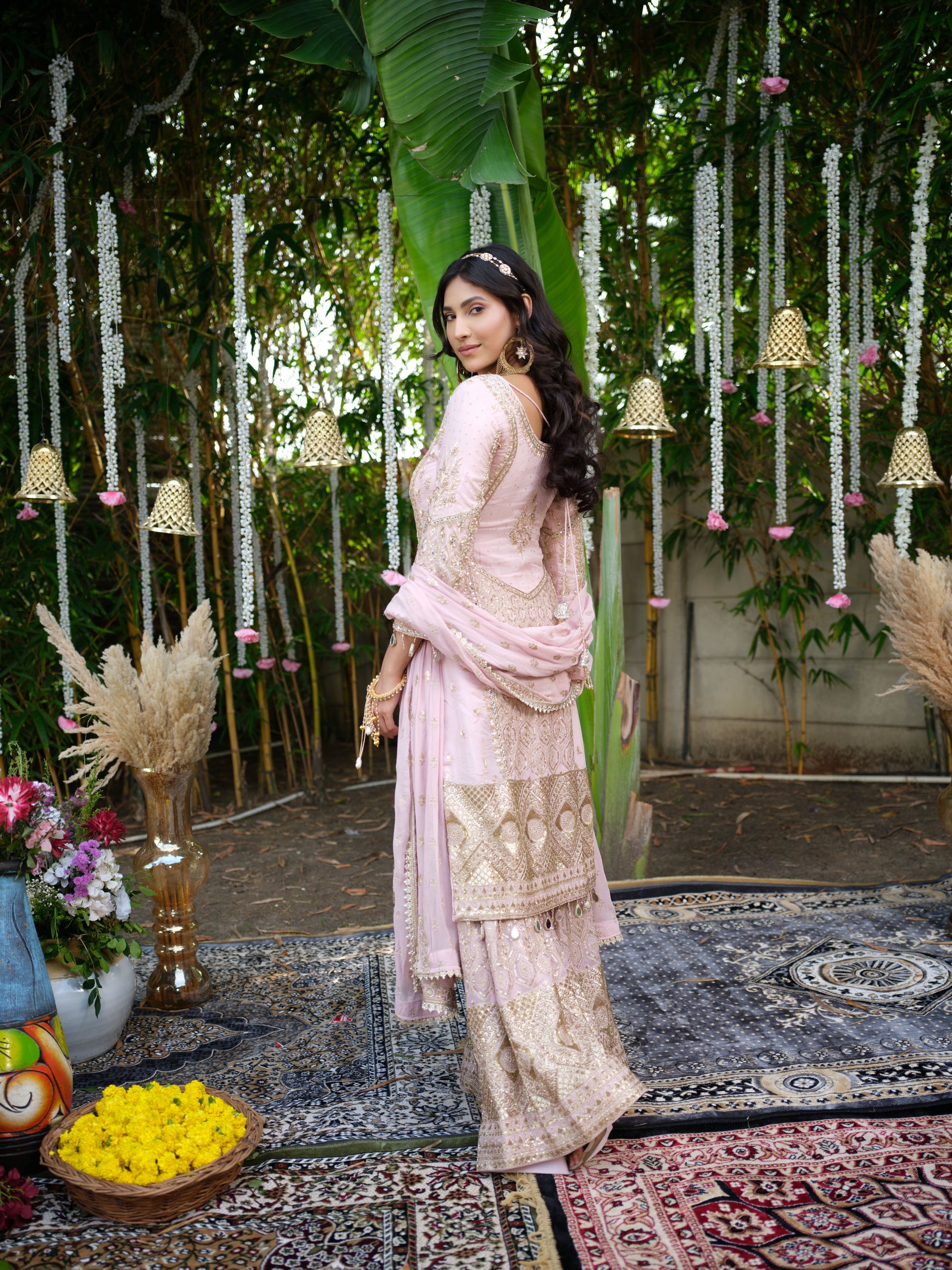 Delicate and regal, this blush pink sharara set is adorned with intricate zari and sequin embroidery across the kurta, beautifully complemented by a golden-bordered sharara and dupatta. The soft pastel hue paired with exquisite detailing makes it a perfect ensemble for wedding festivities, mehendi ceremonies, or festive soirées.