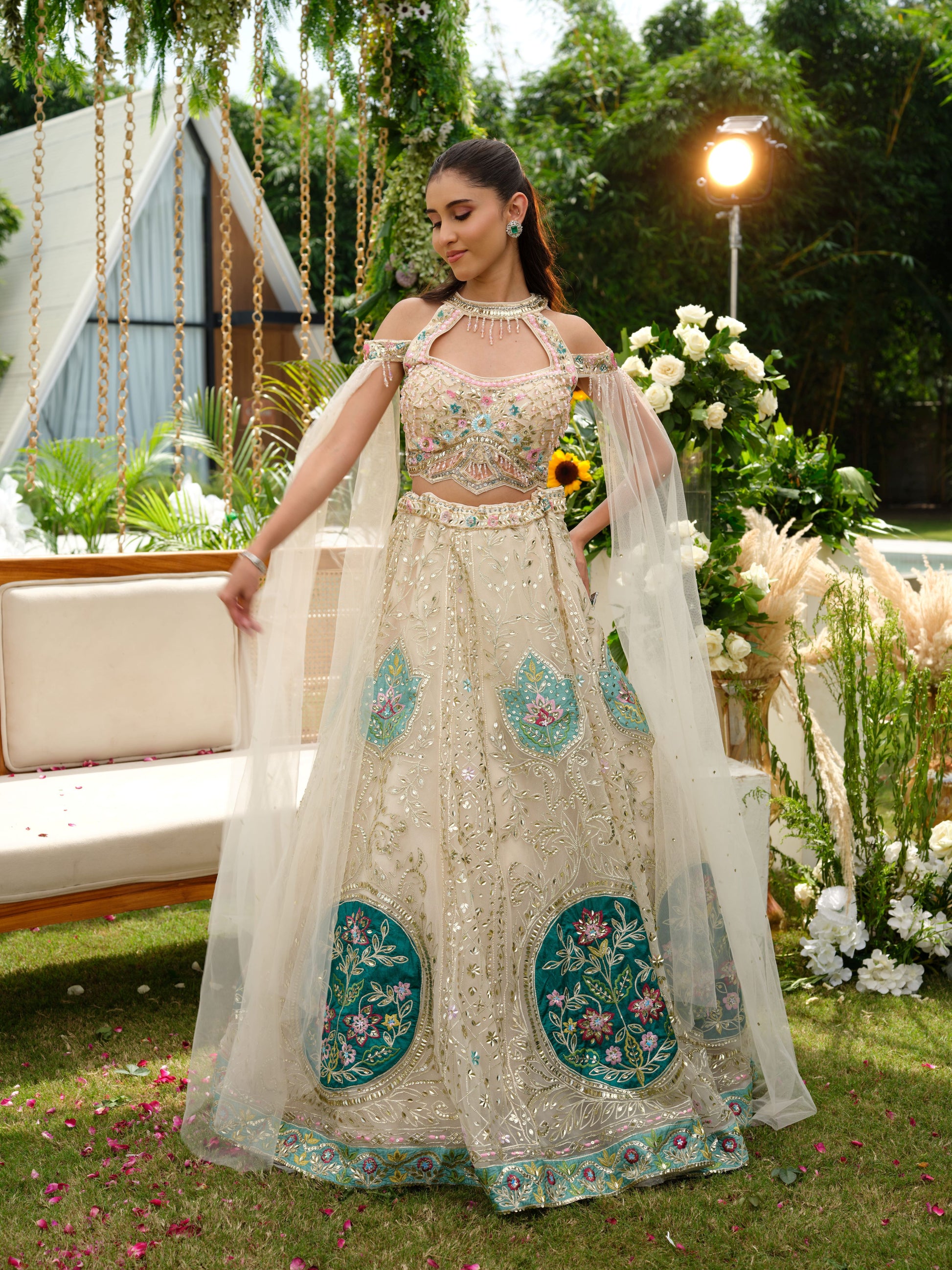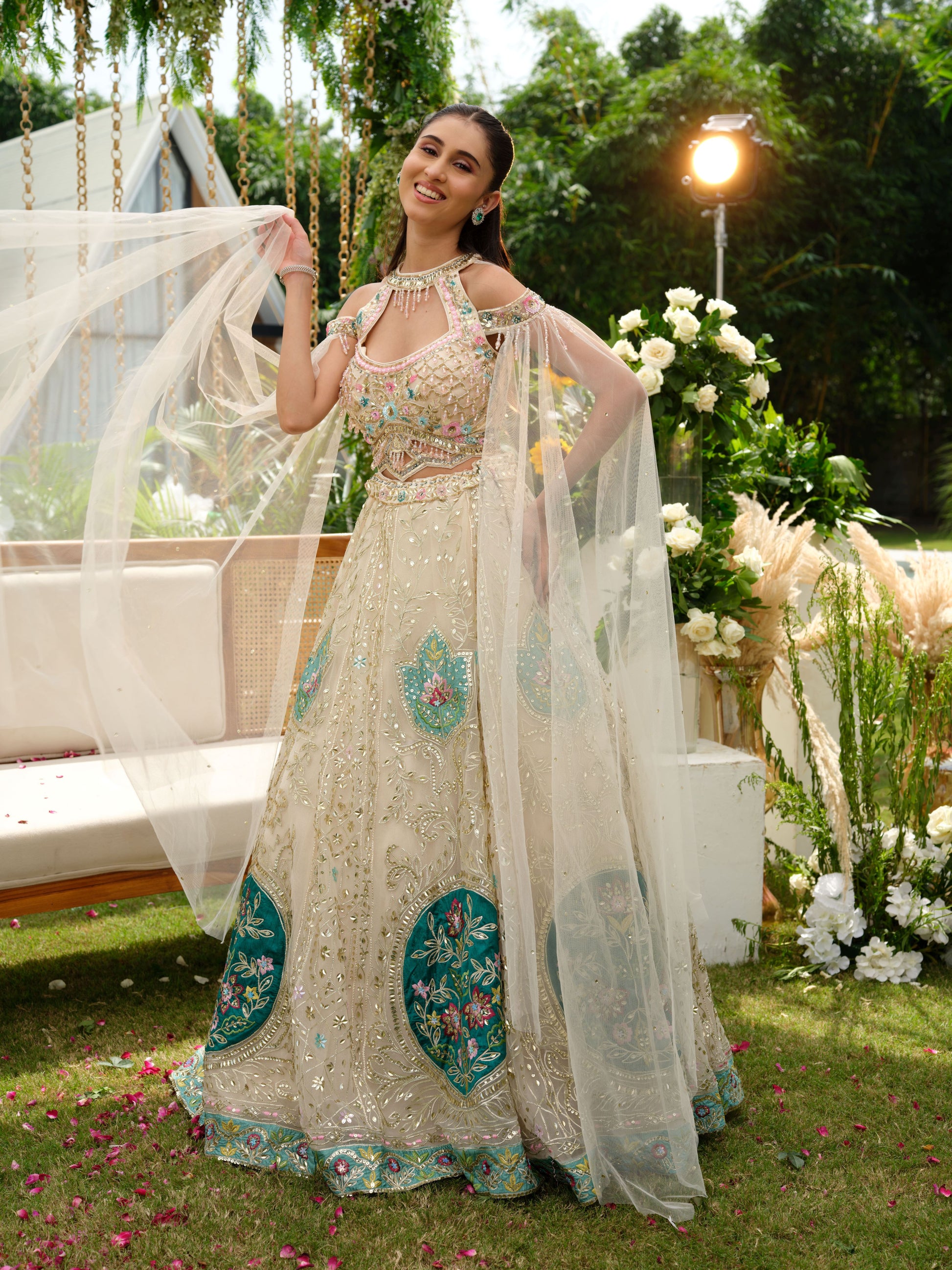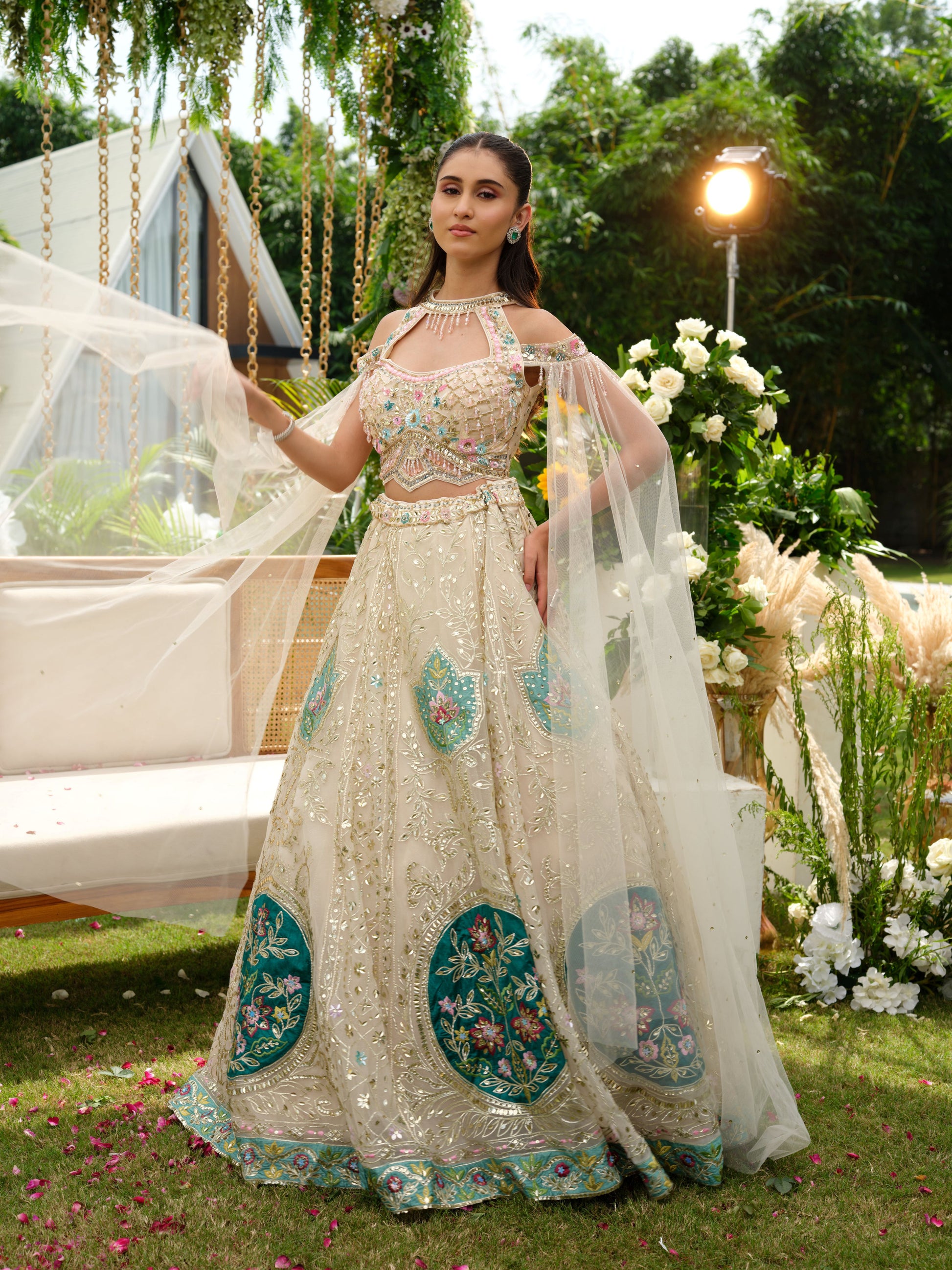 Elegance takes center stage with this ivory lehenga set accented with teal embroidery. The lehenga features intricate sequin and zari work, beautifully highlighted with bold teal floral panels that bring a striking contrast. The delicately embroidered blouse and sheer dupatta with subtle detailing add finesse, making this ensemble a true blend of tradition and modern artistry.