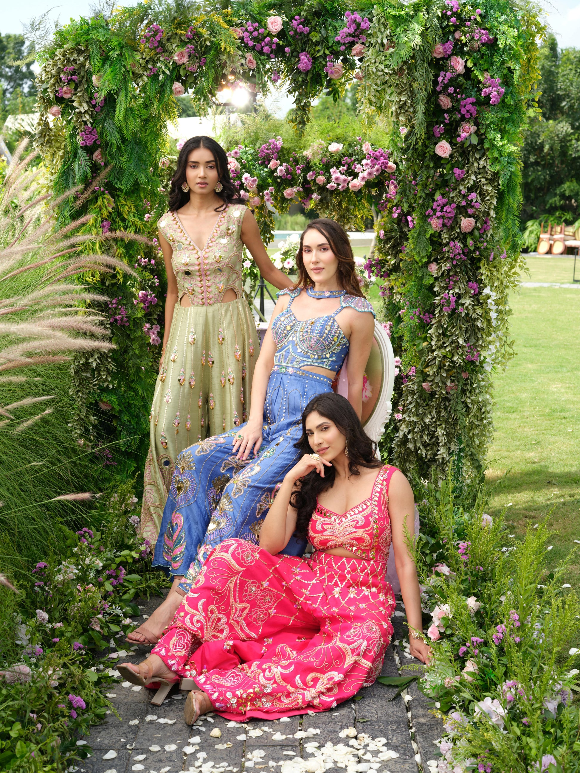 A stunning sleeveless indo-western jumpsuit crafted in pastel lime green, adorned with delicate floral embellishments, intricate beadwork, and shimmering sequins. The wide-legged silhouette features detailed embroidery along the hemline, giving it a graceful flow. The fitted bodice with a deep neckline adds elegance, while the embellishments create a soft, ethereal charm.