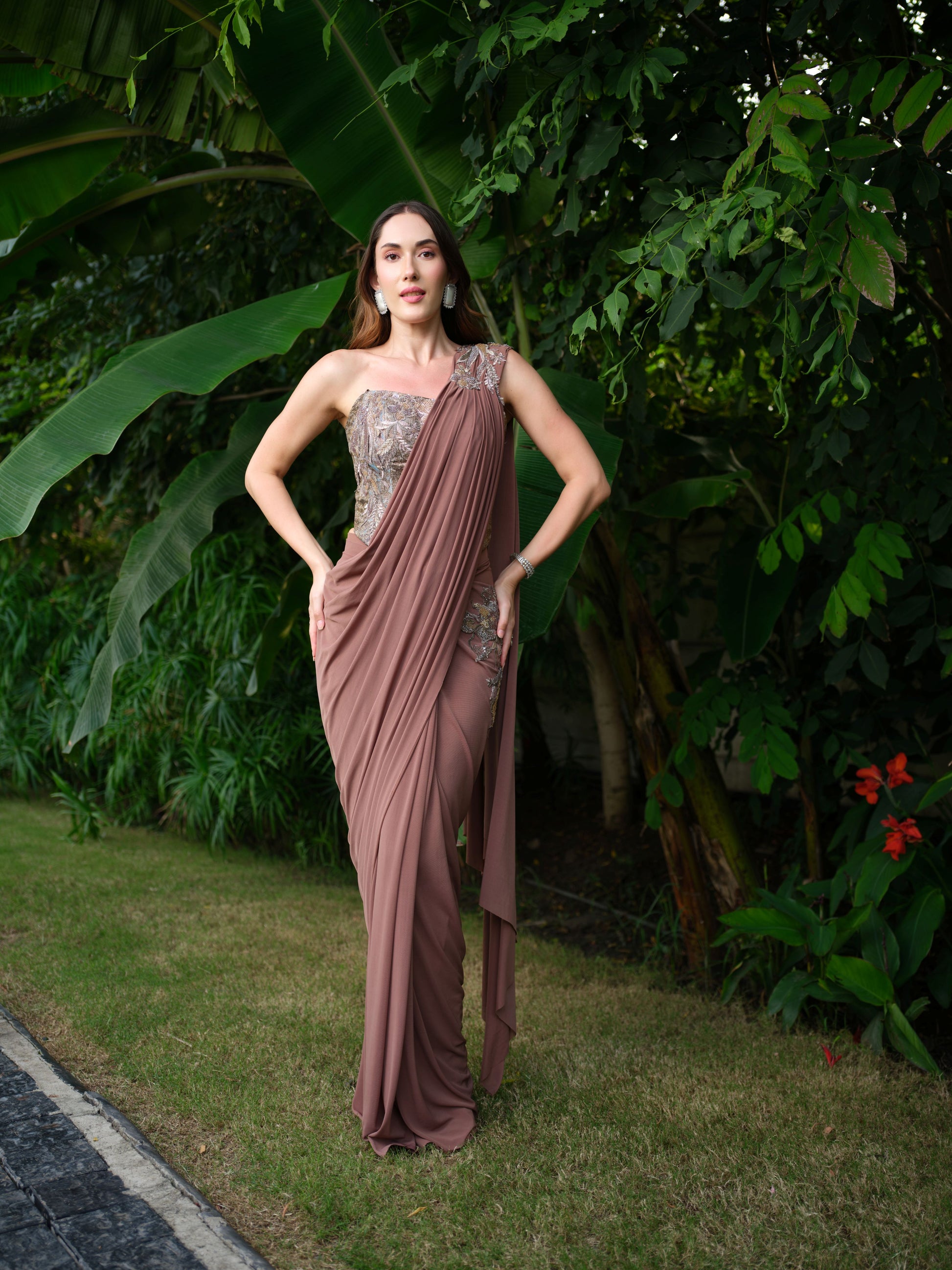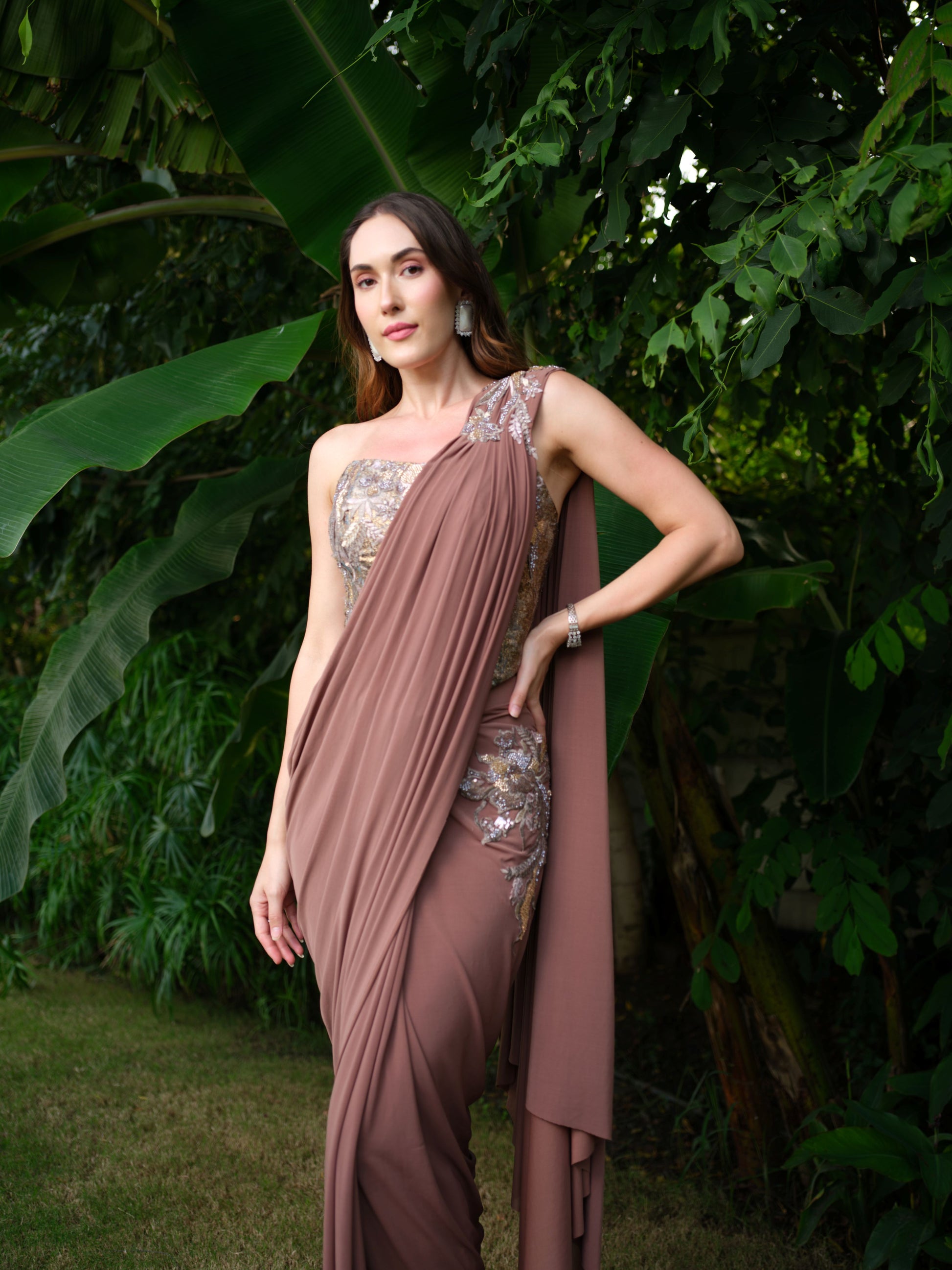 This ensemble features an elegant fusion of a saree. The base is a shimmering sequined one-shoulder blouse in tones of champagne gold, beautifully adorned with intricate embellishments. Draped over it is a rich, earthy mauve-brown pleated fabric, flowing gracefully in the style of a saree pallu, giving it a structured yet fluid silhouette. The embellishment at the shoulder adds a regal highlight, making the outfit glamorous yet sophisticated.