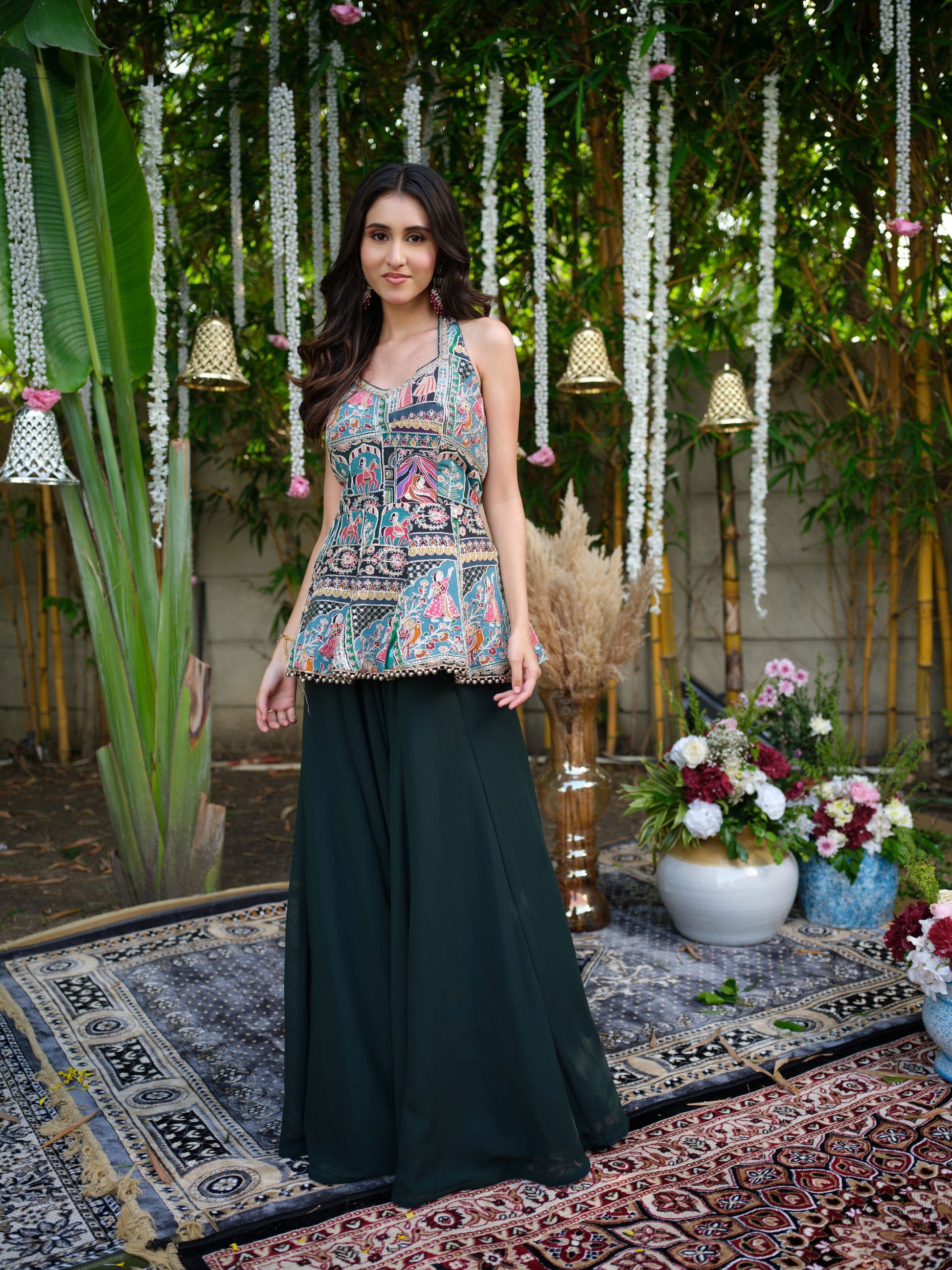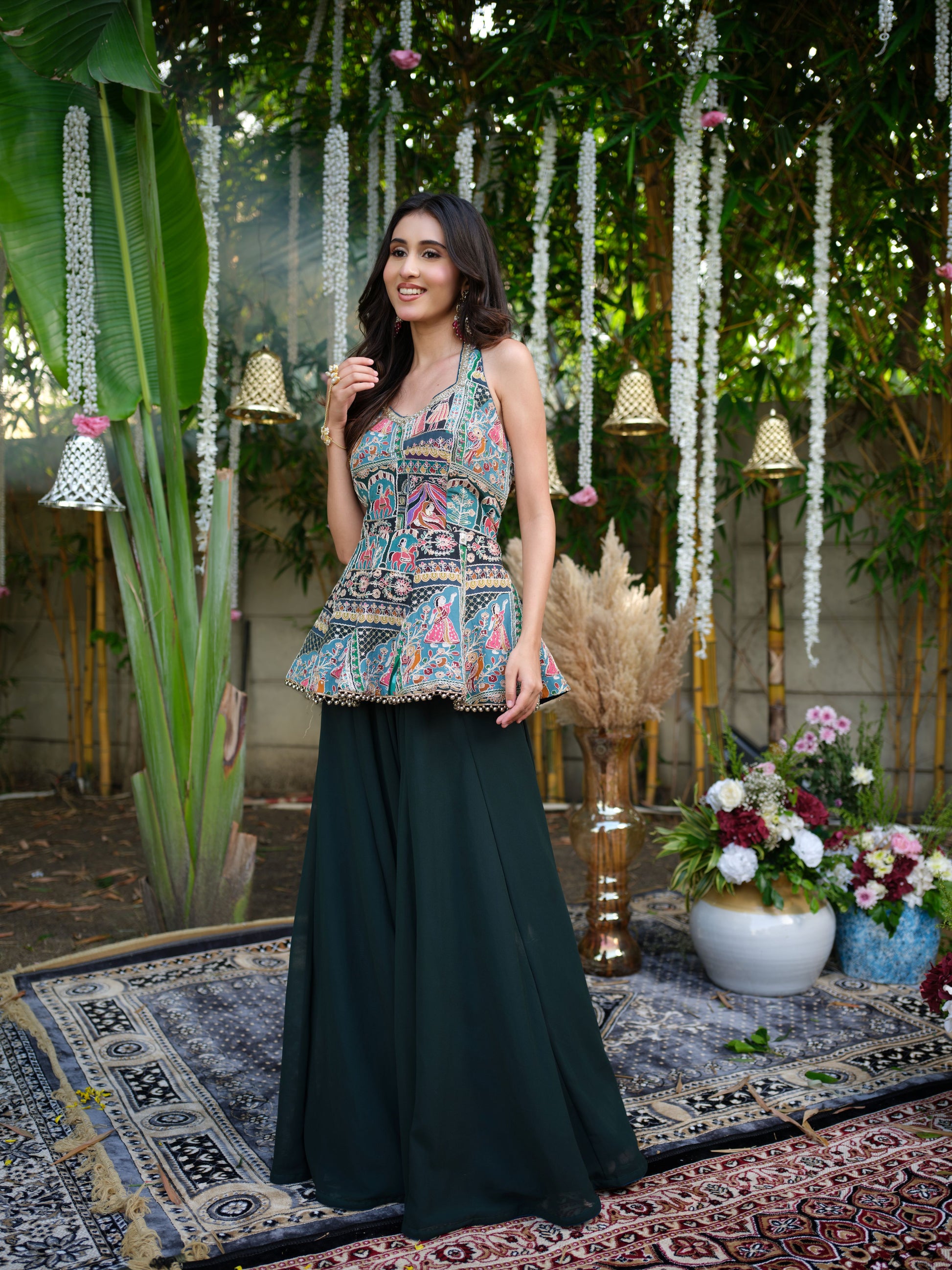 Celebrate modern elegance with a touch of tradition in this printed peplum-style top paired with flowing dark green palazzo pants. The intricate folk-inspired print adds a unique artisanal charm, while the structured yet breezy silhouette ensures comfort with style. A versatile ensemble, perfect for mehendi brunches, festive evenings, or contemporary wedding functions.