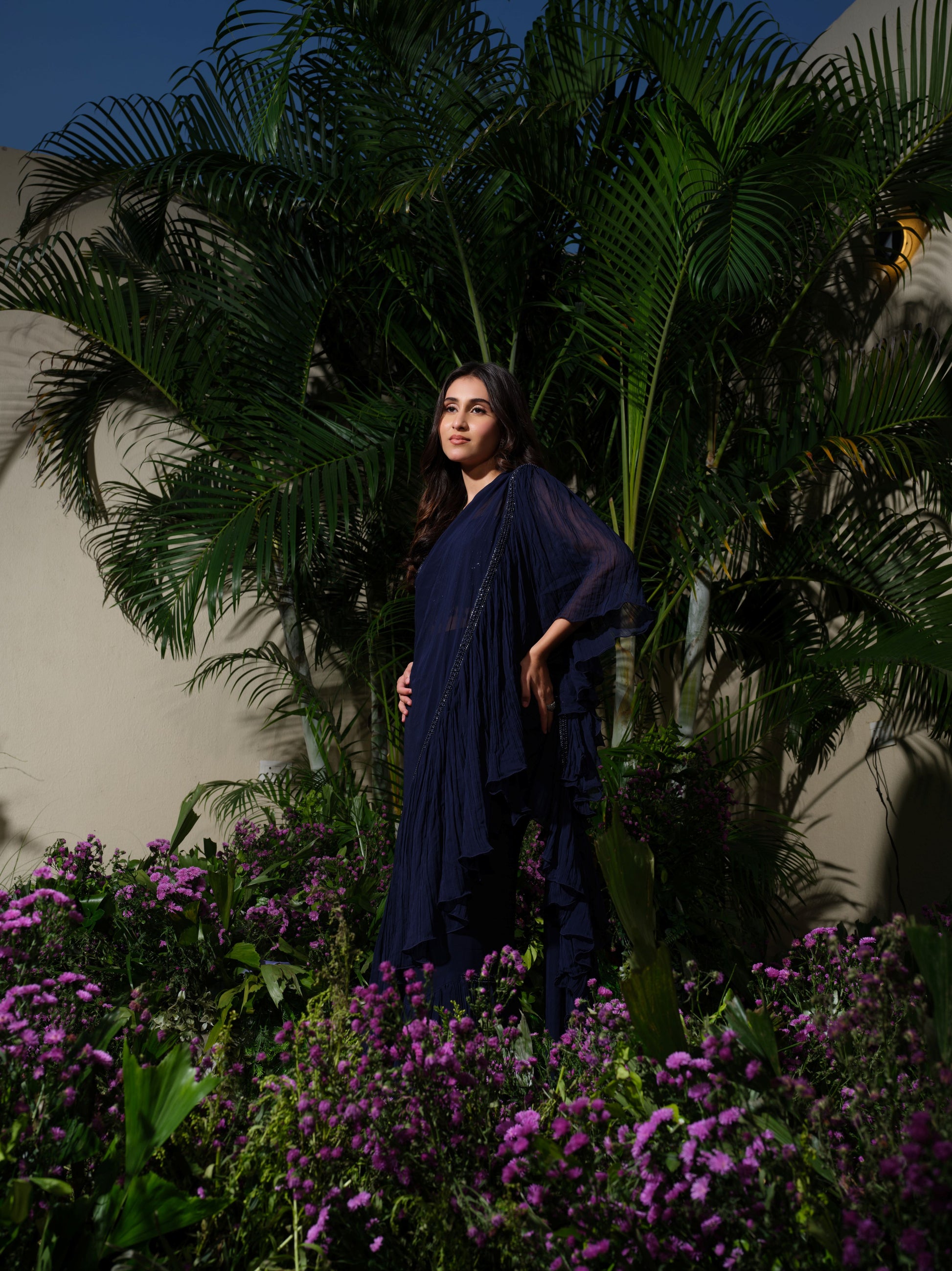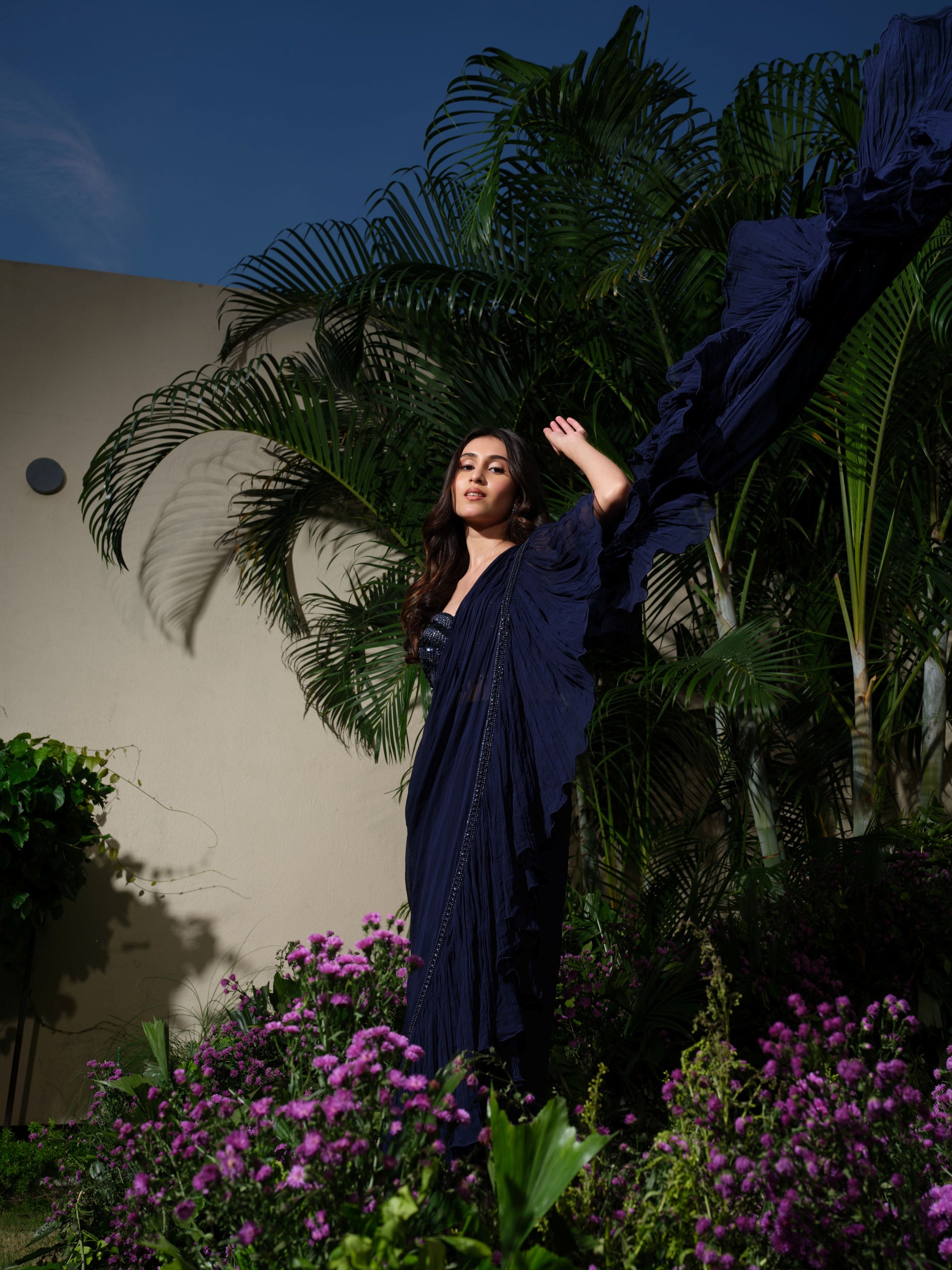 An elegant ruffle saree in deep navy blue, paired with a matching blouse. The saree features cascading ruffle layers and a sleek embellished border, giving it a contemporary yet graceful appeal. Its flowy drape adds drama and sophistication, perfect for making a statement effortlessly.