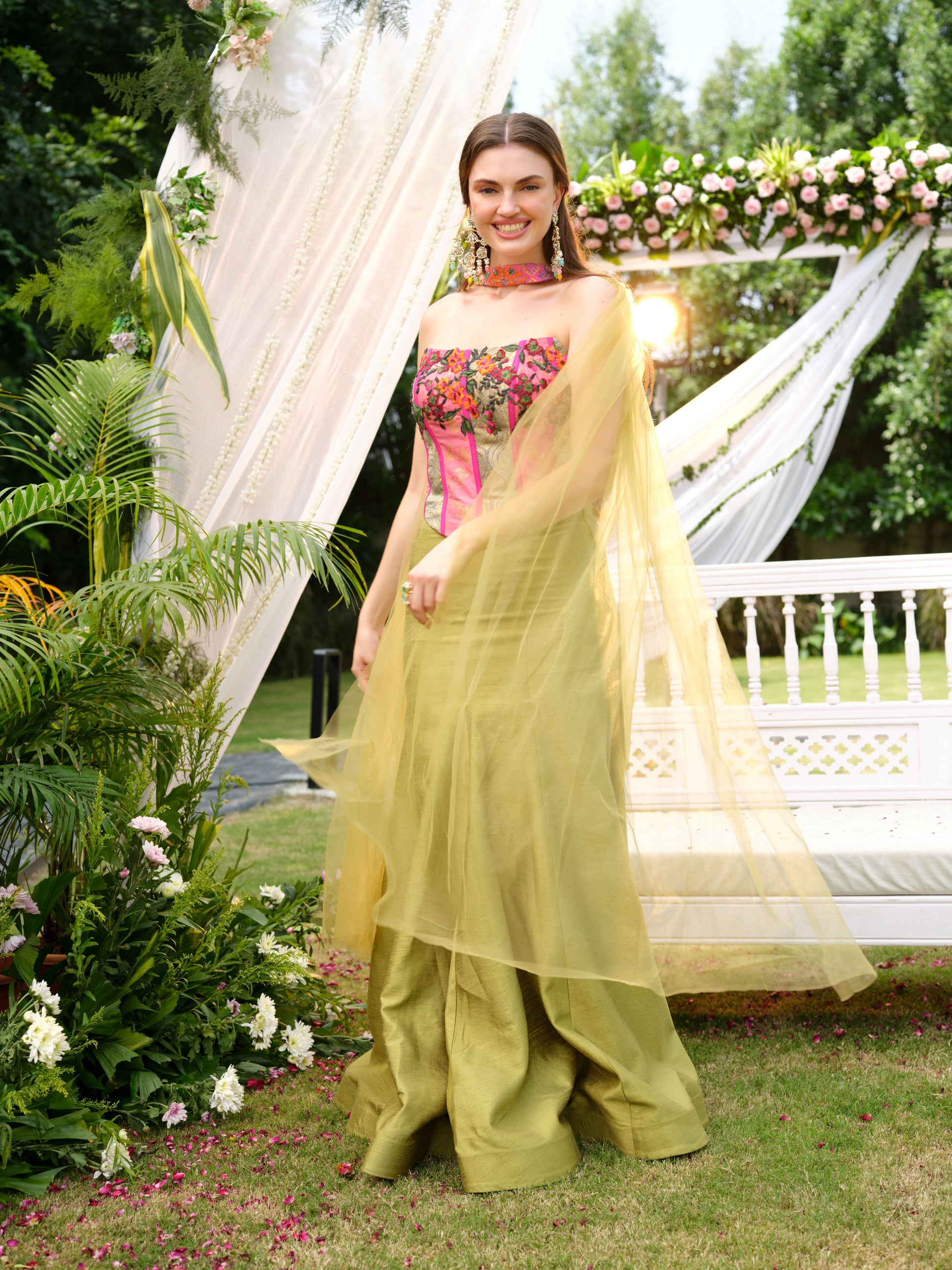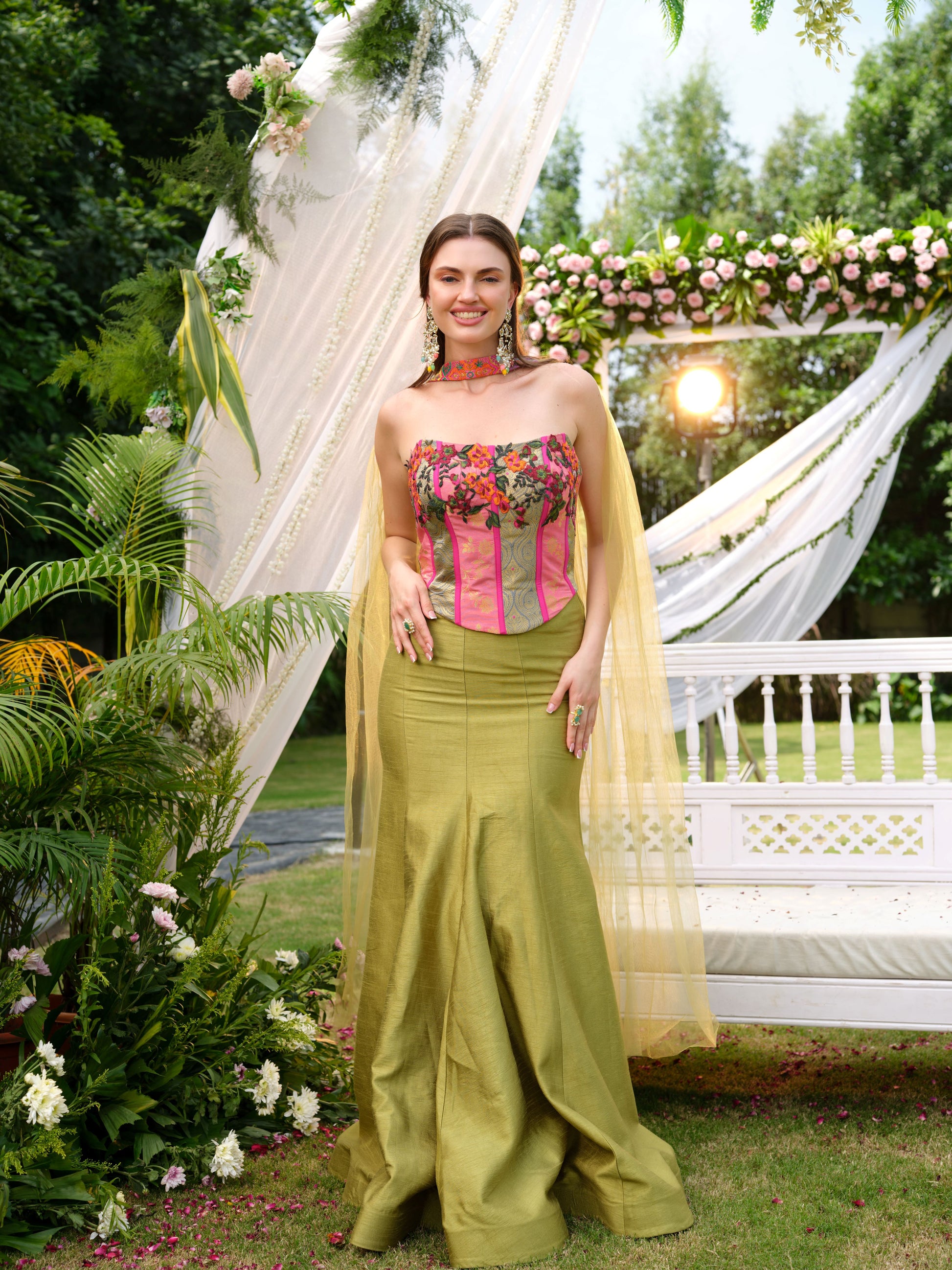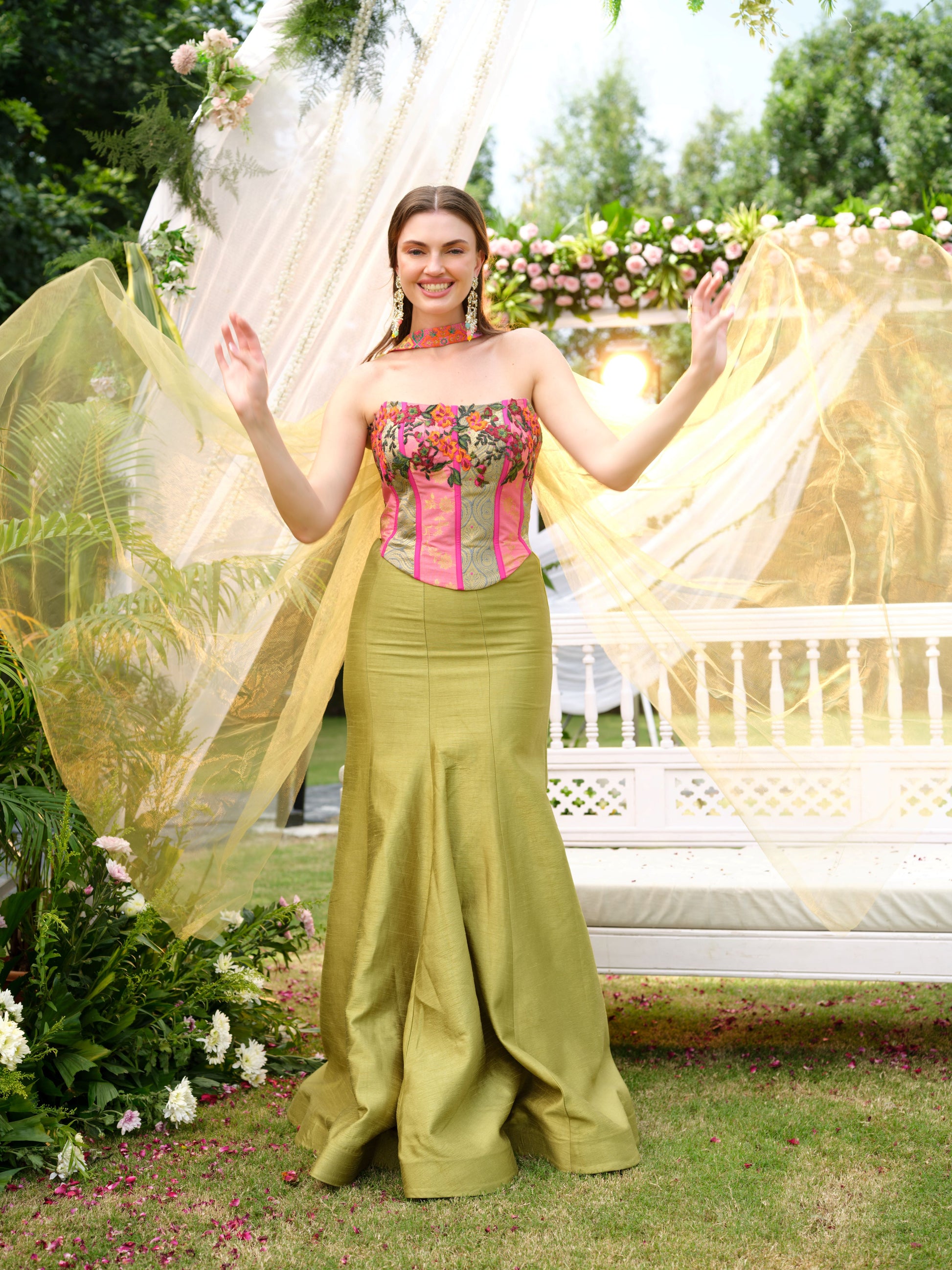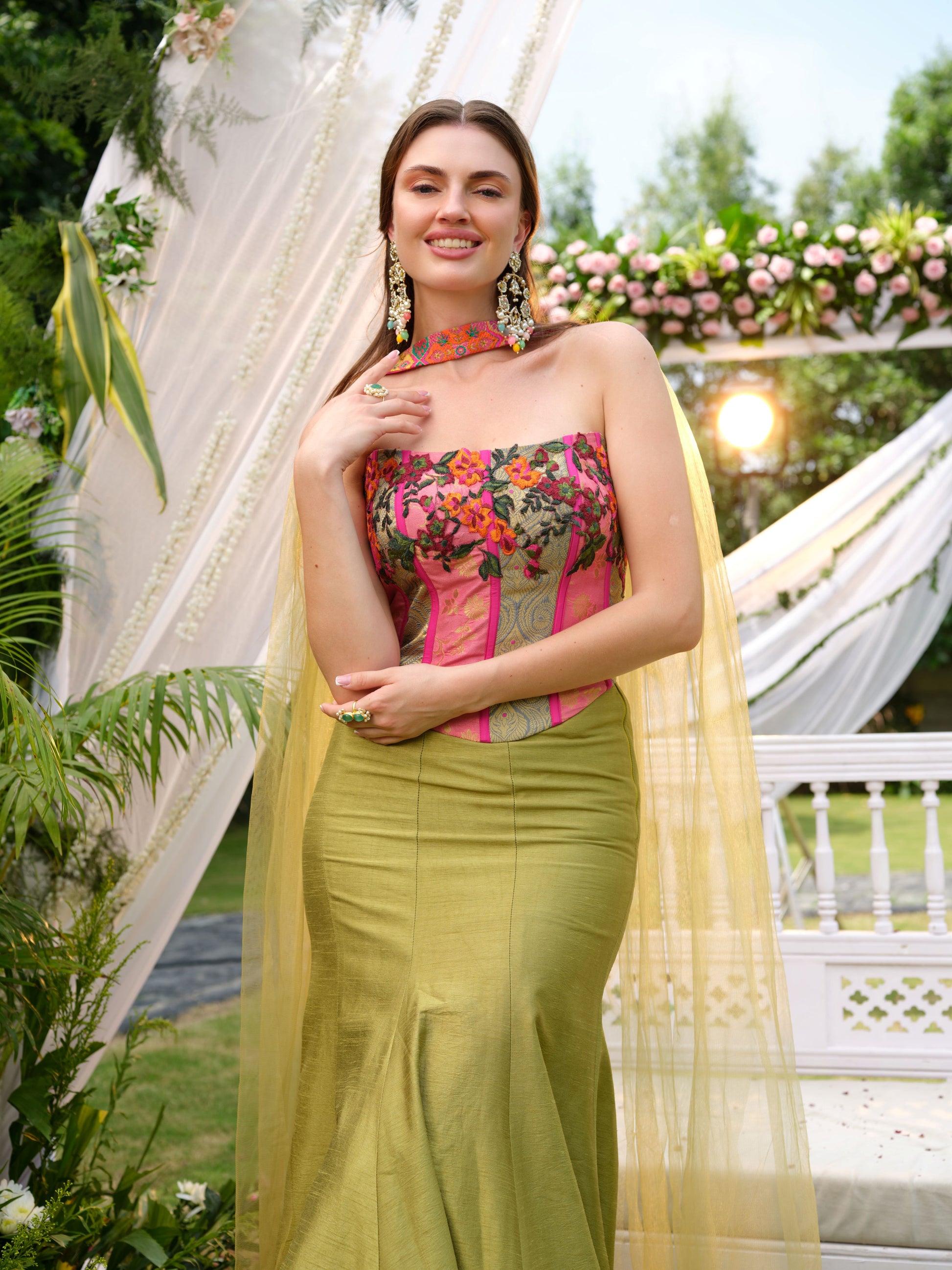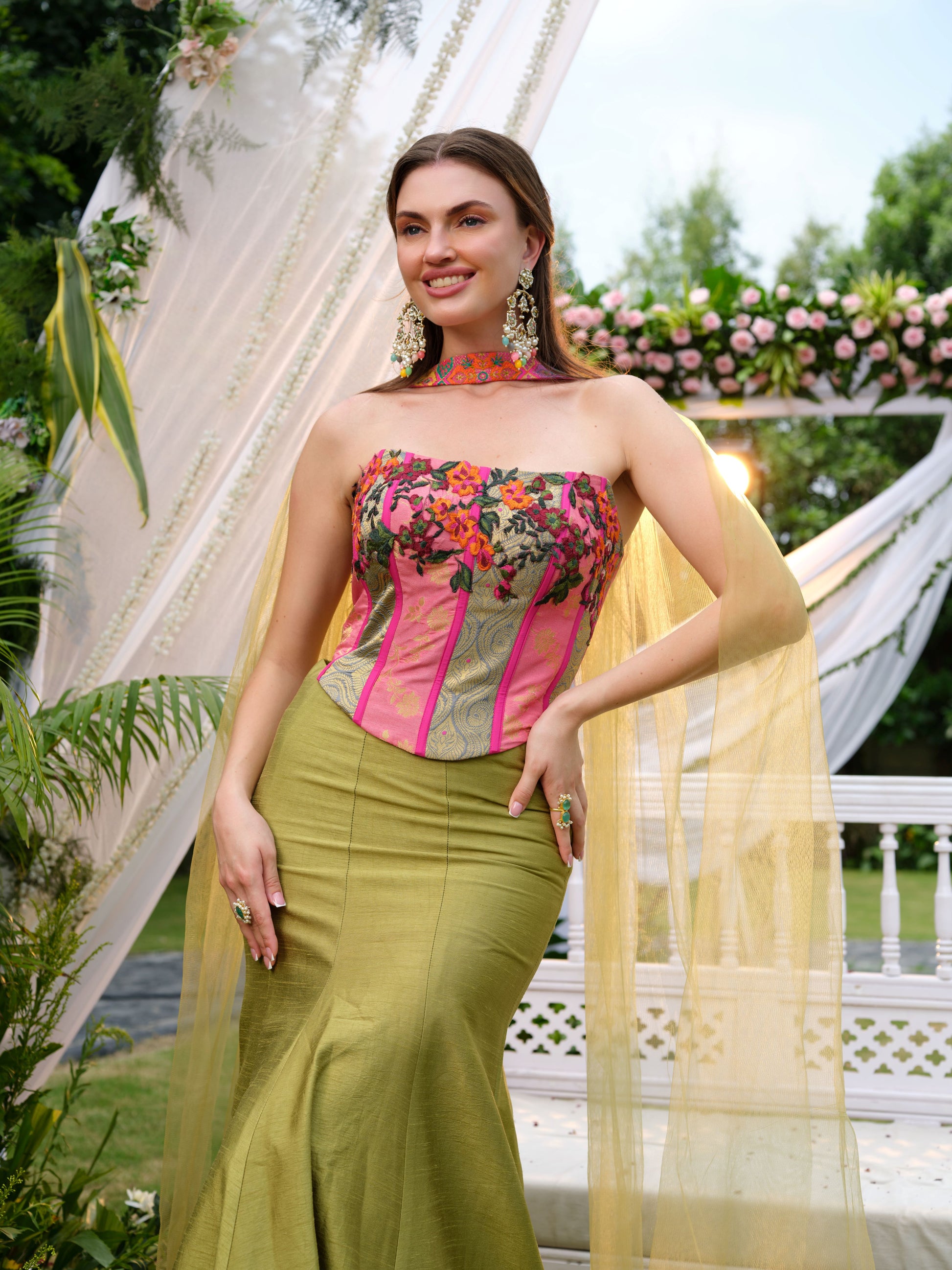 A striking fusion ensemble featuring an olive green mermaid-cut skirt paired with a bold strapless corset blouse in fuchsia pink, accentuated with vibrant floral embroidery. The structured silhouette is softened with a delicate net drape, adding a whimsical touch to this contemporary look. The matching embroidered choker detail completes the statement design.