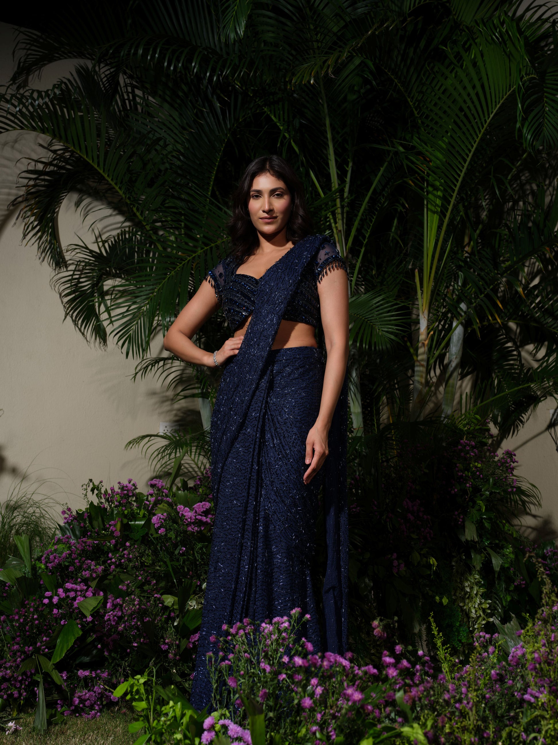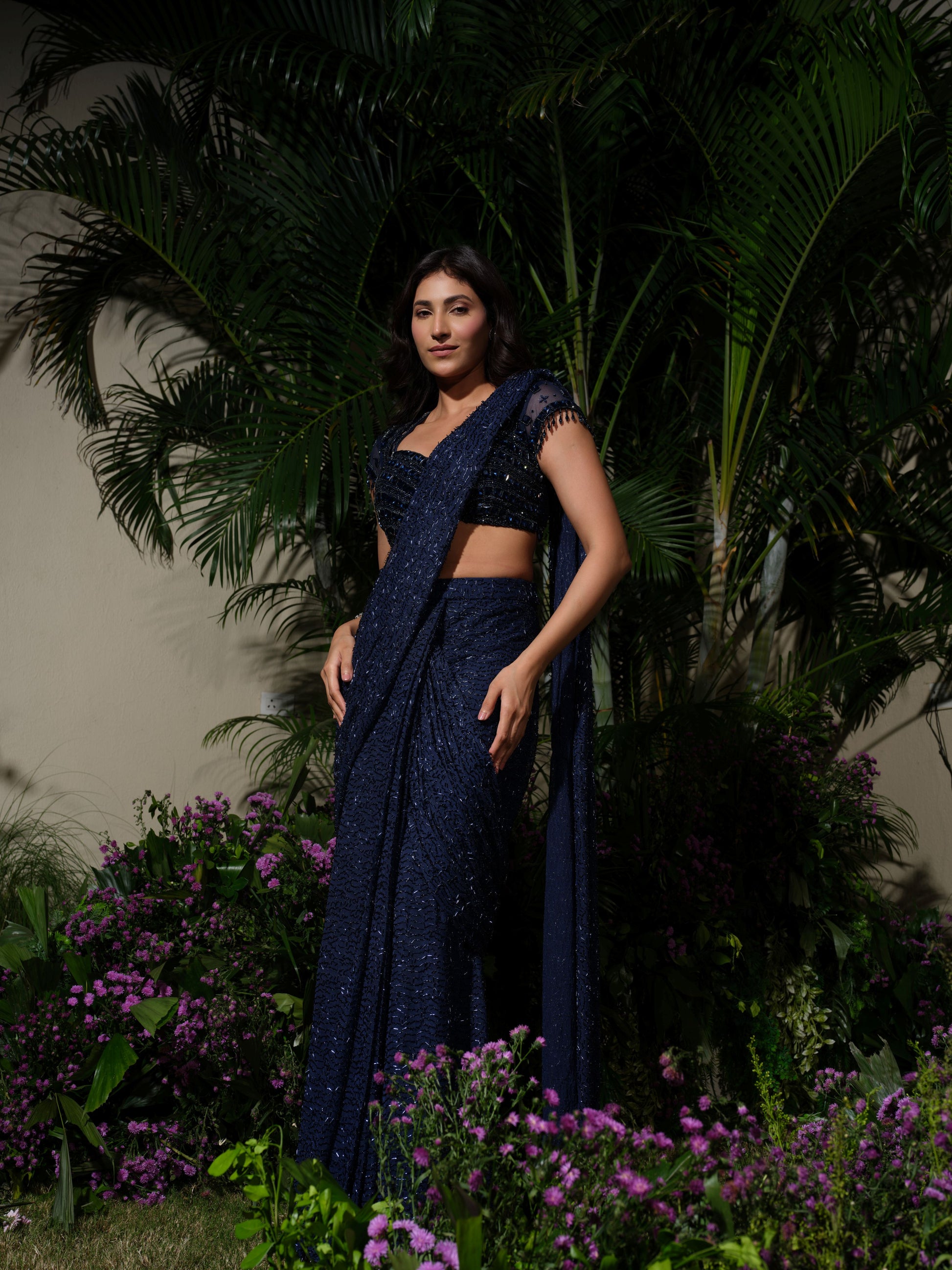 A sophisticated designer saree in deep navy blue, crafted with intricate sequin embroidery for a subtle yet striking sheen. Paired with a structured blouse featuring modern cutouts and delicate detailing on the sleeves, this ensemble beautifully merges classic draping with contemporary styling. Refined, powerful, and timelessly graceful.