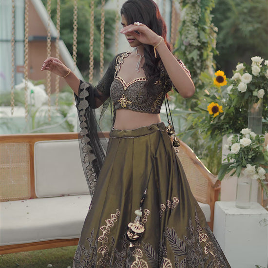 An opulent olive green lehenga set crafted in rich fabric with intricate golden embroidery. The sweetheart neckline blouse is delicately embellished with sequins and threadwork, paired with a flared lehenga featuring ornate floral and leaf-inspired motifs in shimmering gold. A sheer black dupatta with scalloped embroidered edging enhances the dramatic charm, making this outfit a true showstopper.
