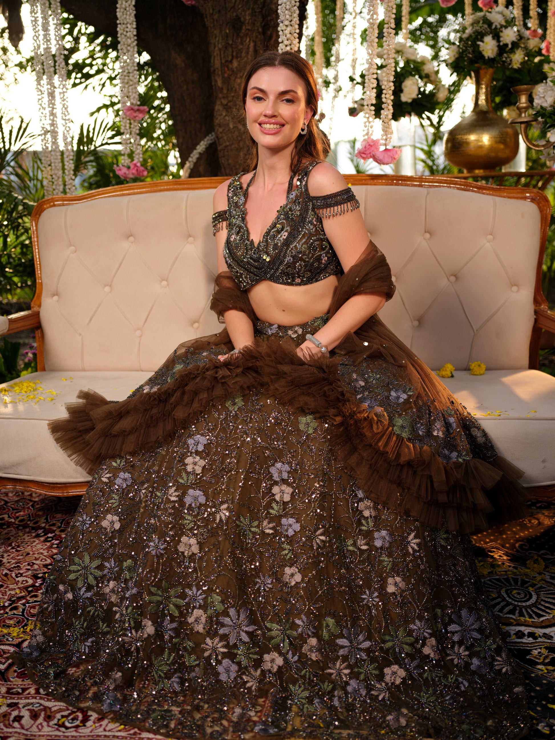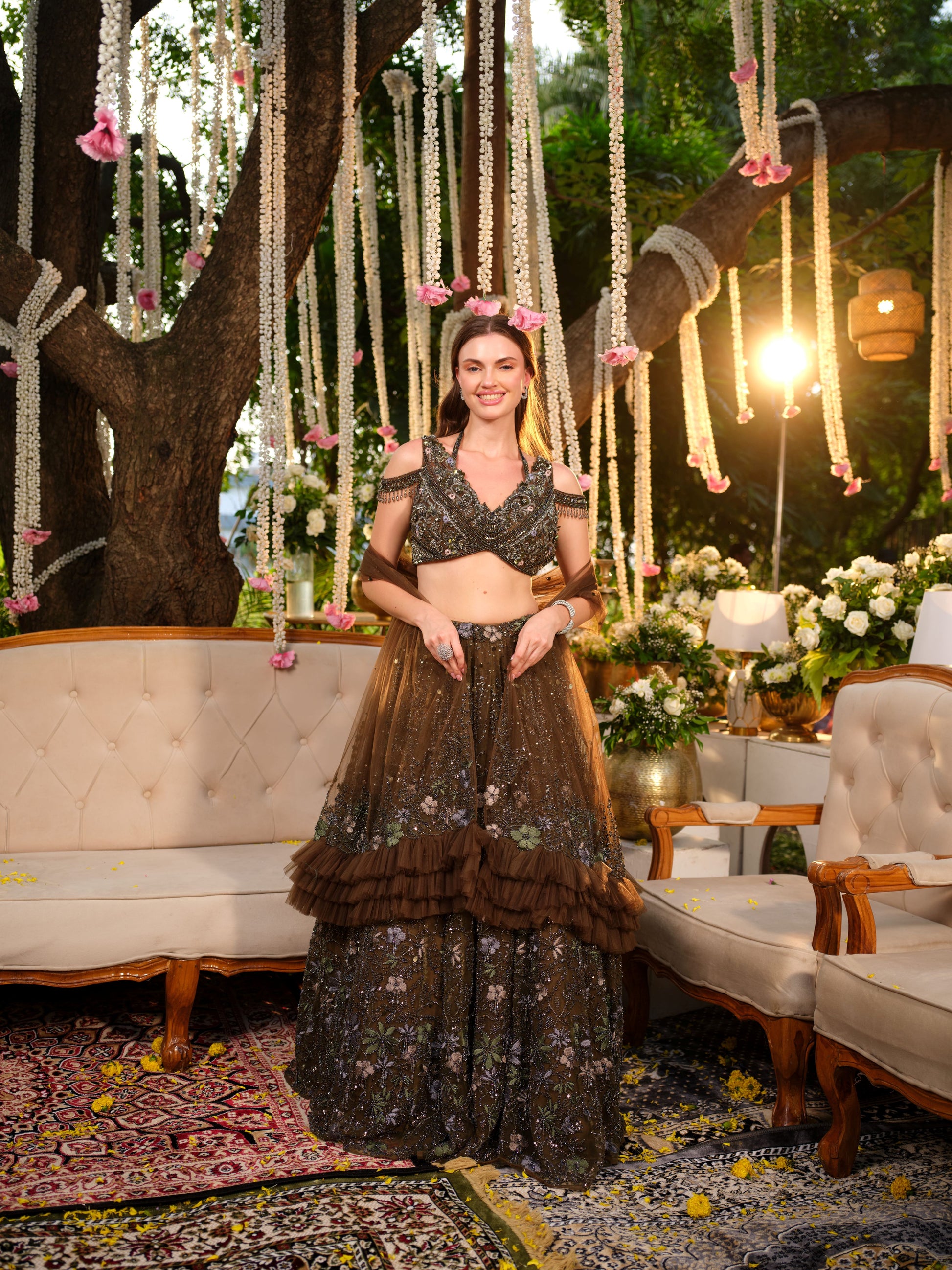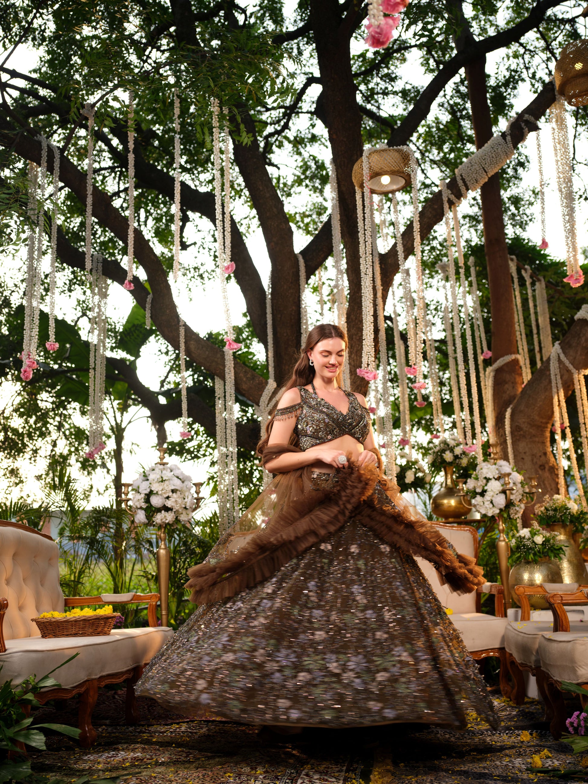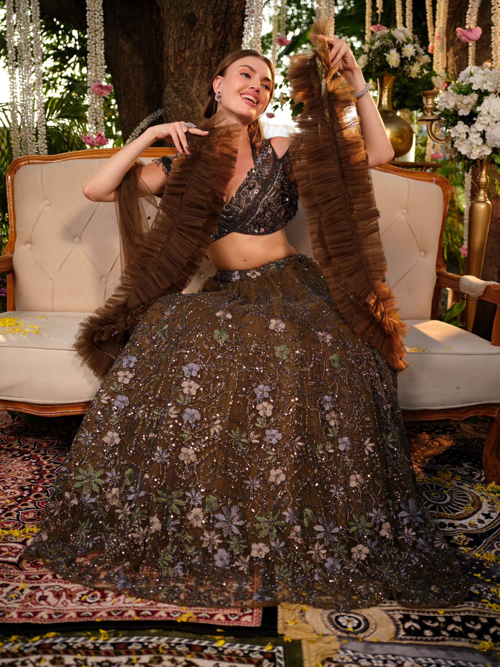A refreshing departure from the ordinary, this lehenga set exudes contemporary elegance with a touch of vintage charm. The lehenga features delicate floral embroidery with hints of shimmer, creating an enchanting play of texture and design. Paired with a stylishly cut blouse and a matching dupatta, the ensemble radiates understated glamour.