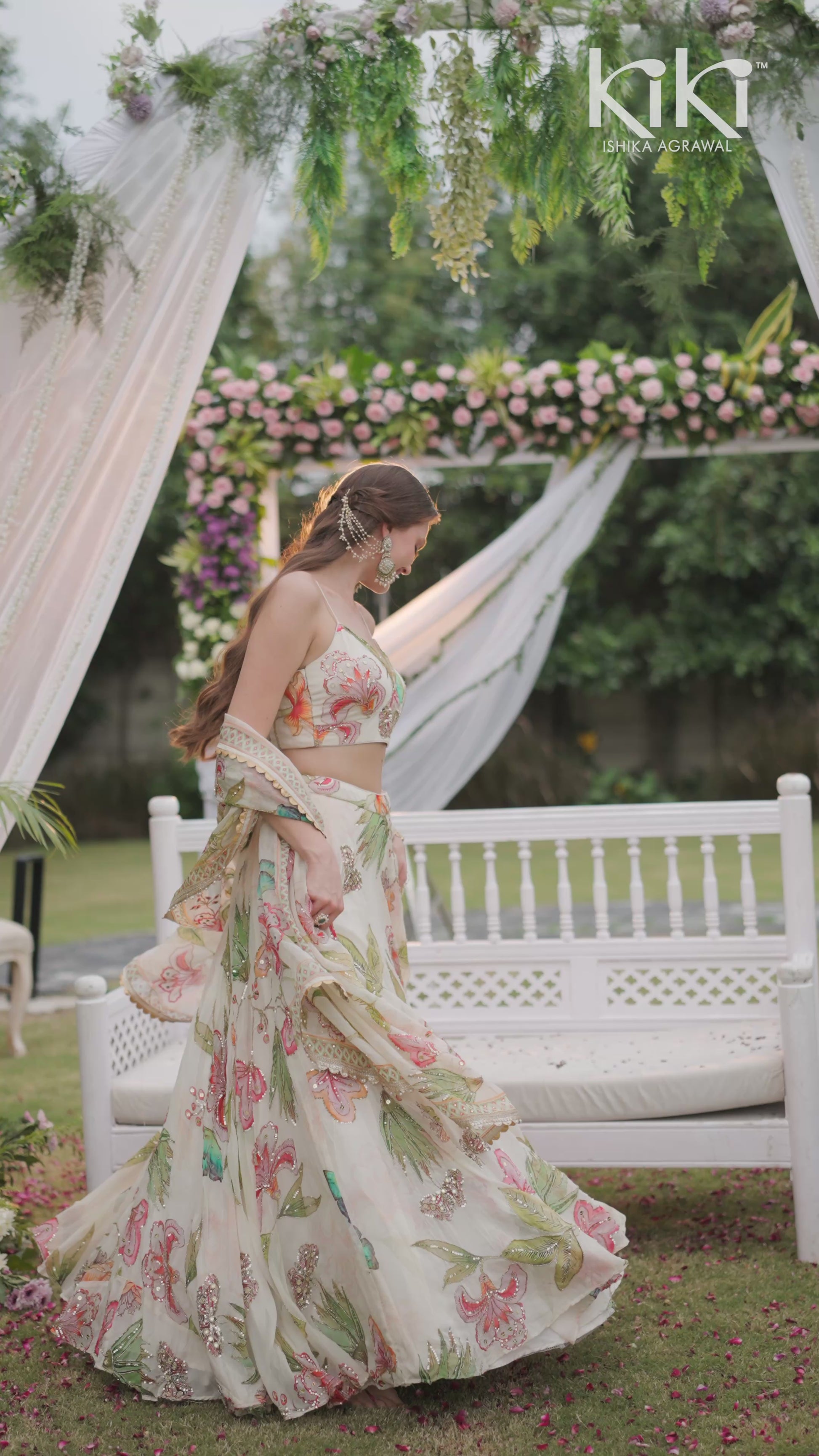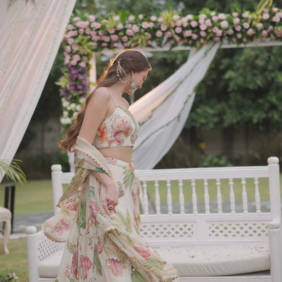 Fresh, dreamy, and effortlessly chic – this ivory floral lehenga set is a celebration of summer elegance. Adorned with vibrant multicoloured floral motifs and delicate embroidery, the lehenga flows gracefully with every step. The matching blouse, paired with a lightweight dupatta featuring a finely embroidered border, completes the look with sophistication.