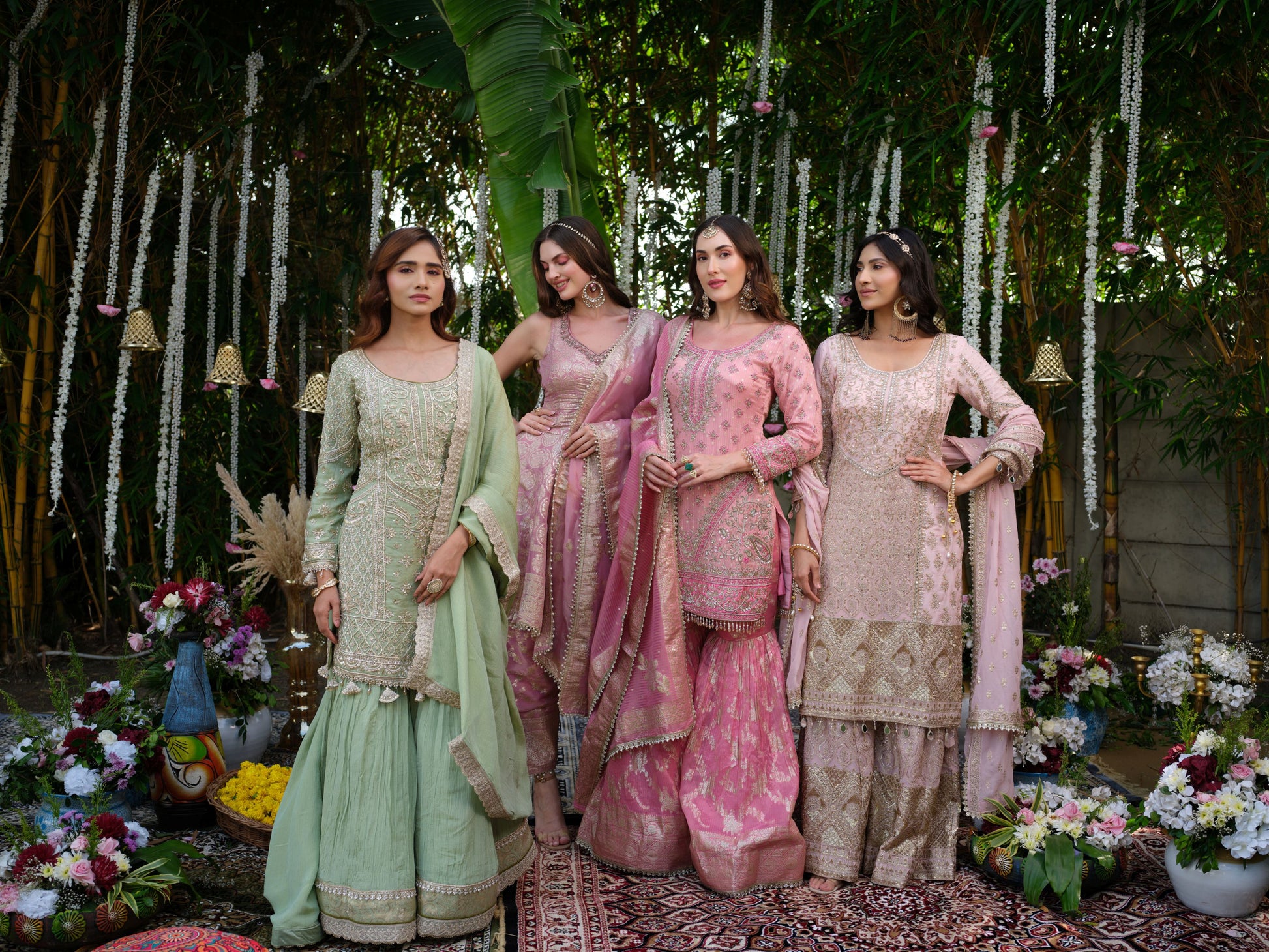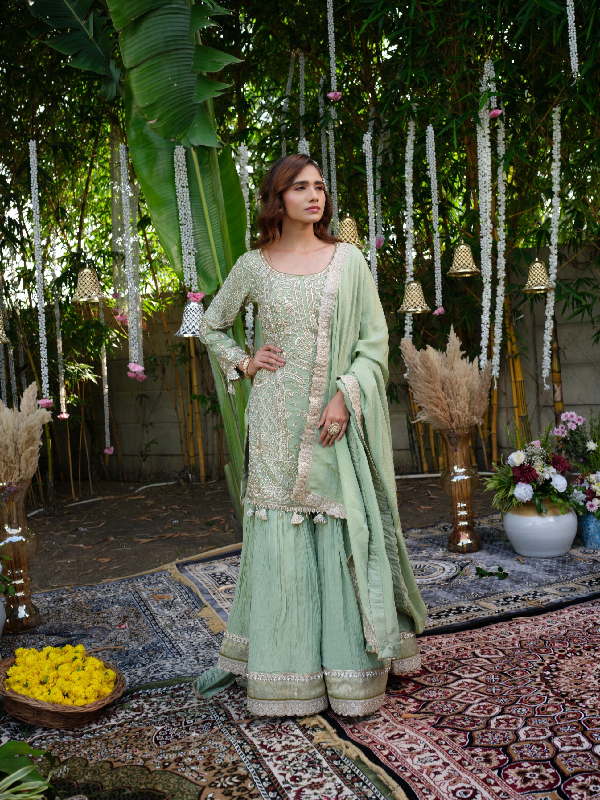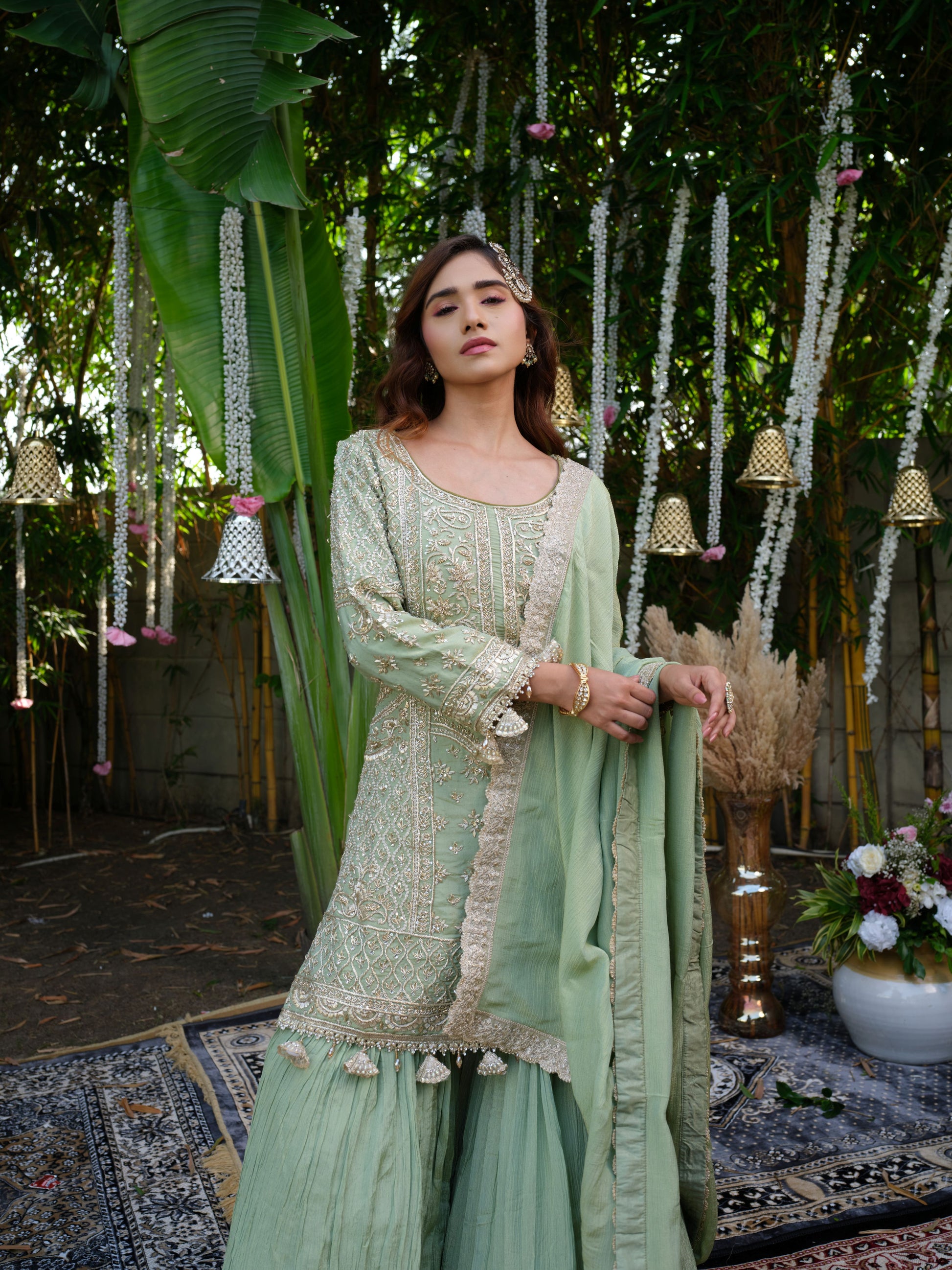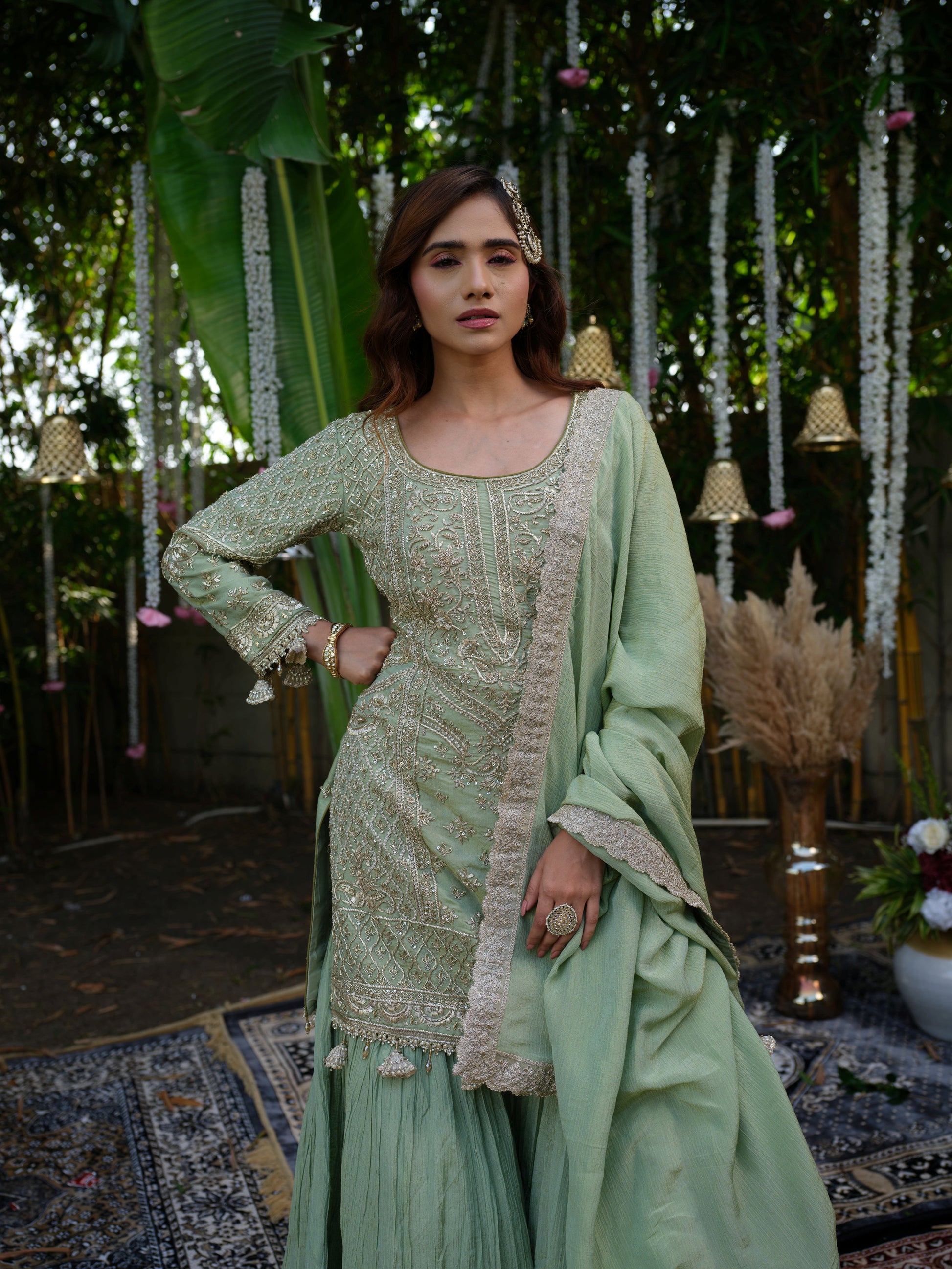 Exuding freshness and grace, this pastel mint sharara set features an intricately embroidered kurta with delicate thread and sequin detailing. Paired with voluminous sharara bottoms and a matching dupatta edged with zari borders, the look is understated yet regal. Perfect for daytime weddings, mehendi celebrations, and festive gatherings.