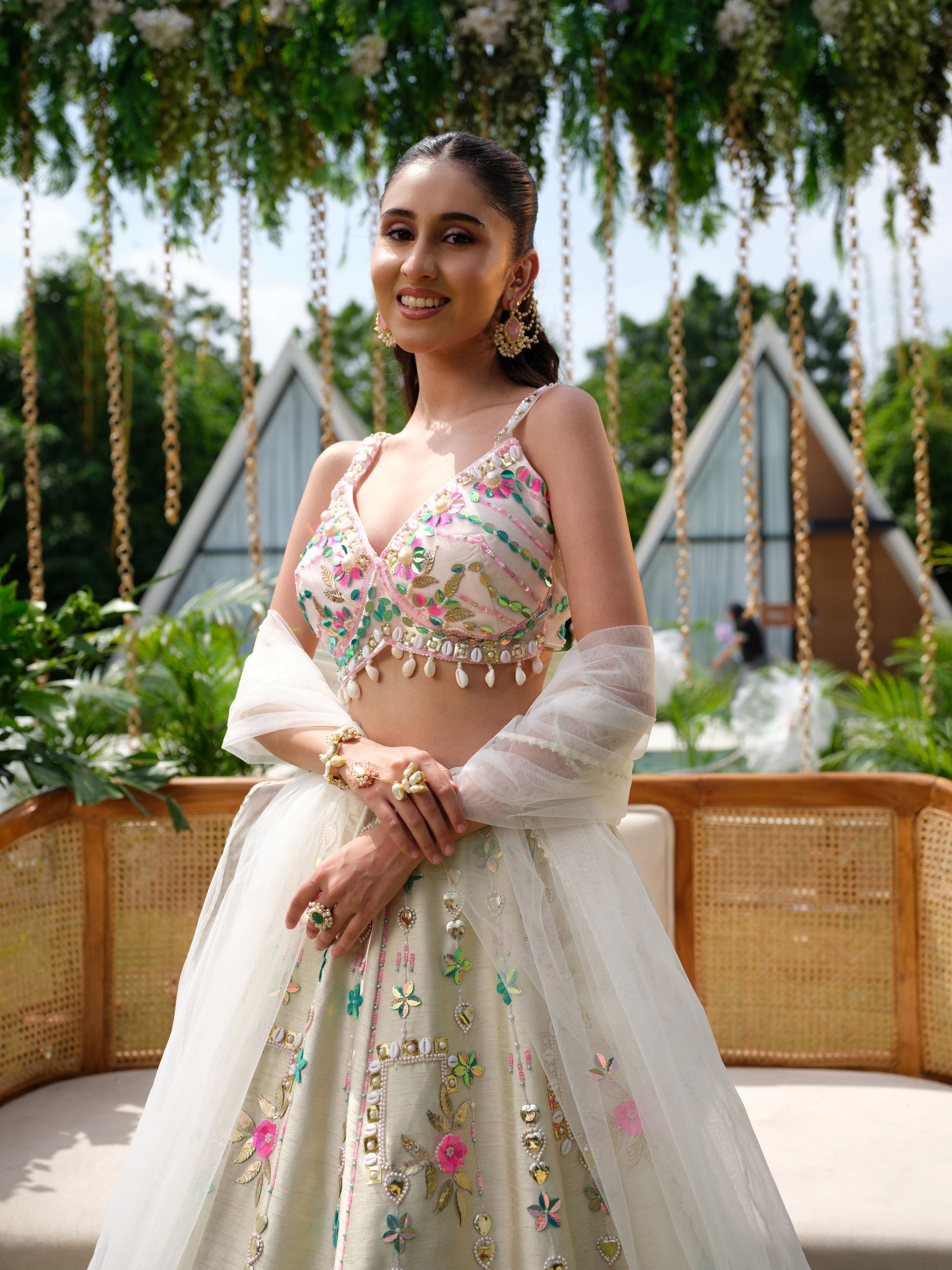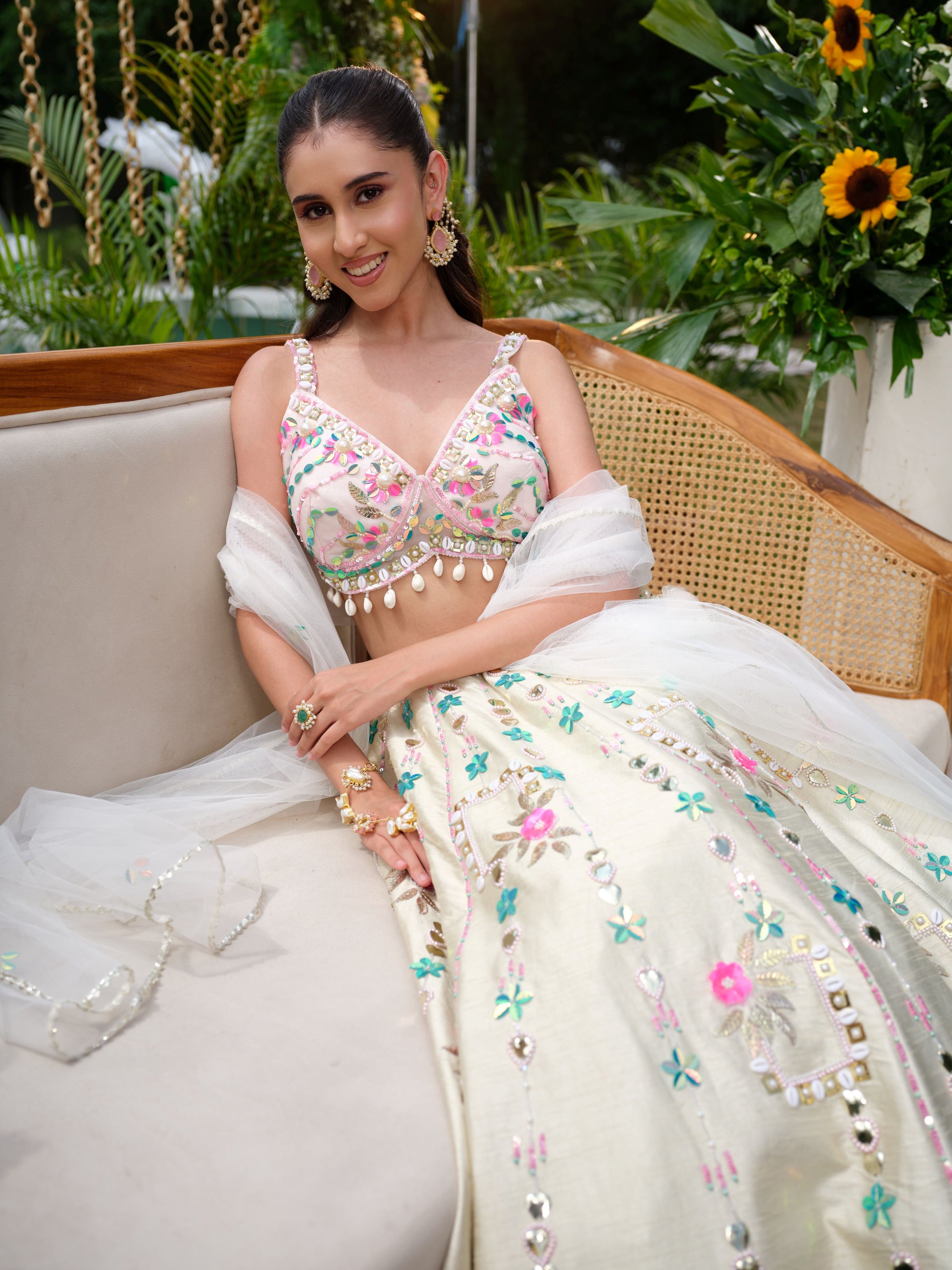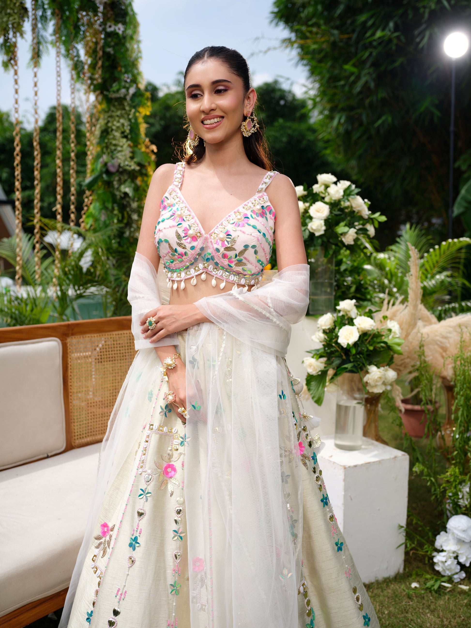 A delicate ivory lehenga adorned with vibrant floral embroidery in shades of pink, green, and aqua. The strappy blouse is intricately detailed with mirror work and bead highlights, paired with a flowing skirt featuring bold floral motifs along the hemline. Completed with a sheer ivory dupatta embellished with subtle sequins, this ensemble is fresh, youthful, and radiant.