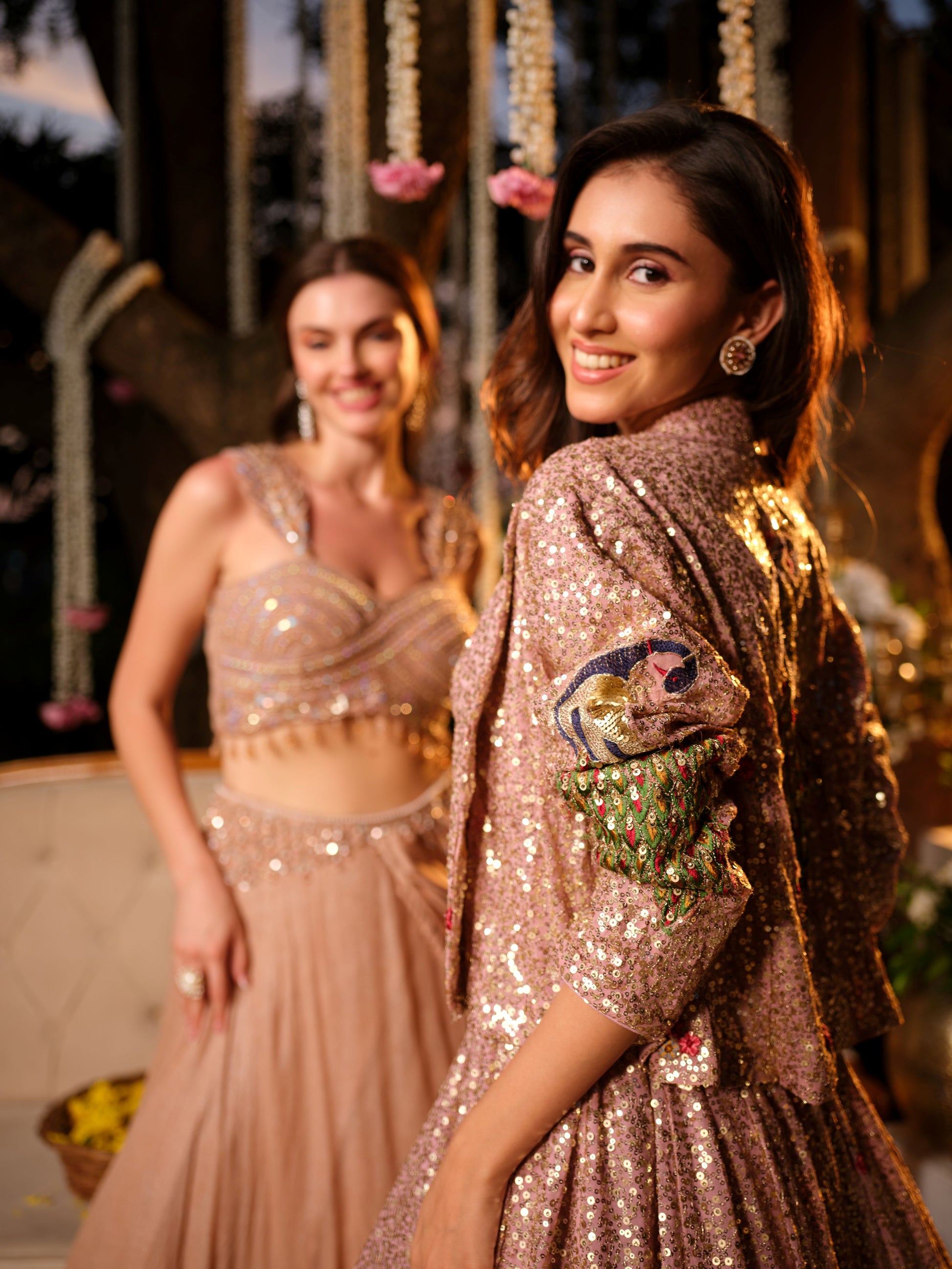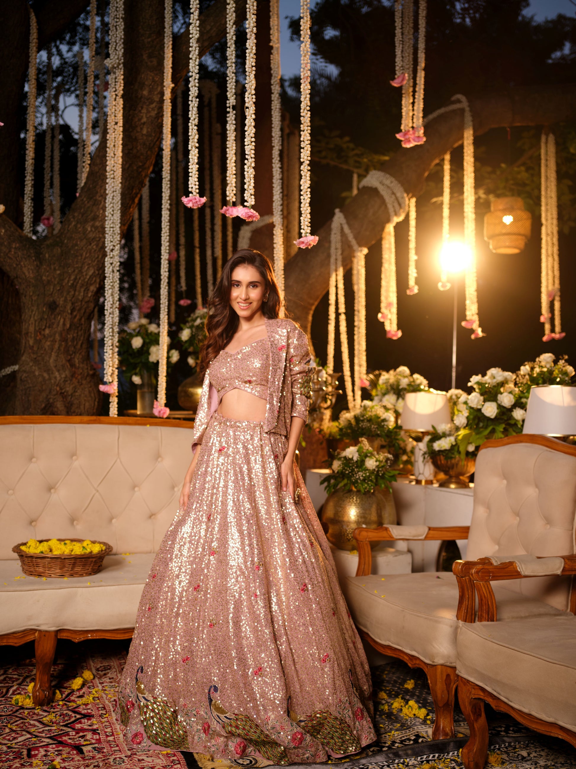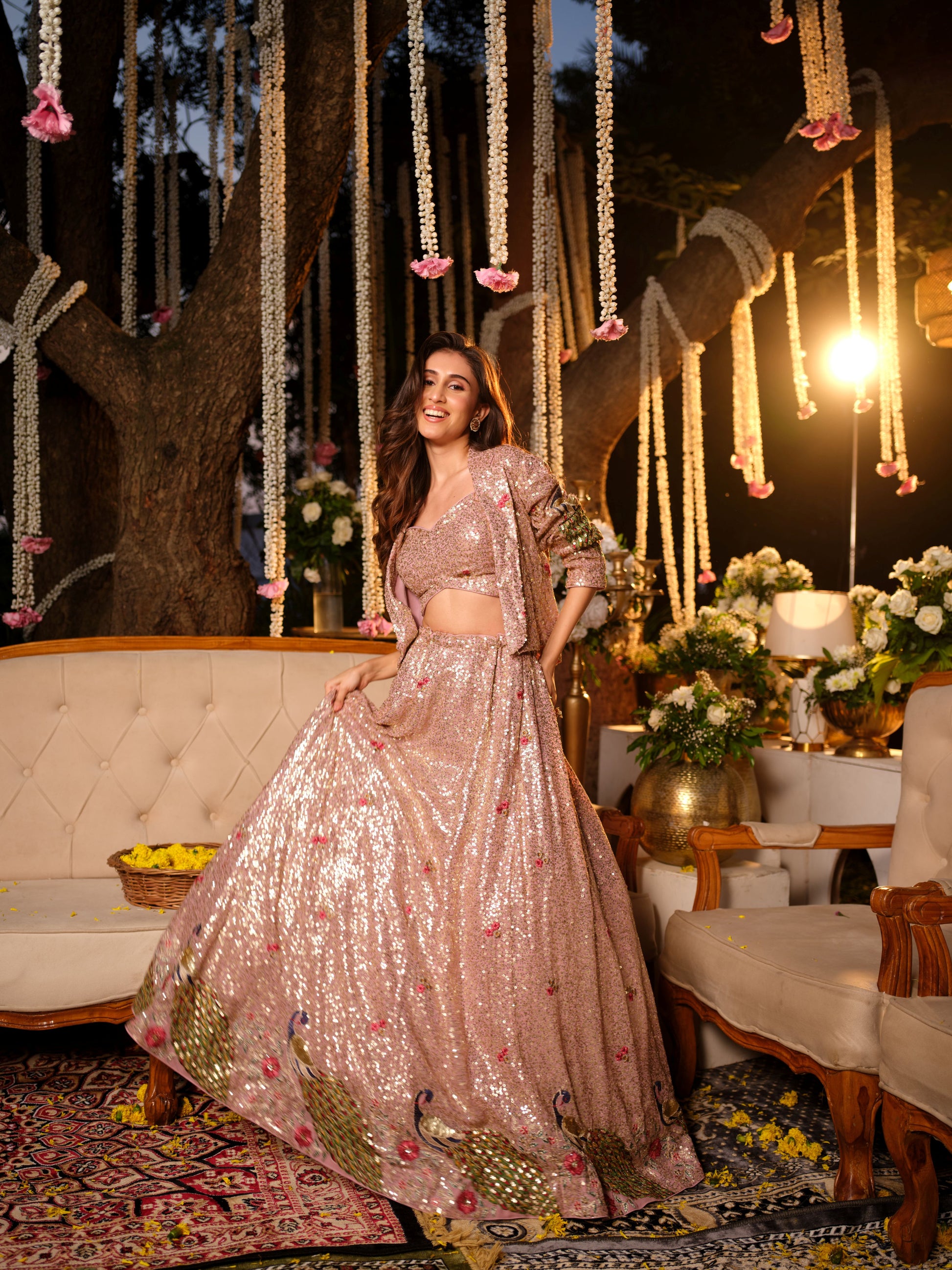 A dazzling blush pink lehenga set drenched in sequins, designed to make a statement. The blouse and flared skirt shimmer with all-over embellishments, while delicate floral embroidery and peacock motifs at the hemline add a touch of artistry. Paired with a matching embellished jacket for a modern twist, this ensemble blends tradition with contemporary glamour effortlessly.