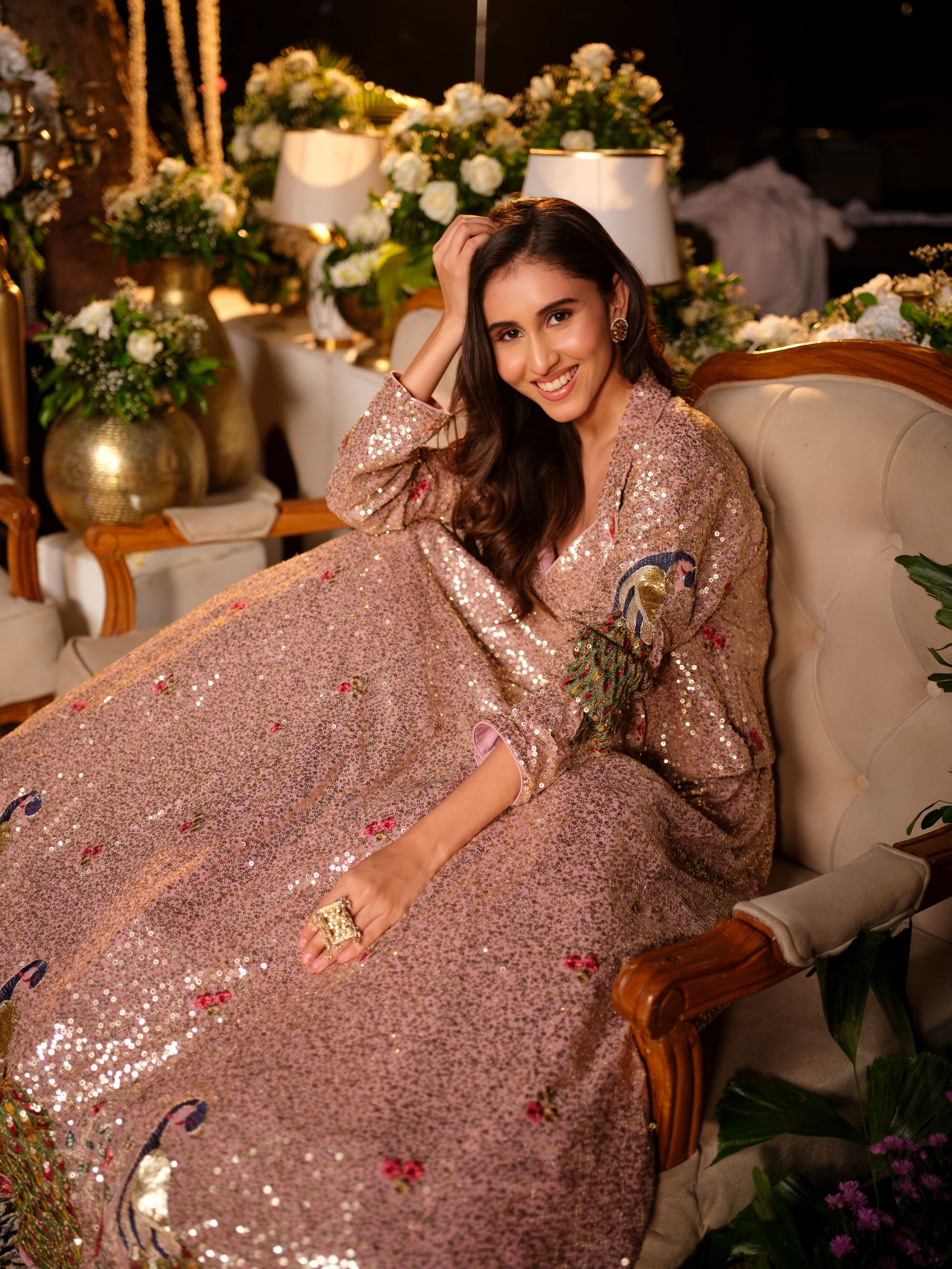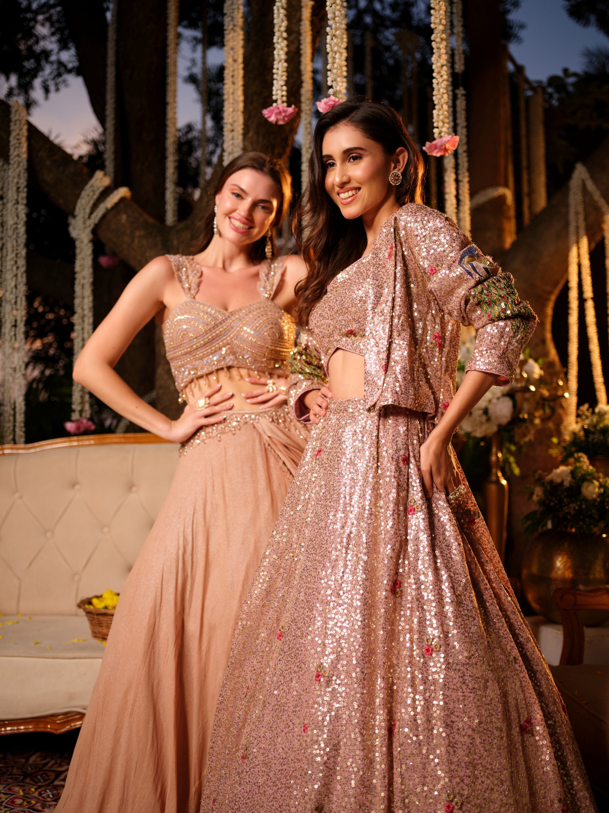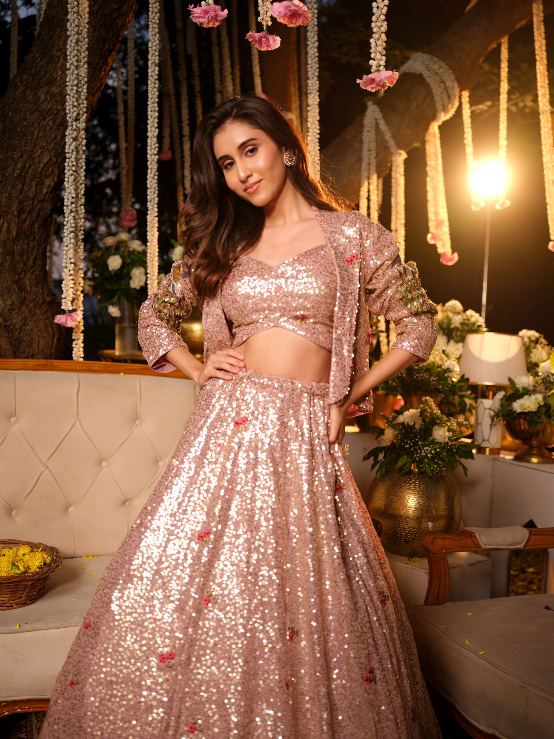 A dazzling blush pink lehenga set drenched in sequins, designed to make a statement. The blouse and flared skirt shimmer with all-over embellishments, while delicate floral embroidery and peacock motifs at the hemline add a touch of artistry. Paired with a matching embellished jacket for a modern twist, this ensemble blends tradition with contemporary glamour effortlessly.