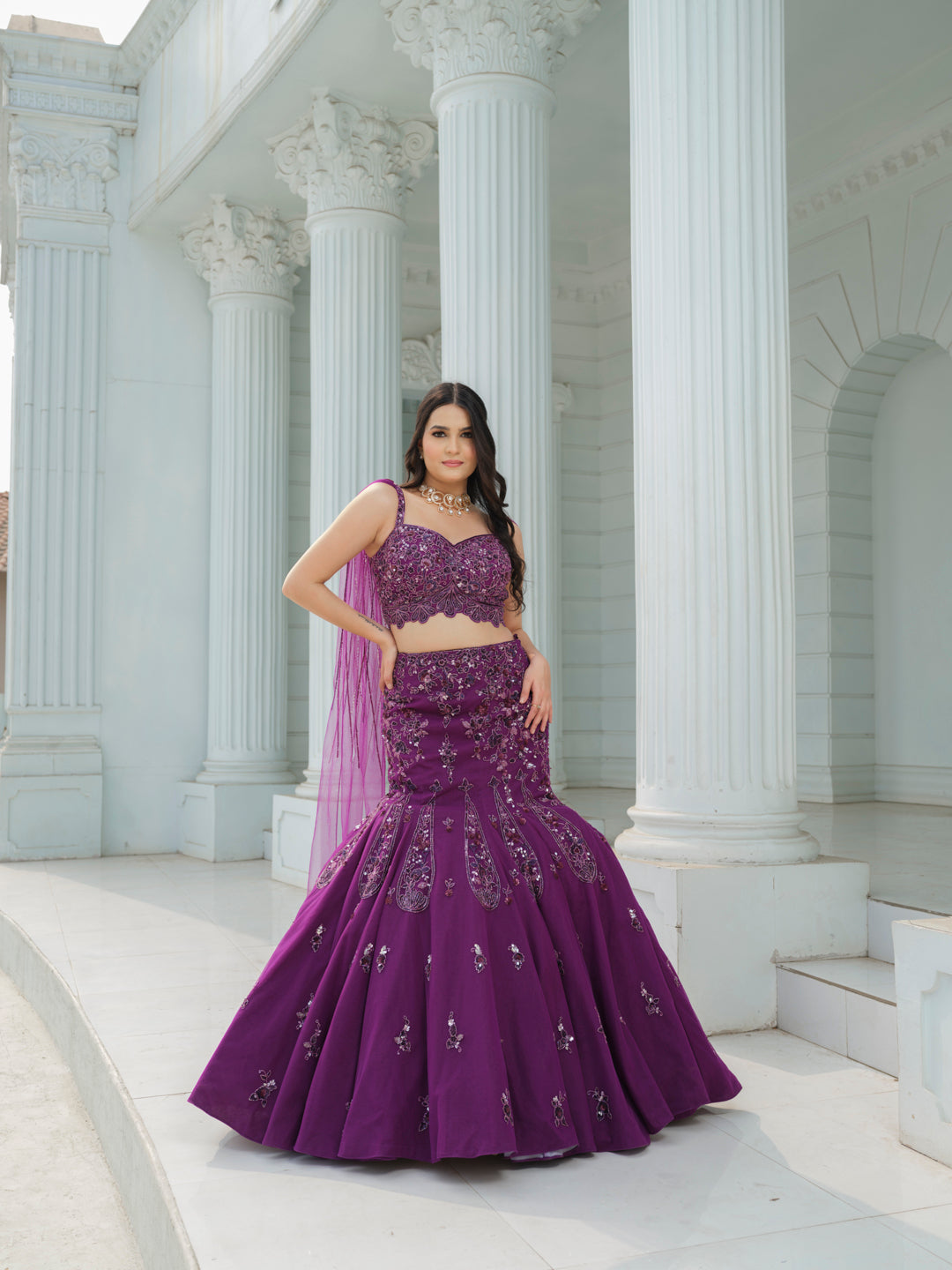 A rich and elegant purple lehenga, designed to make a statement. Perfect for weddings or festive occasions, it offers a timeless look with a touch of modern sophistication.