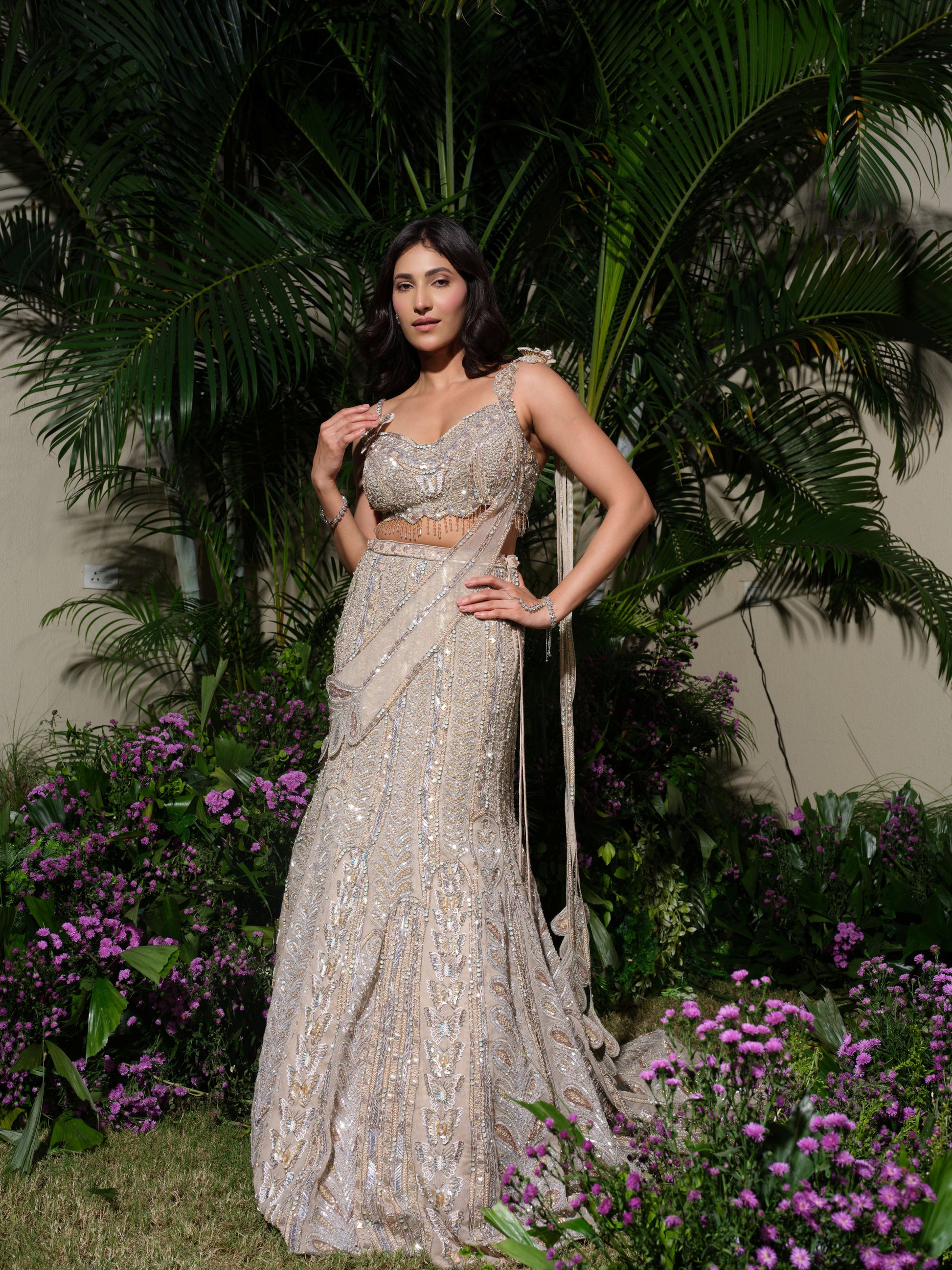 A luxurious lehenga set in champagne gold, richly adorned with sequins, intricate threadwork, and bead embellishments. The blouse features delicate detailing with tassel accents on the straps, paired with a flowy lehenga skirt and a matching dupatta that enhances the regal elegance.