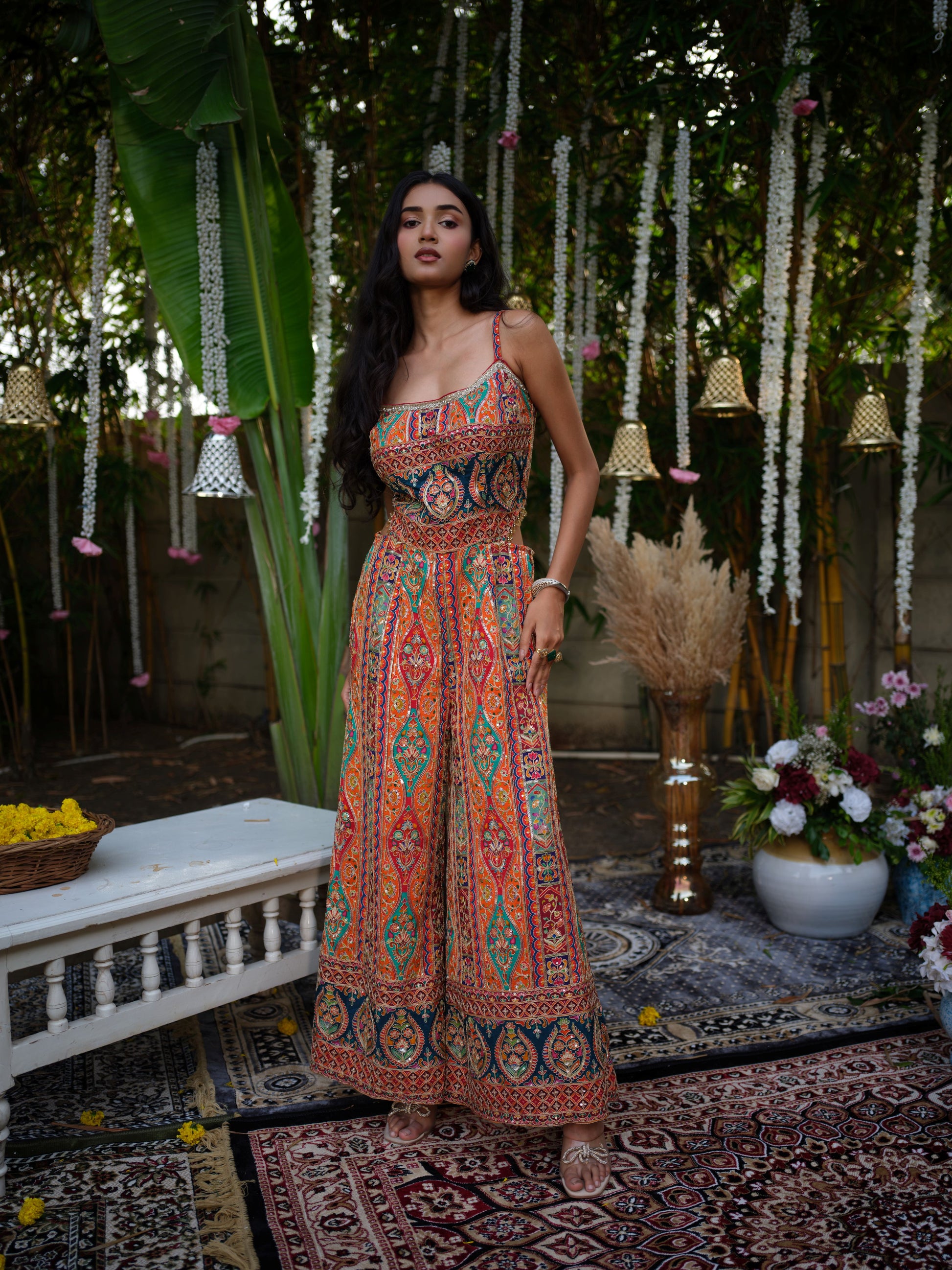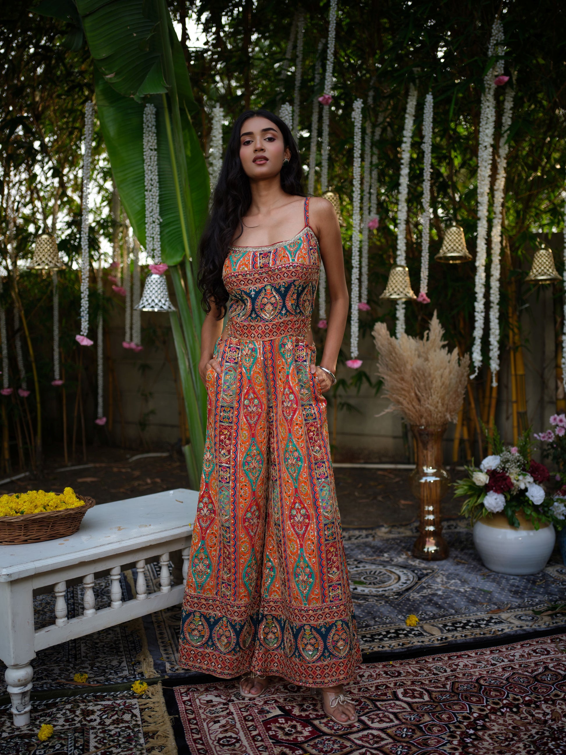 This bohemian-inspired printed jumpsuit is a perfect mix of comfort and style. Featuring delicate spaghetti straps, a fitted bodice, and a wide-legged flowy silhouette, the outfit highlights intricate ethnic motifs in a tapestry of festive hues. The detailed patterns lend it a handcrafted charm, making it an eye-catching statement piece.