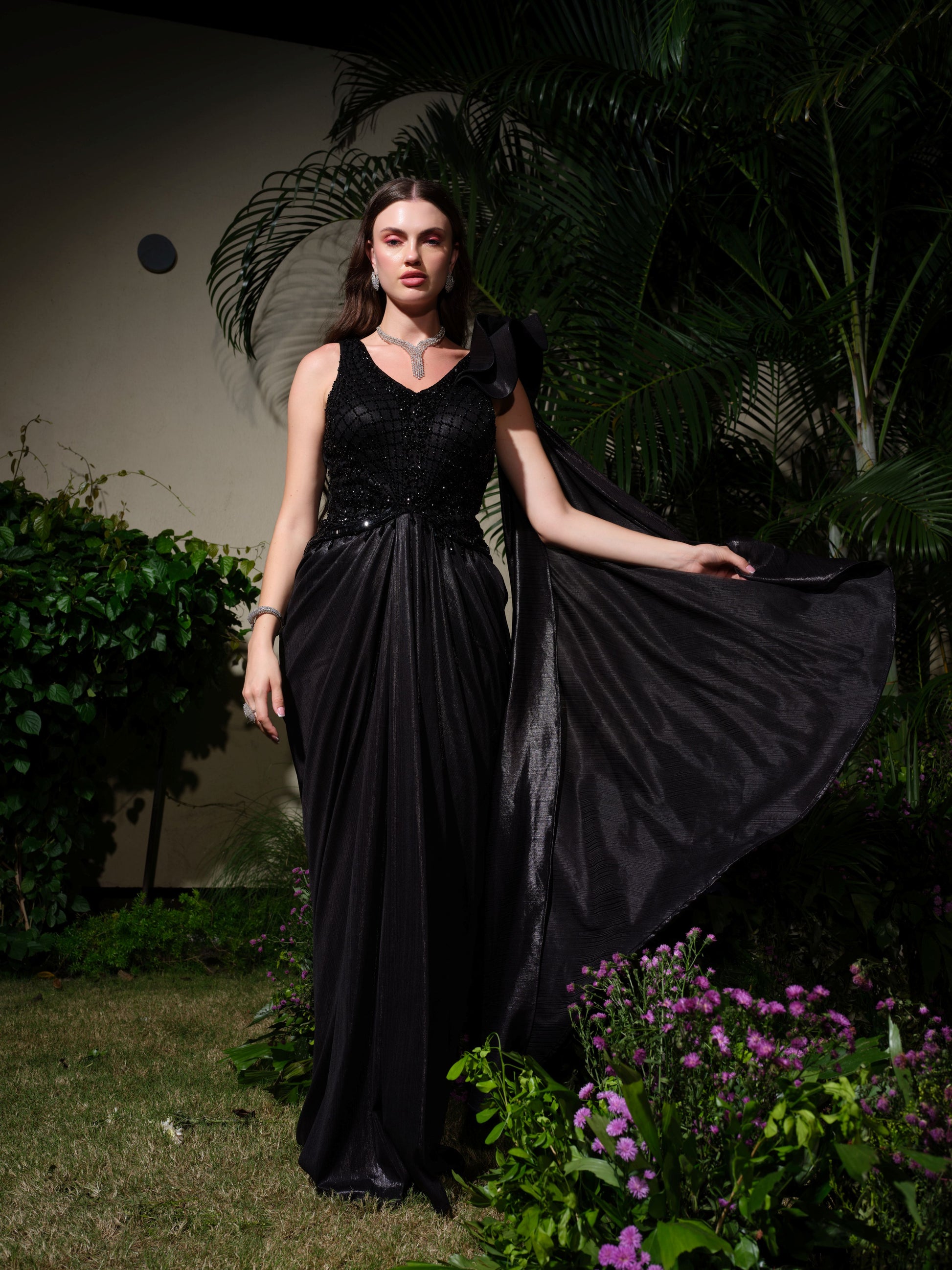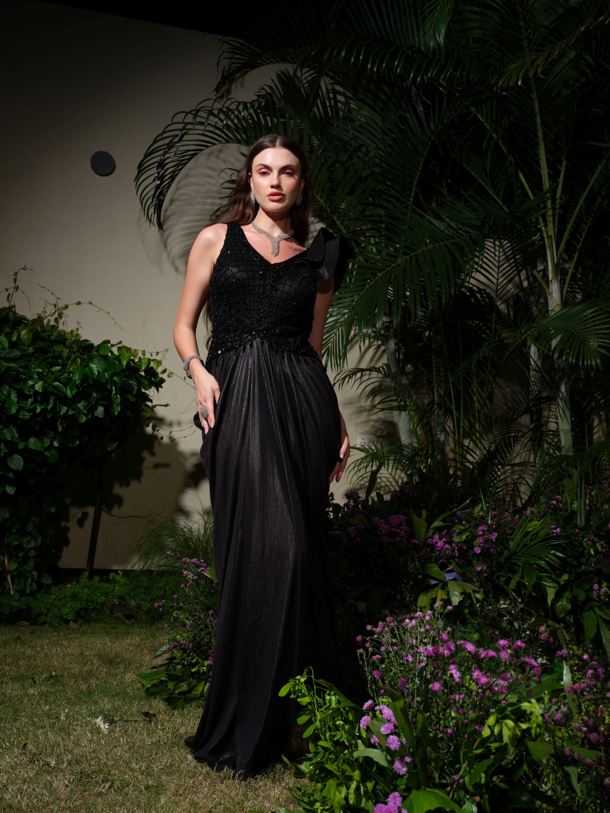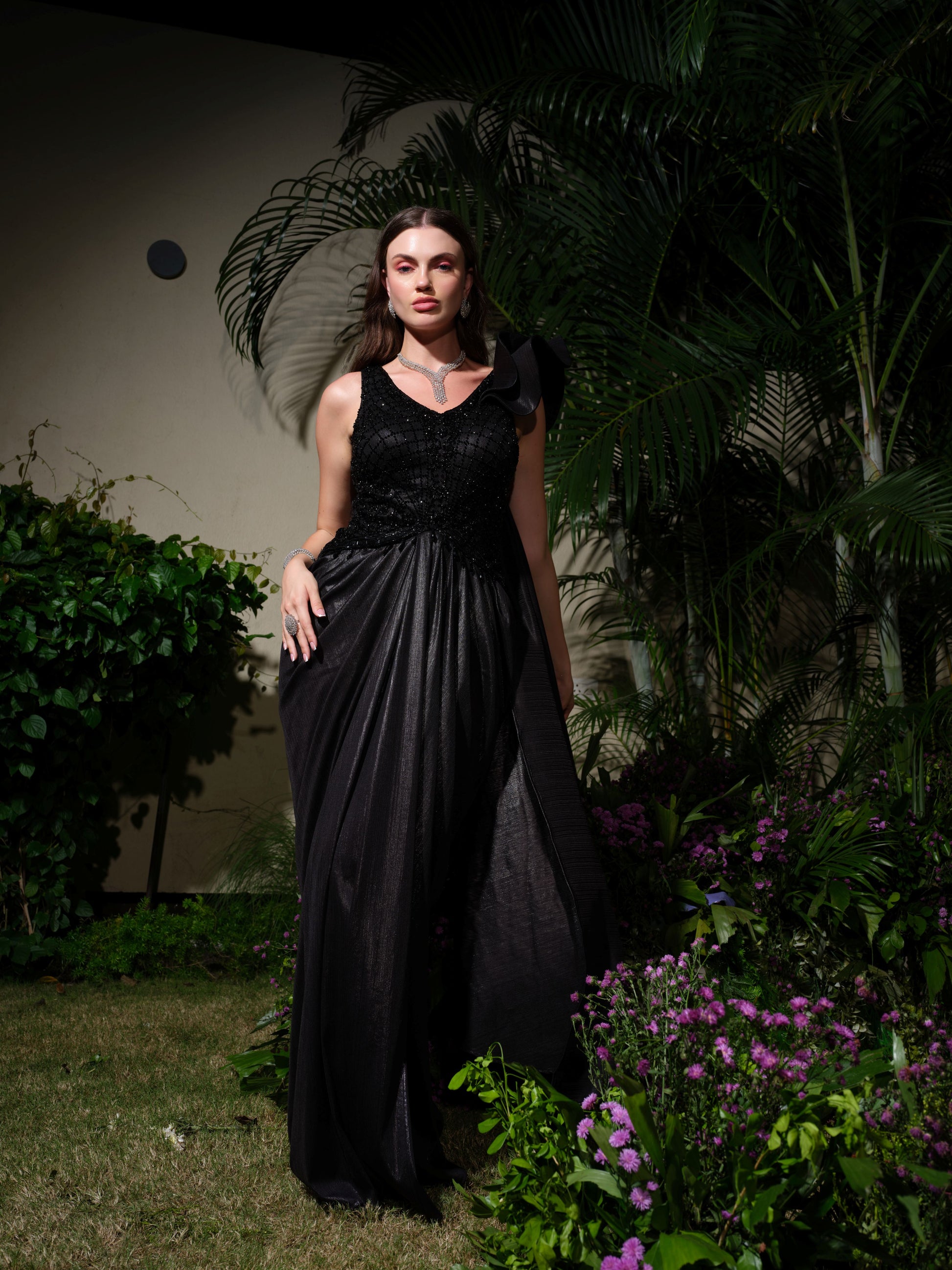 A dramatic black evening gown featuring a sleeveless, sequin-embellished bodice paired with a flowy, metallic-textured skirt. The gown stands out with its statement draped panel cascading from one shoulder, adding volume and a regal flair. The blend of structured top and fluid bottom creates a striking balance of sophistication and drama.