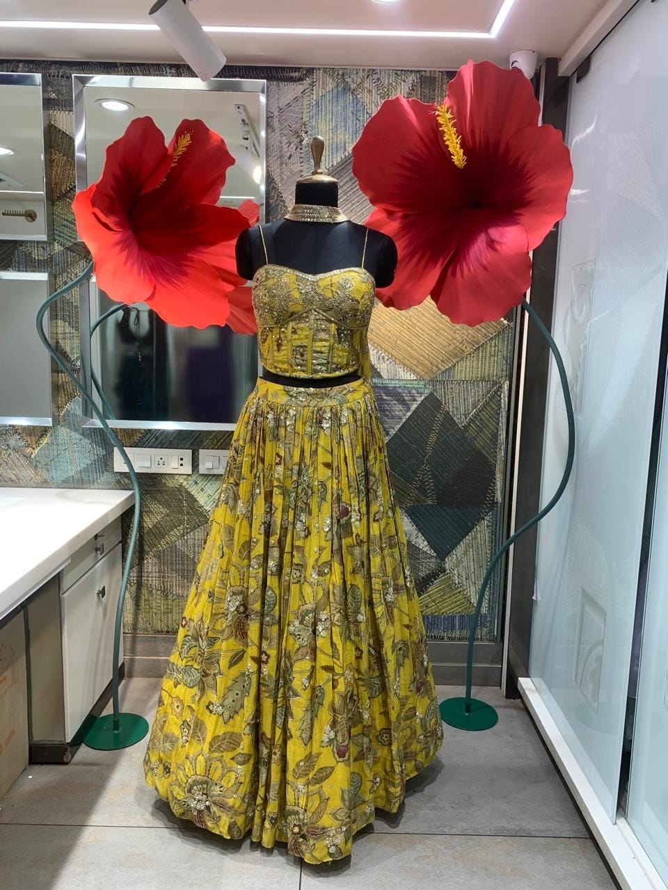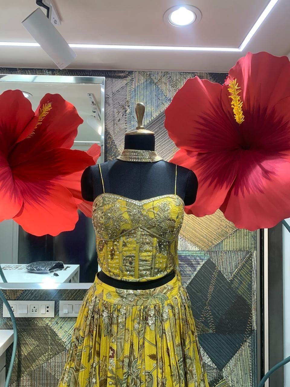 A vibrant celebration of color and charm, this mustard yellow lehenga set brings together effortless style and festive elegance. The strappy blouse paired with a flowy printed skirt creates a youthful yet graceful silhouette, perfect for mehendi, haldi, or intimate celebrations. Detailed with delicate floral-inspired prints, it radiates a fresh and lively vibe, making it an instant head-turner.