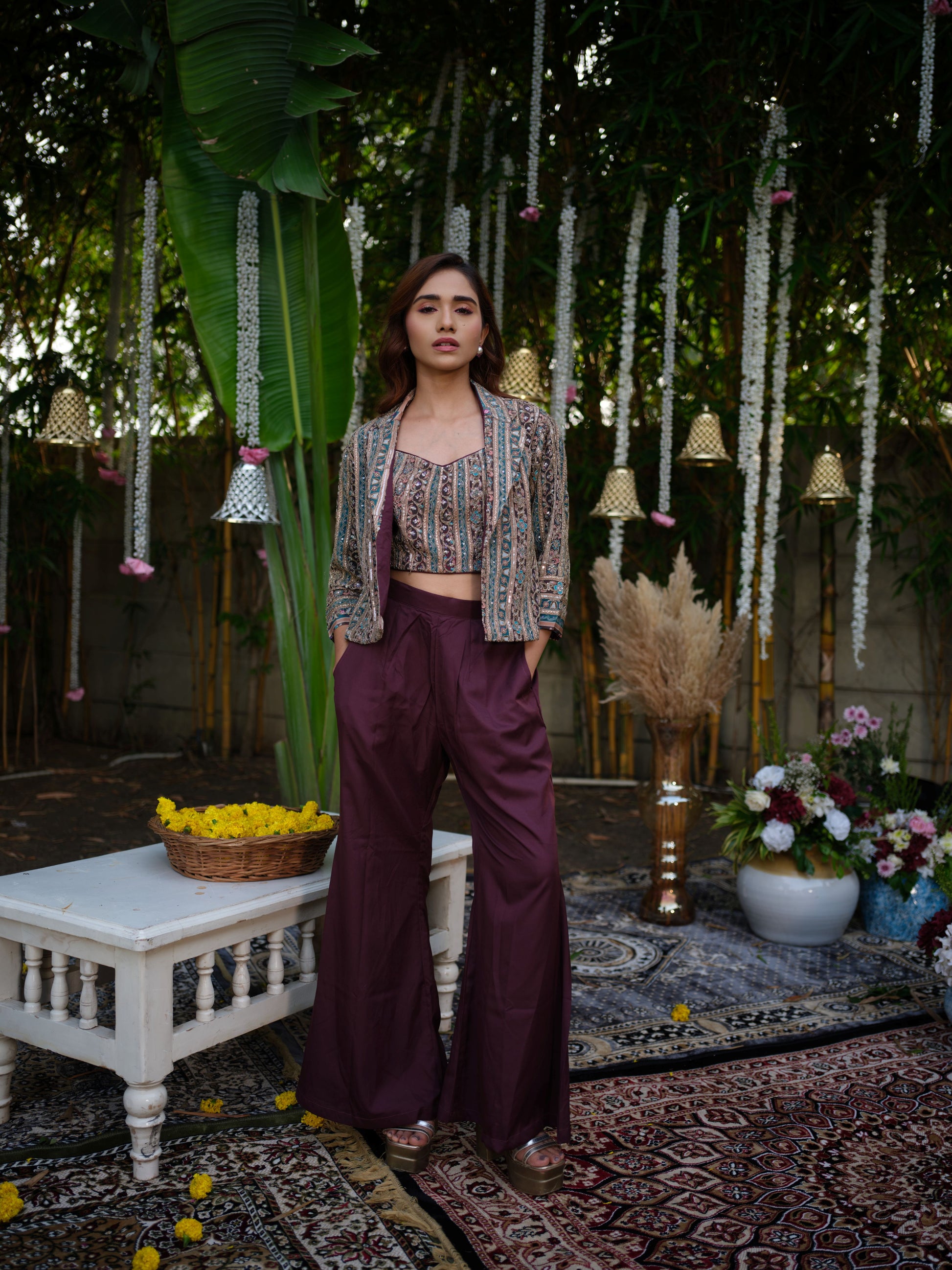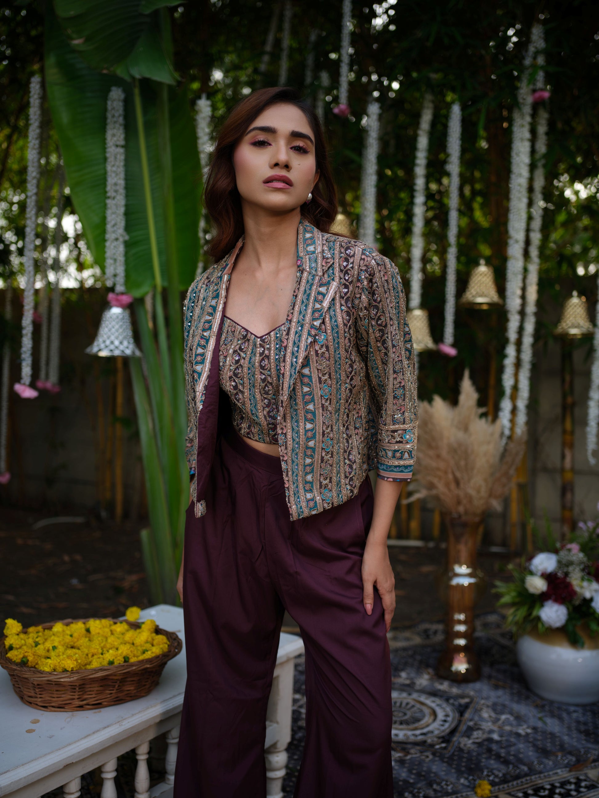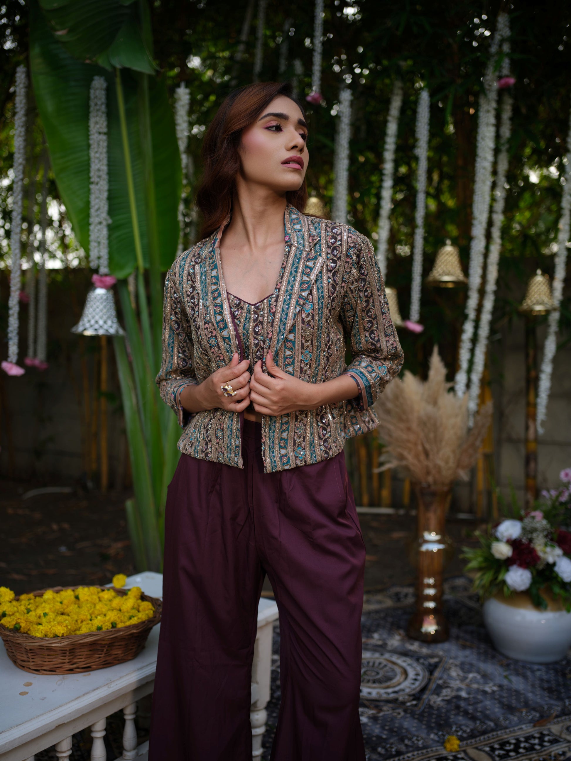 A modern festive co-ord set that blends comfort with high fashion. The embellished crop top and matching open jacket are intricately detailed with sequins and threadwork, adding sparkle and texture. Paired with flowy wine-hued palazzo pants, the ensemble balances structure with ease, making it a versatile choice for day-to-night celebrations. Stylish yet effortless, it redefines contemporary ethnic dressing.