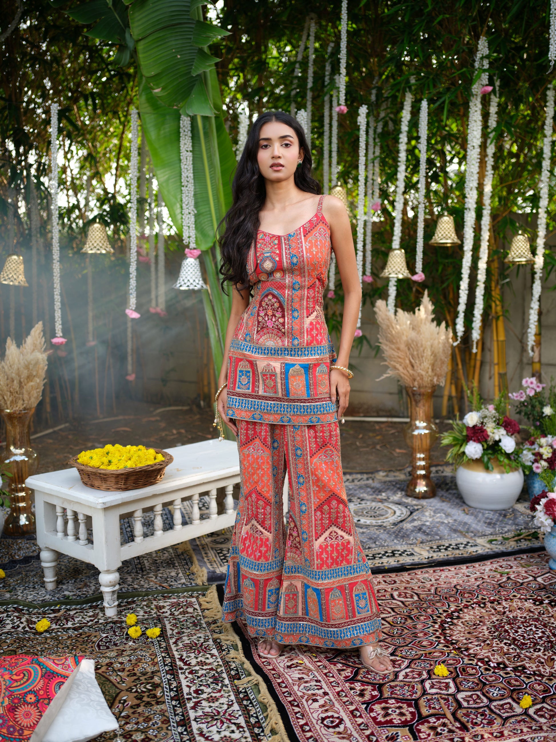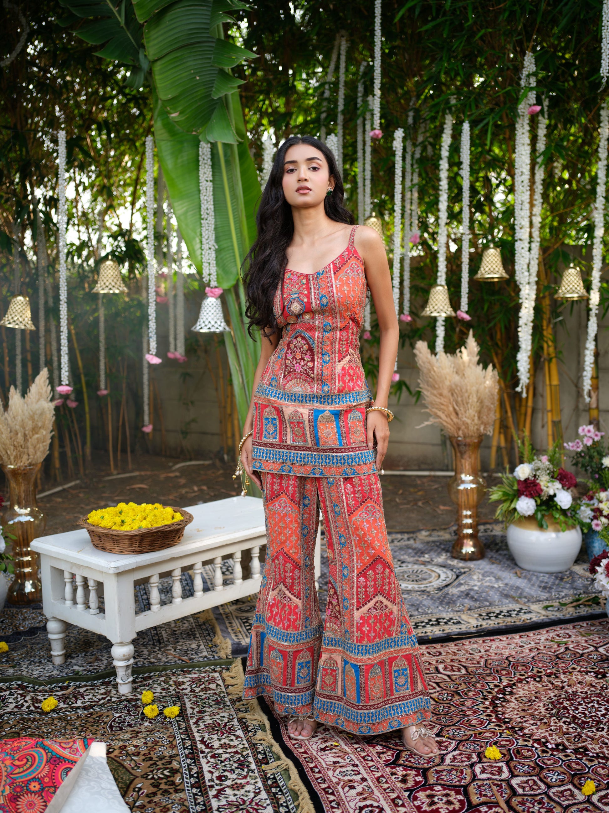 Bold and eclectic, this co-ord set features a fitted strappy tunic paired with wide-legged trousers, both showcasing intricate folk-inspired prints in warm rust tones with pops of blue. The contemporary silhouette combined with traditional artistry makes it a statement ensemble, perfect for mehendi brunches, festive evenings, or destination celebrations.